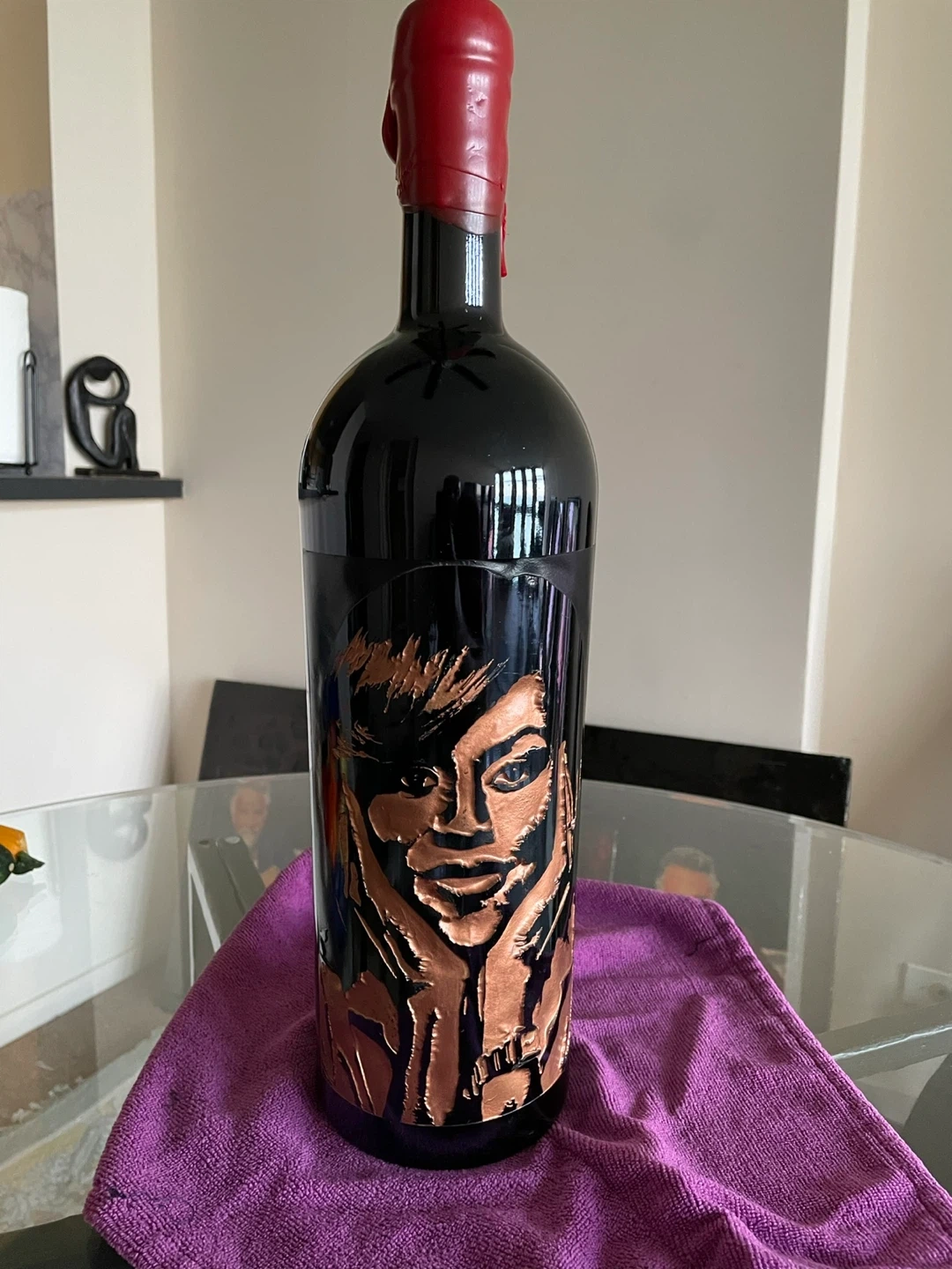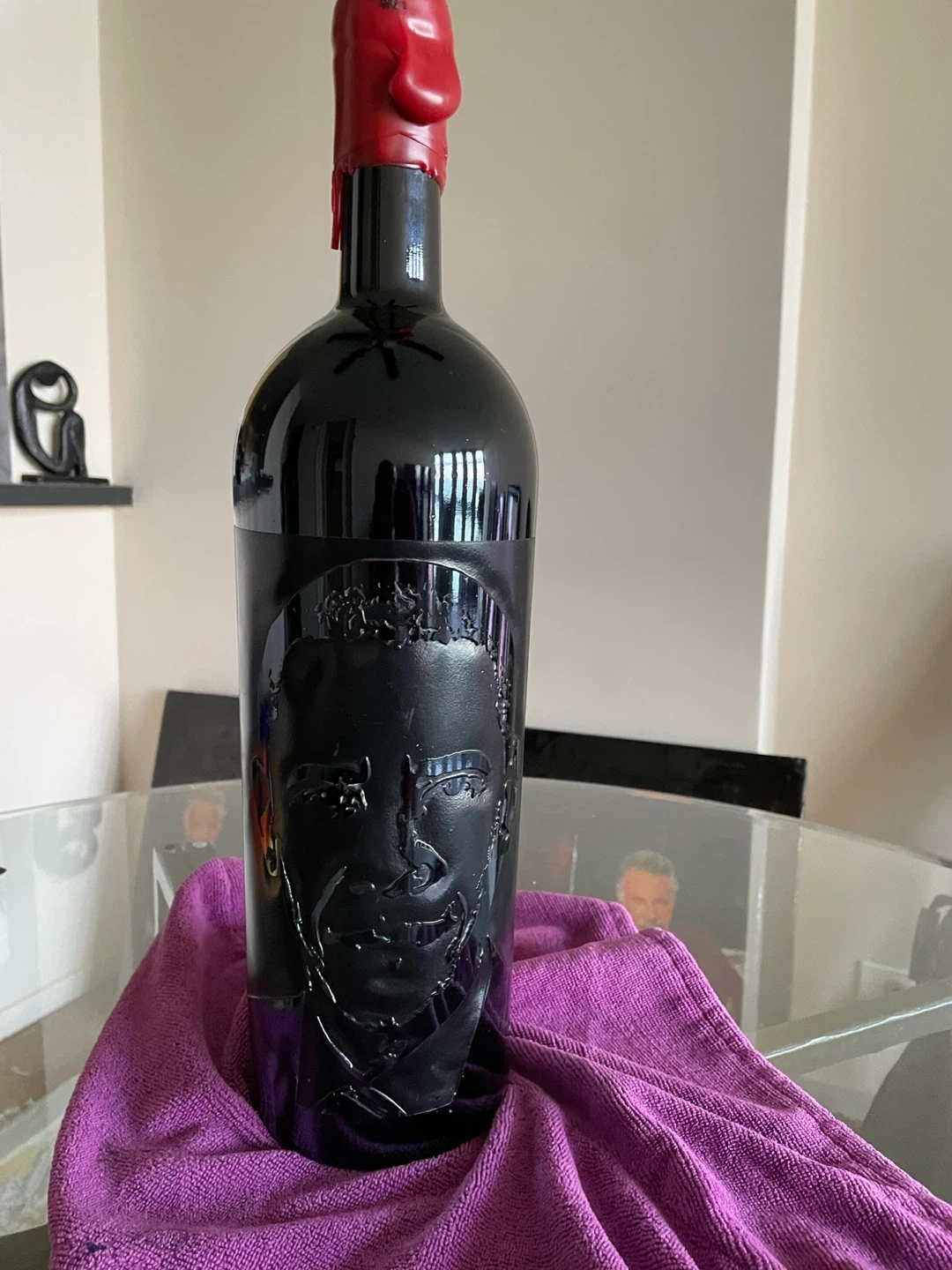 Sealed in hand-poured red wax, the bottle contains a California Bordeaux blend, merging the craftsmanship of winemaking with the creativity of sculptural art. Each piece is individually created, ensuring uniqueness and collectible value.