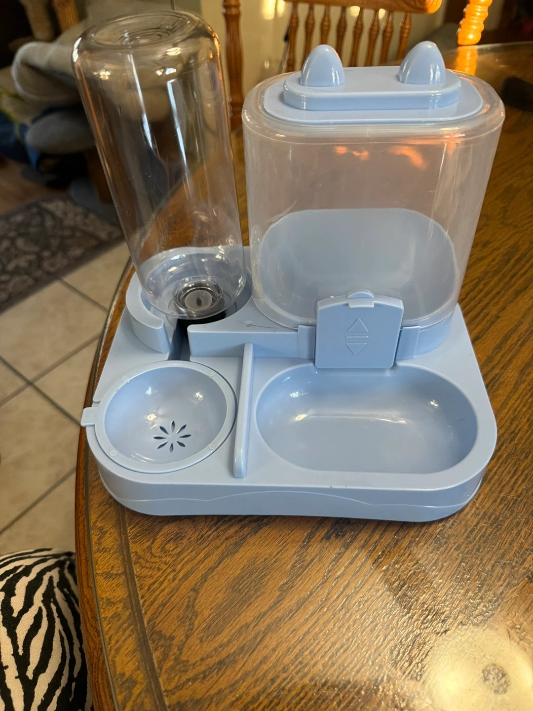 I'm #gifting an automatic pet feeder and water dispenser combo! It's a light blue color and in great condition. Perfect for keeping your furry friend fed and hydrated while you're away. For kittens/small cats.