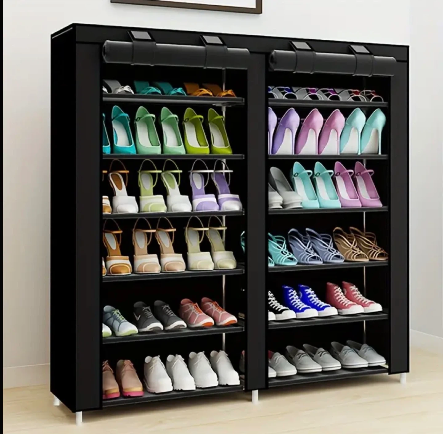 Keep your shoes neatly organized with this portable double shoe rack closet organizer! It features a sturdy steel pipe frame, PP connectors, and thick non-woven fabric shelves.