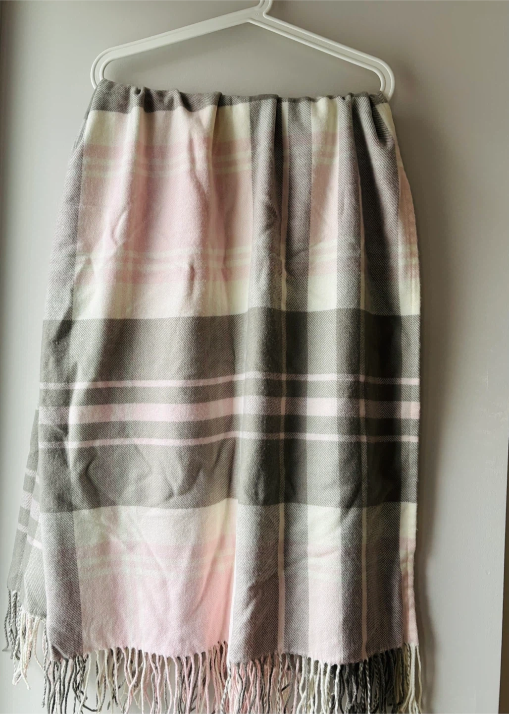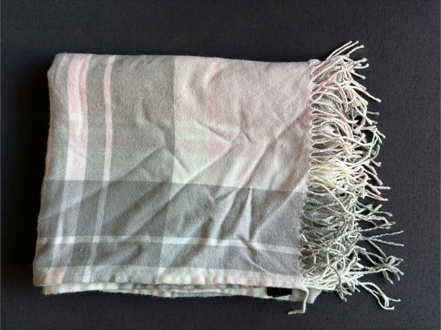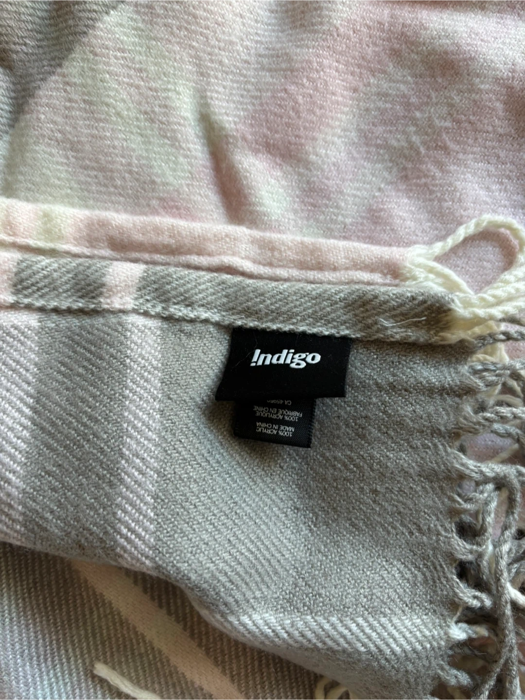 Selling a cozy Indigo throw blanket in a lovely pink and grey plaid pattern! It's made of 100% acrylic and features cute fringe detailing, perfect for adding a touch of warmth and style in winter. Barely used, foldings from storage
