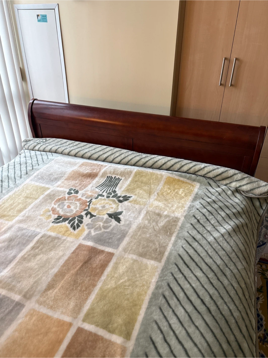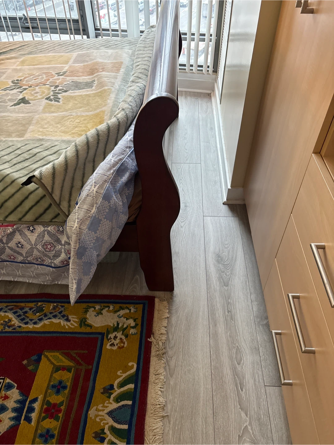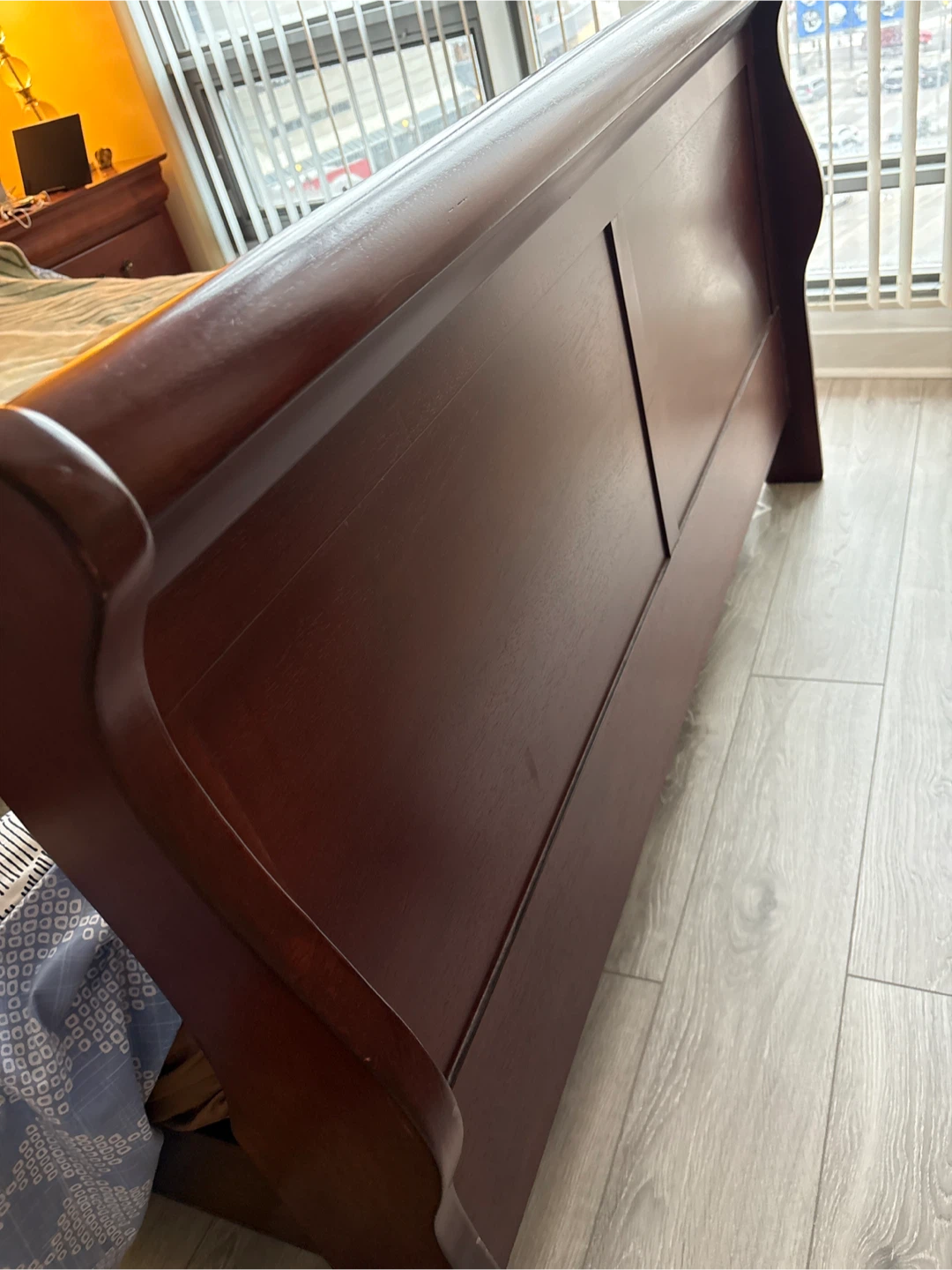 Selling a sturdy wooden bed in a dark brown finish. It's in great condition and ready for a new home. Perfect for adding a touch of classic style to your bedroom!