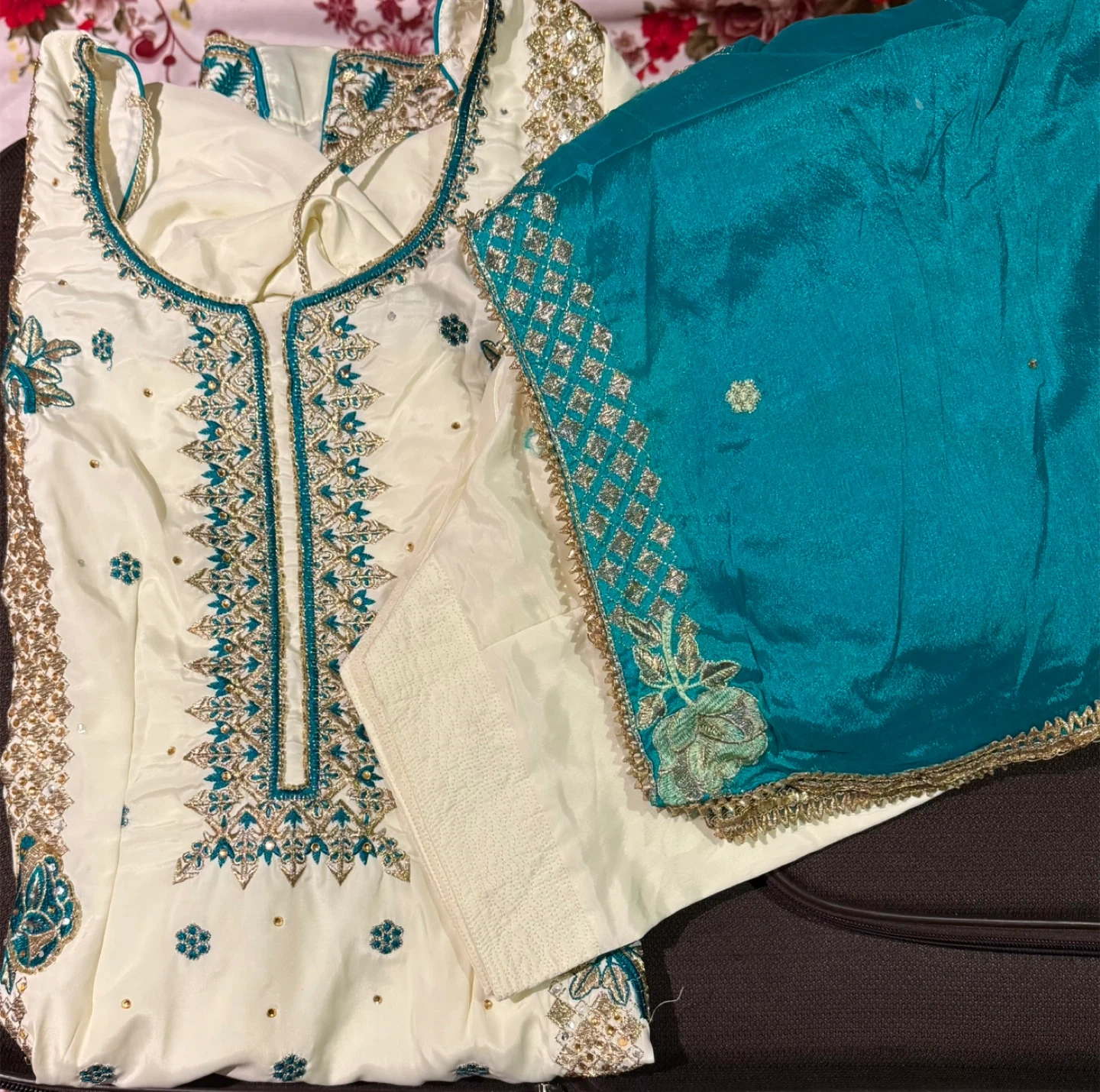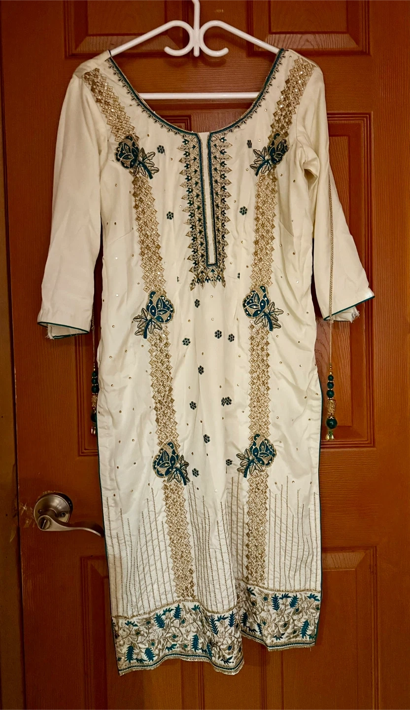 Selling a beautiful salwar kameez! The cream-coloured top is intricately embroidered with teal and gold detailing. It comes with matching pants and a teal dupatta. Perfect for a special occasion or just adding some colour to your wardrobe.