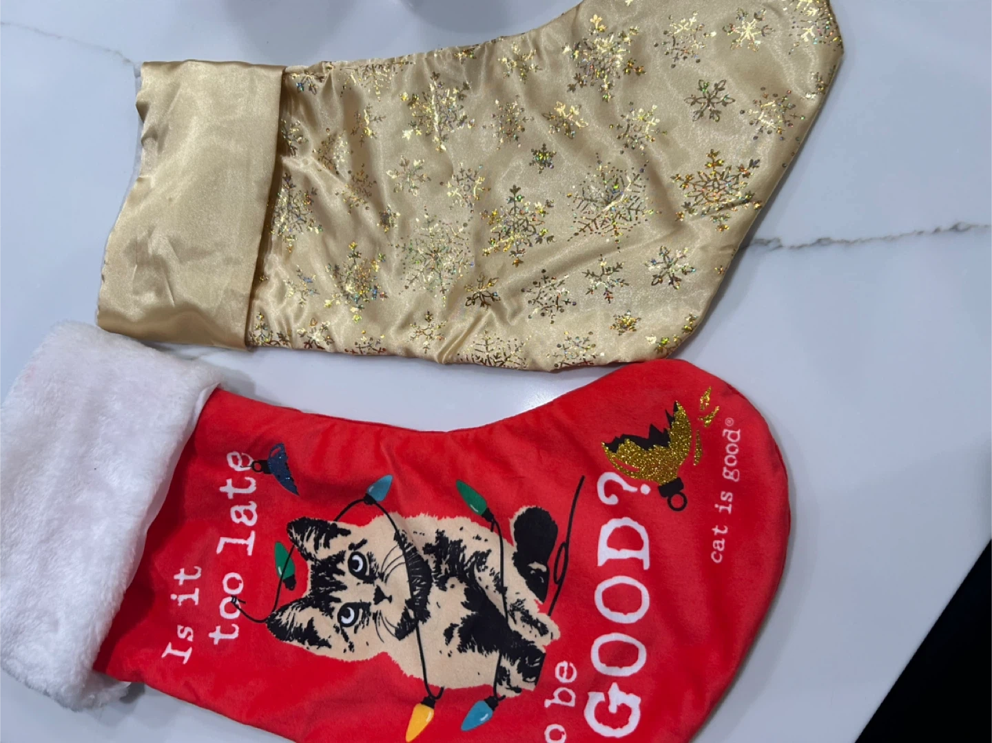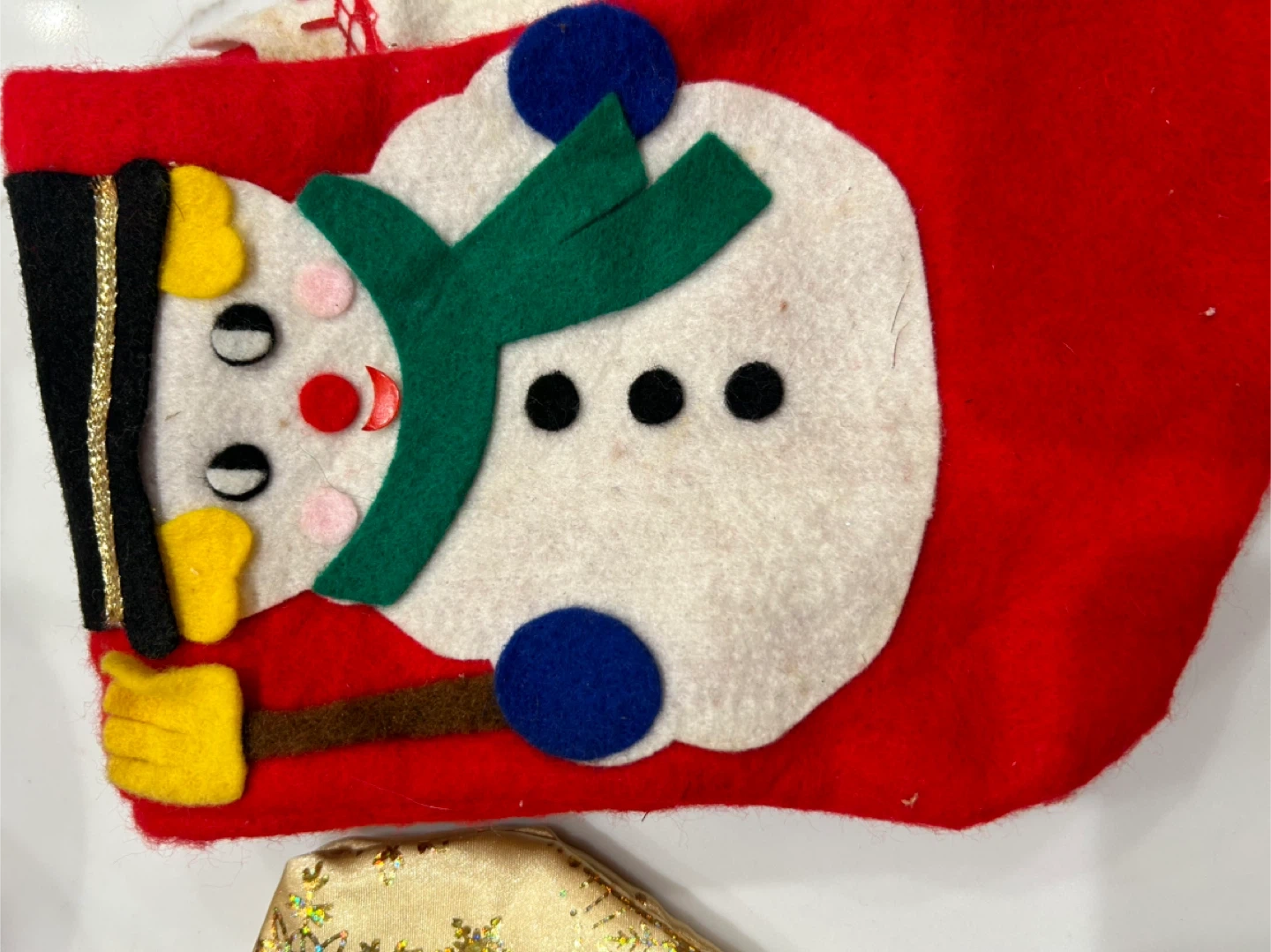 Here are three Christmas stockings! Two are red and one is gold with snowflakes, perfect for the holidays . Small one is free with the purchase of the two stockings . Open to sell separately. Small snow man one is free perfect for your family fur baby stocking all new except the free one ♥️🎄