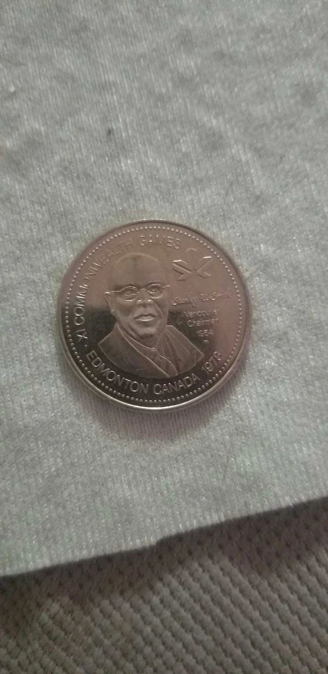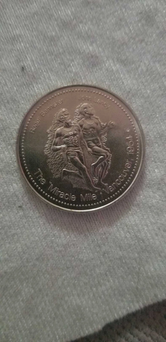 Here we have a commemorative coin celebrating "The Miracle Mile" at the 1954 British Empire and Commonwealth Games held in Vancouver. It features Roger Bannister and John Landy. The flip side shows Dr. Doug Smith at the 1978 Commonwealth Games in Edmonton. This is a great piece of sports history! I'd say its worth around $20, based on similar listings on Kijiji. Just trying to declutter and spread the joy!