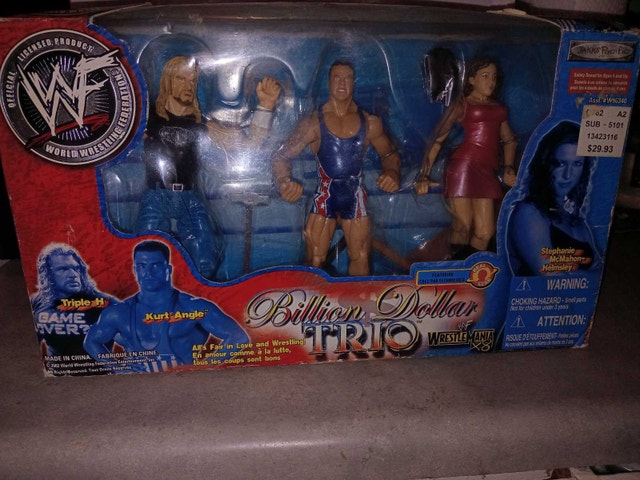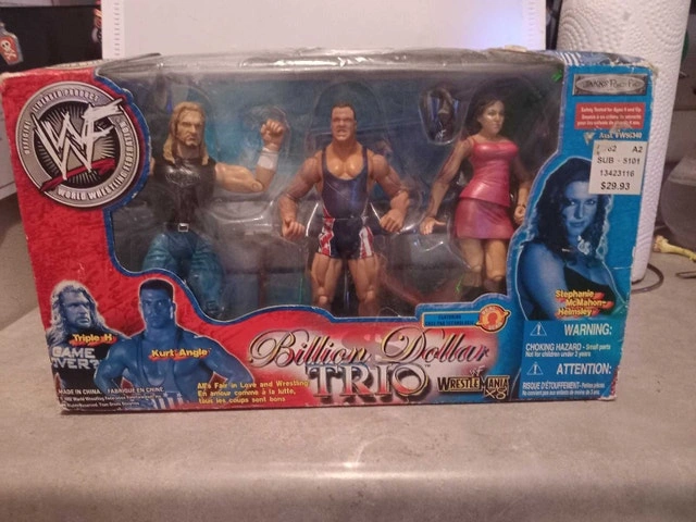 Own a piece of wrestling history with this WWF Billion Dollar Trio action figure set! Featuring Triple H, Kurt Angle, and Stephanie McMahon-Helmsley, these figures are a must-have for any collector. This item is still sealed in the original packaging. While this item brings back a lot of memories, it is time to pass it on for someone else to enjoy! If the ad is still up, yes, it's still available!