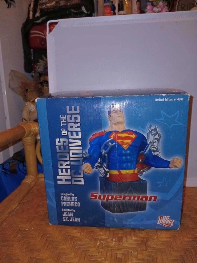 Own a piece of comic history with this DC Direct Superman bust, a limited edition collectible numbered 0523 of only 4000 ever made! This impressive bust captures the Man of Steel in a moment of heroic defiance. This item is not new, but is still in excellent condition and comes with the original packaging. It is a must-have for any serious DC Comics or Superman fan. Whether you're a seasoned collector or just starting out, this Superman bust is sure to be a prized addition to your collection. Don't miss your chance to own this rare and iconic piece of superhero memorabilia! Happy collecting!