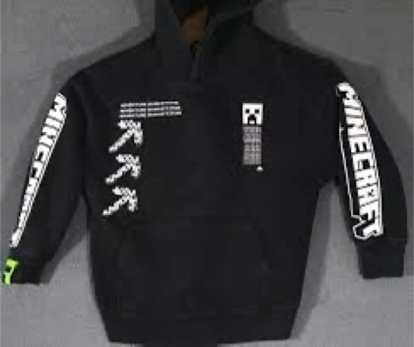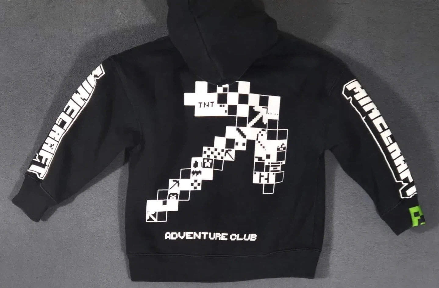 Selling a Minecraft Adventure Club hoodie in black. It features the iconic Minecraft design with a pickaxe and TNT. Perfect for any young Minecraft fan!