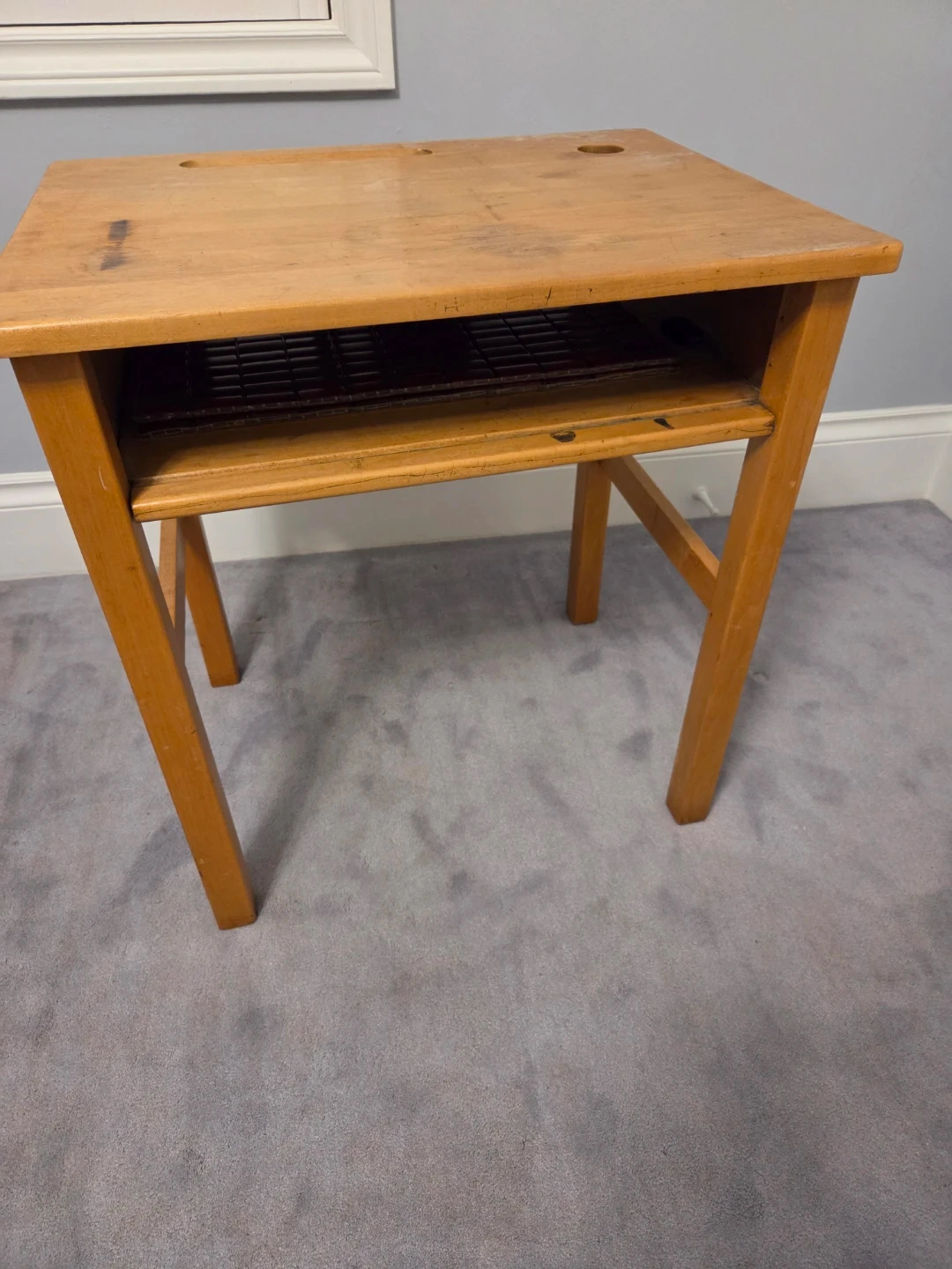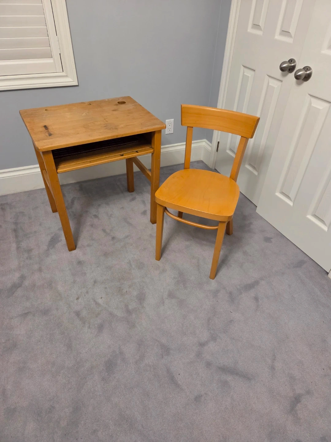 Selling a cute vintage wooden school desk and chair set. Also has an opening for a ink well.It's perfect for a kid's room or study area. The desk has a little storage space underneath. The chair is the perfect height for the desk. There are some signs of use on the desk top.