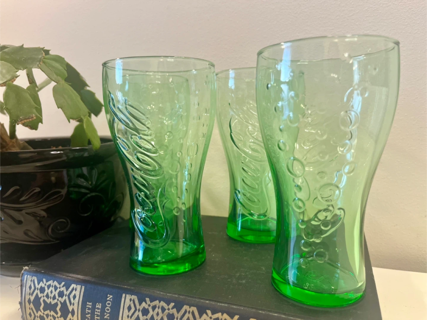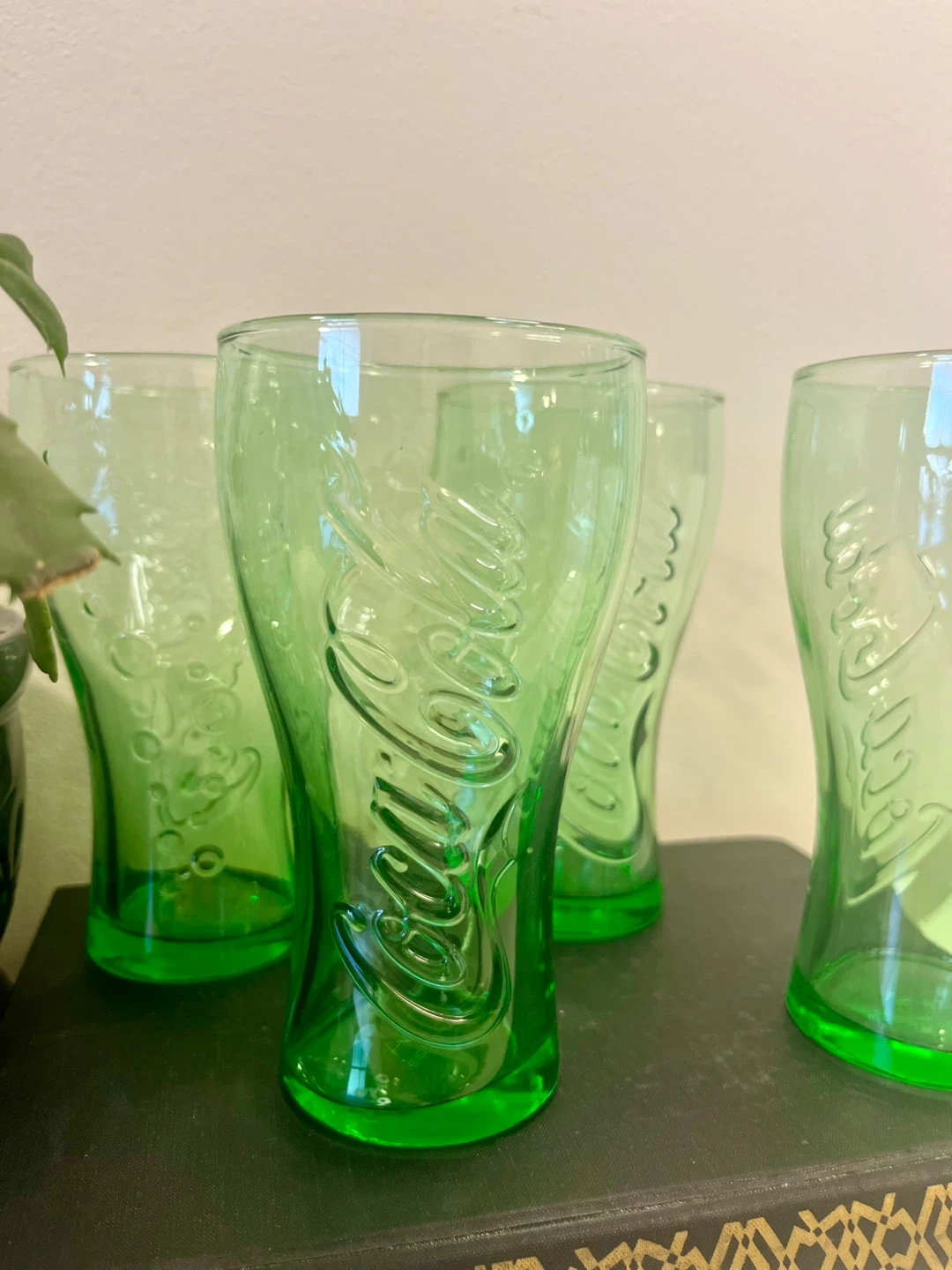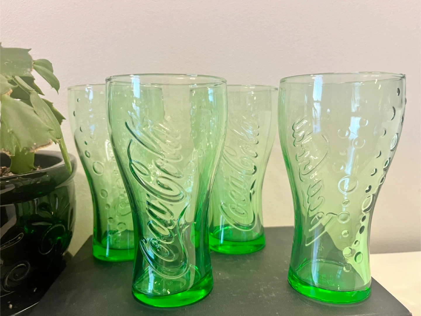 Selling a set of green Coca-Cola glasses. They're in great shape and would be a fun addition to any collection or kitchen!