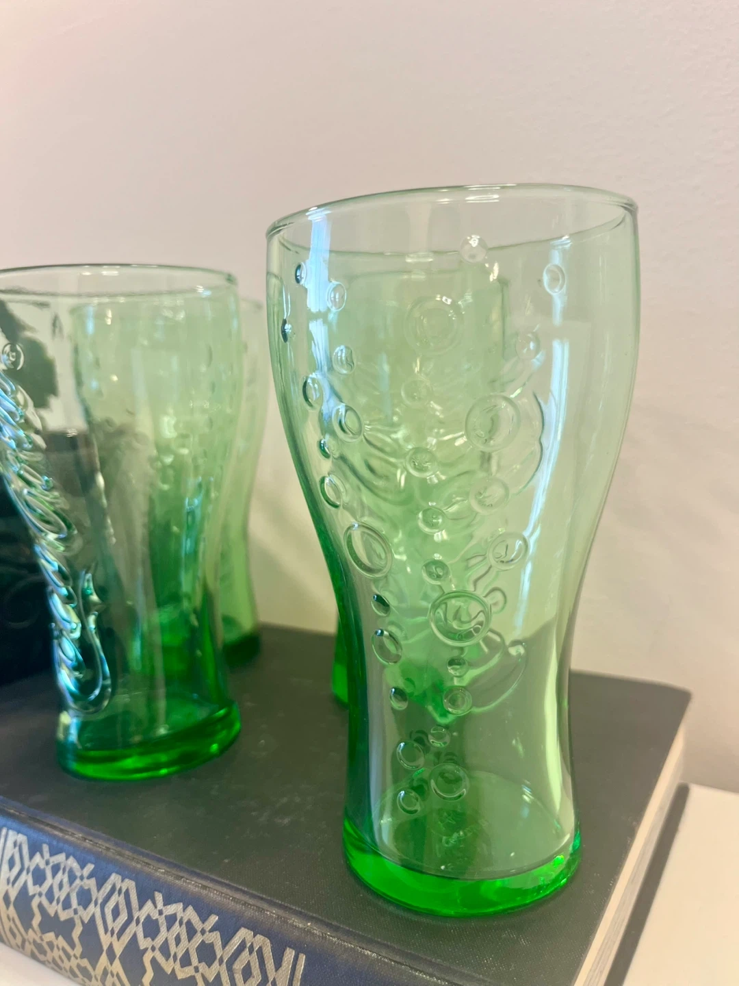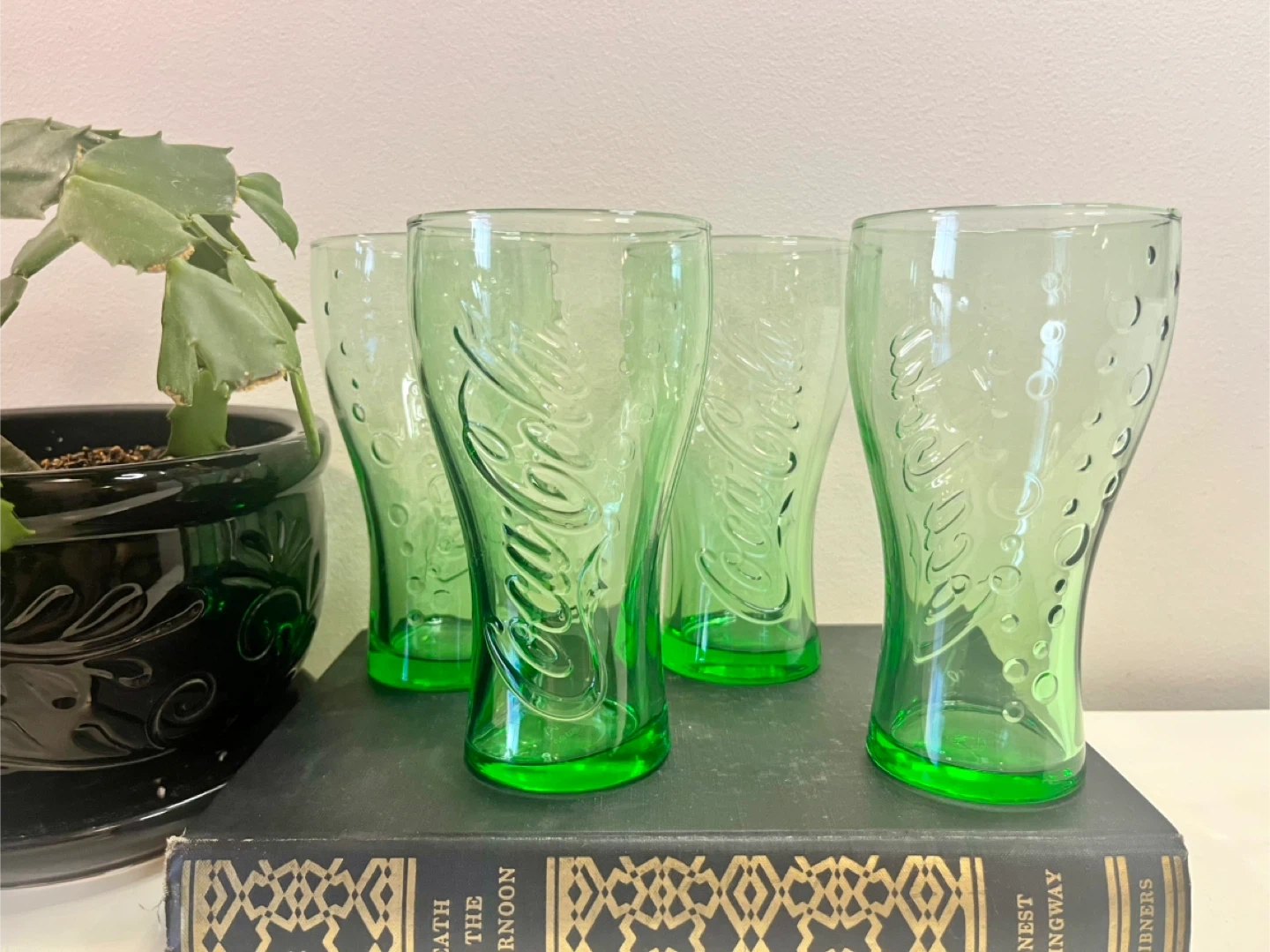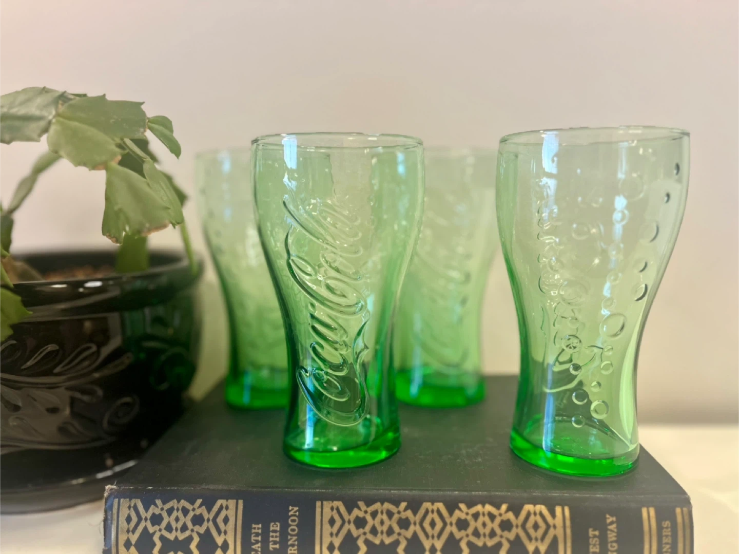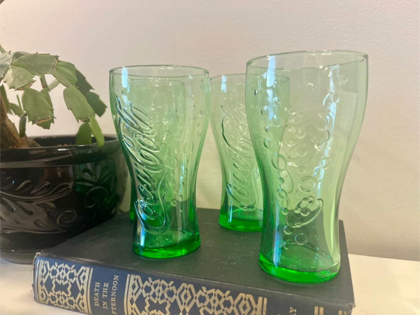Selling a set of green Coca-Cola glasses. They're in great shape and would be a fun addition to any collection or kitchen!