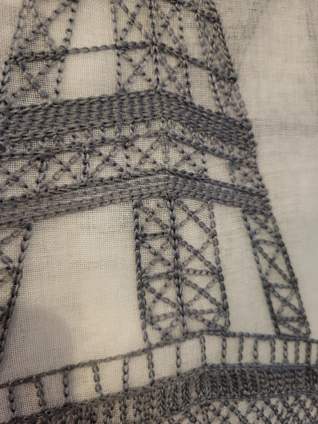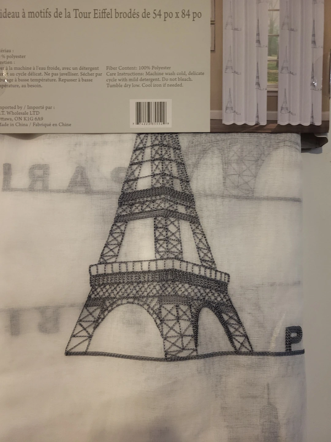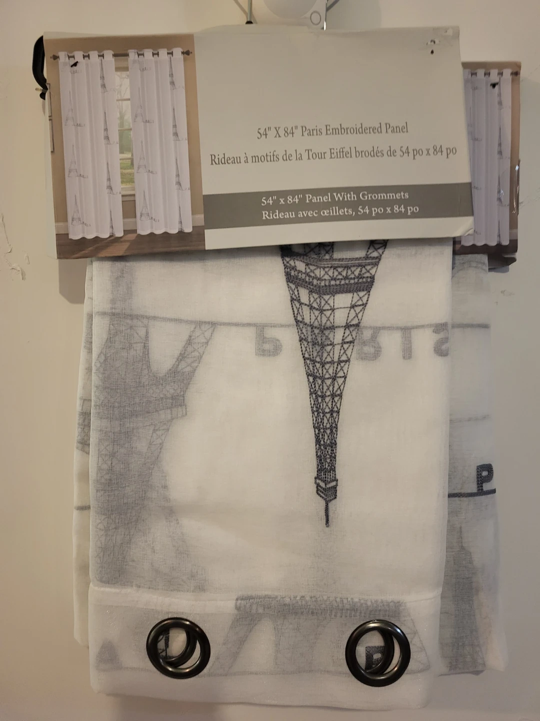 Selling a Paris-themed embroidered curtain panel. The dimensions are 54" x 84", perfect for adding a touch of Parisian charm to any room! The panel features an embroidered Eiffel Tower design on a white background. Fiber content is 100% polyester. Cool iron if needed