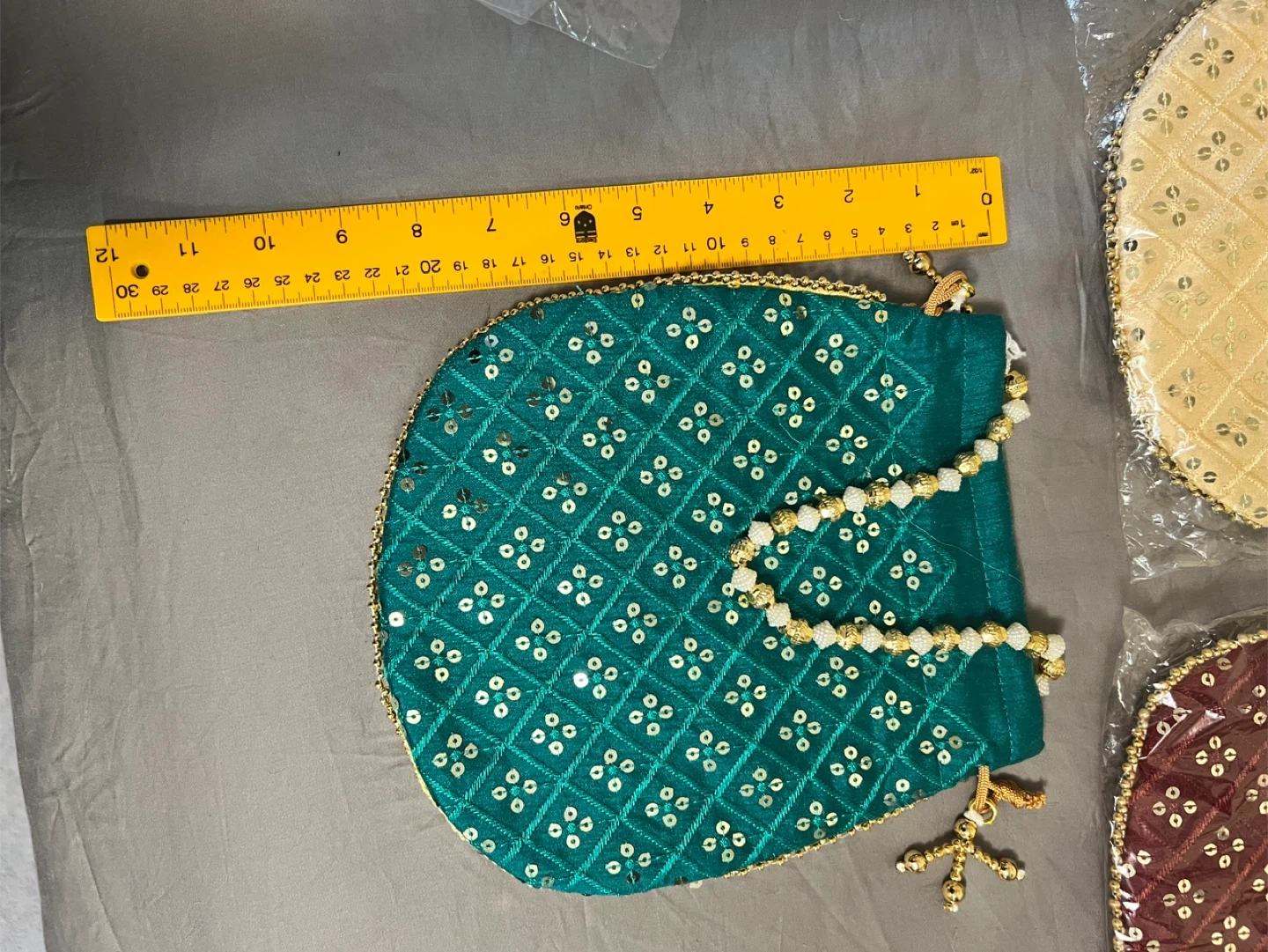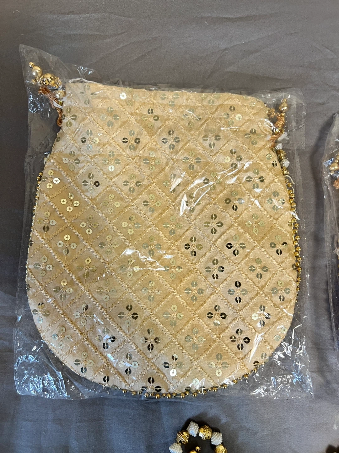 Selling a set of three potli bags in excellent condition! These bags feature intricate designs and are perfect for special occasions or adding a touch of elegance to your outfit. The set includes bags in teal, maroon, and beige. They are brand new and still in their original packaging