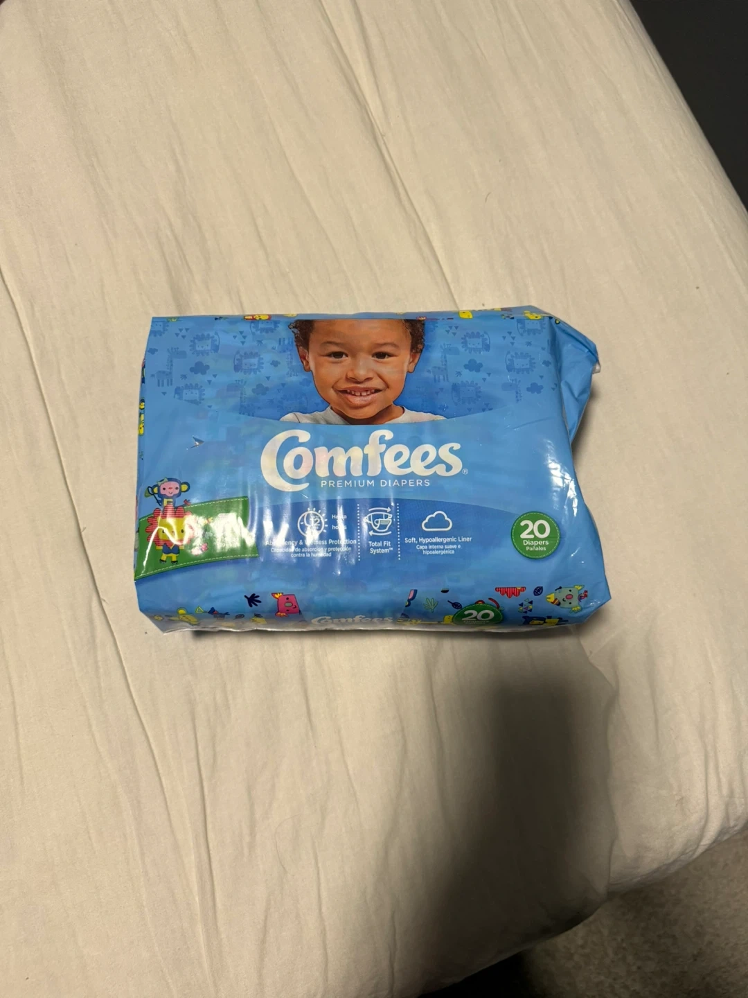 Selling a pack of Comfees Premium Diapers. This pack contains 20 diapers. They feature a Total Fit System and a soft, hypoallergenic liner for your baby's comfort