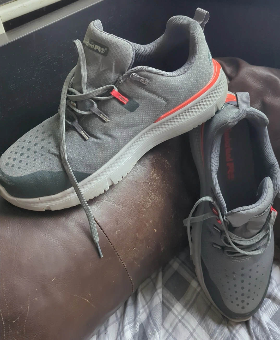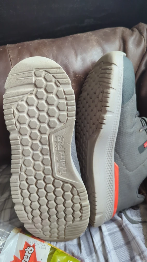 Looking to sell a pair of Timberland PRO Reaxion athletic work shoes. They are grey with some orange detailing. The soles are in great shape and ready for work!