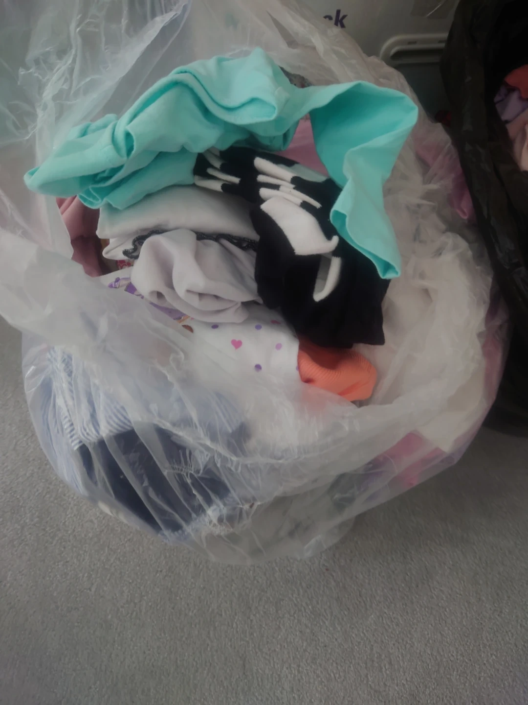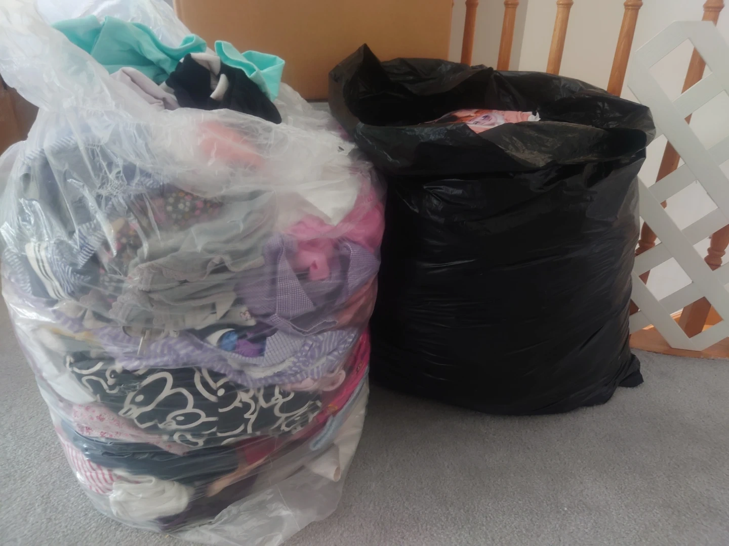 Two bags of used clothing for sale. One bag is clear and the other is black. Good for someone who needs a lot of clothes!