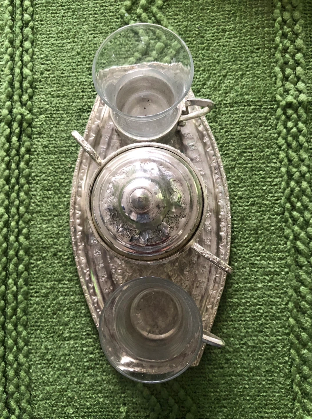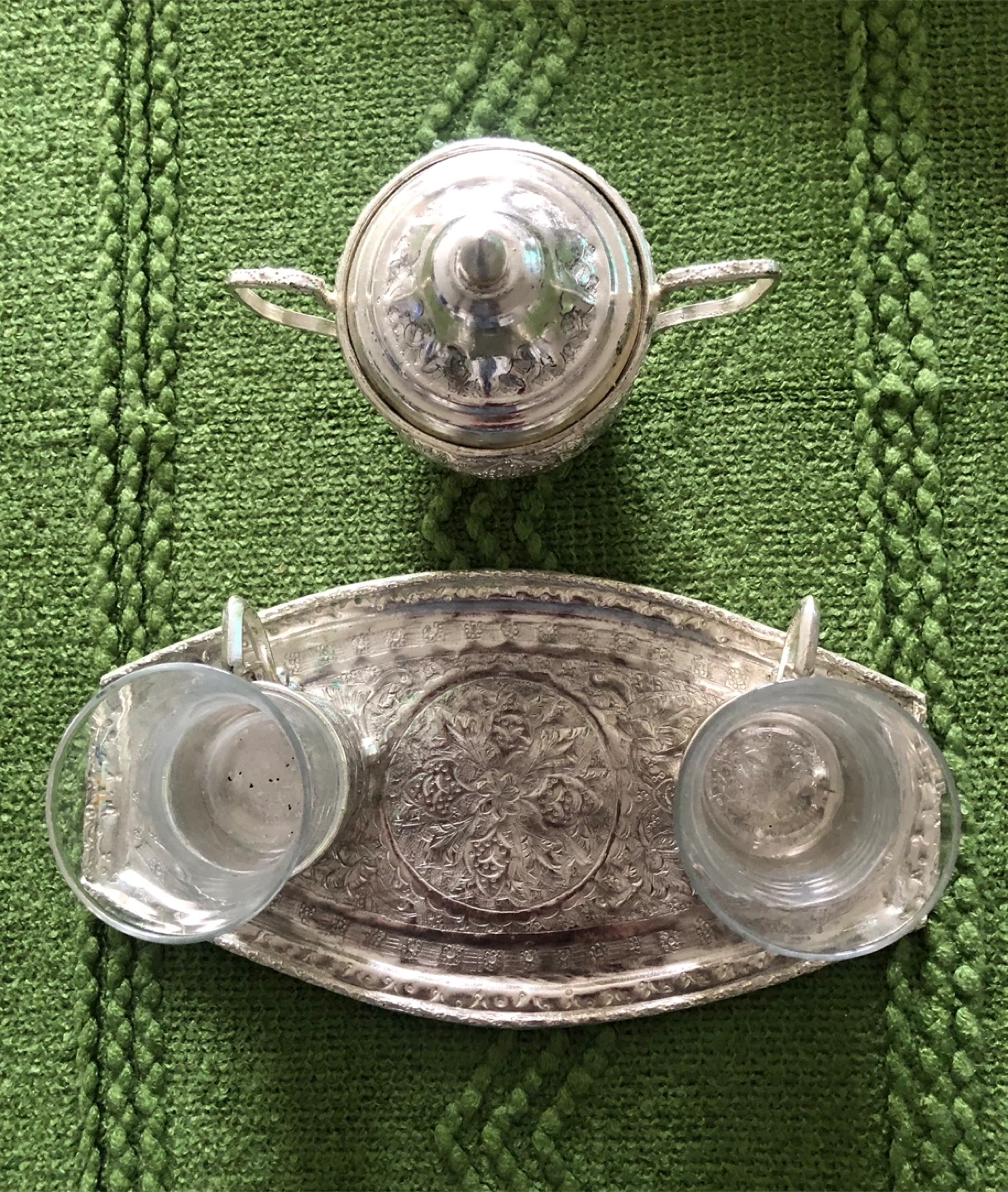 Selling a vintage tea set. It includes a sugar bowl with a lid, two teacups, and a serving tray. The set has intricate floral designs and is perfect for tea parties or as a decorative piece. It shows some signs of wear, adding to its vintage charm