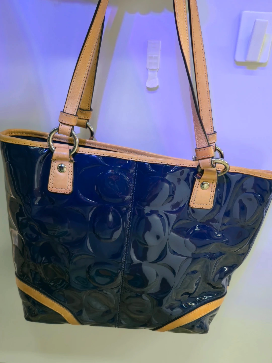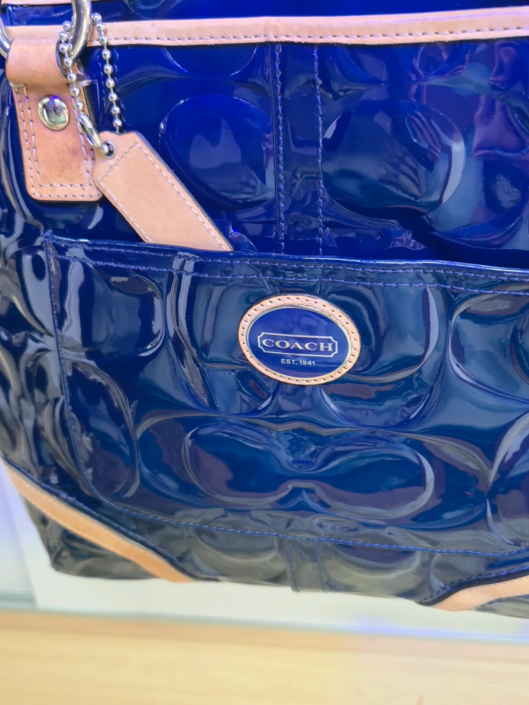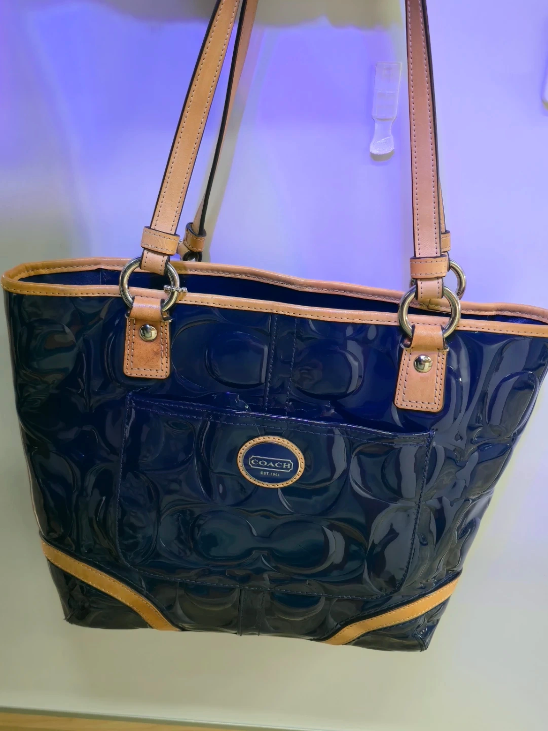 Selling a stylish Coach tote bag in navy blue patent leather! The bag features the classic Coach logo pattern and tan leather trim. The model number is F22322.