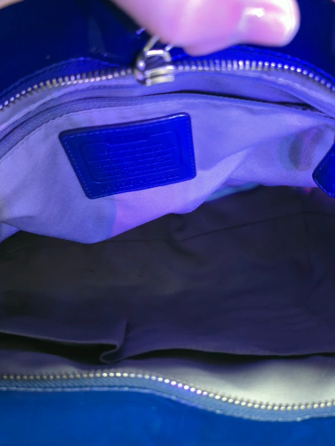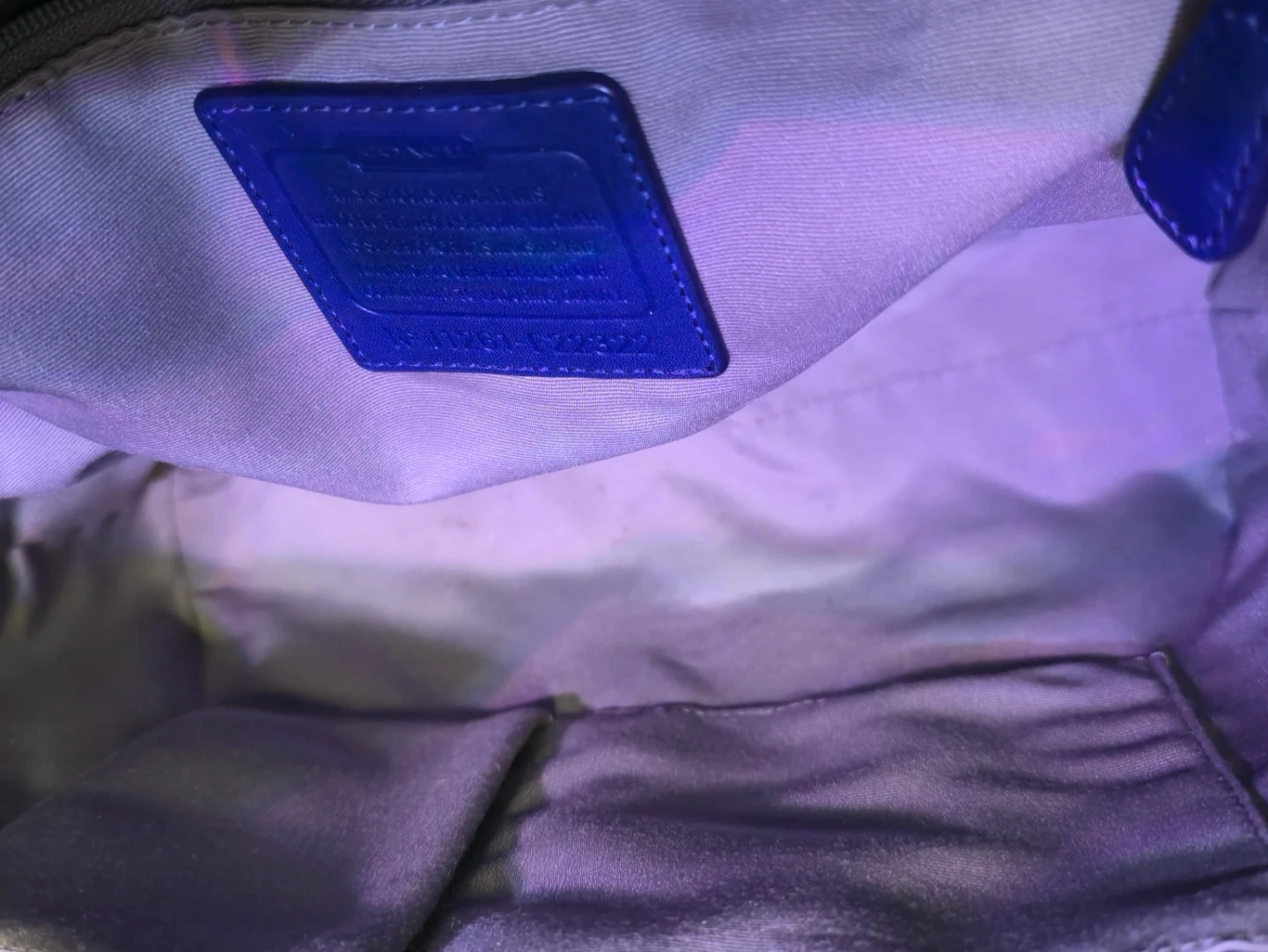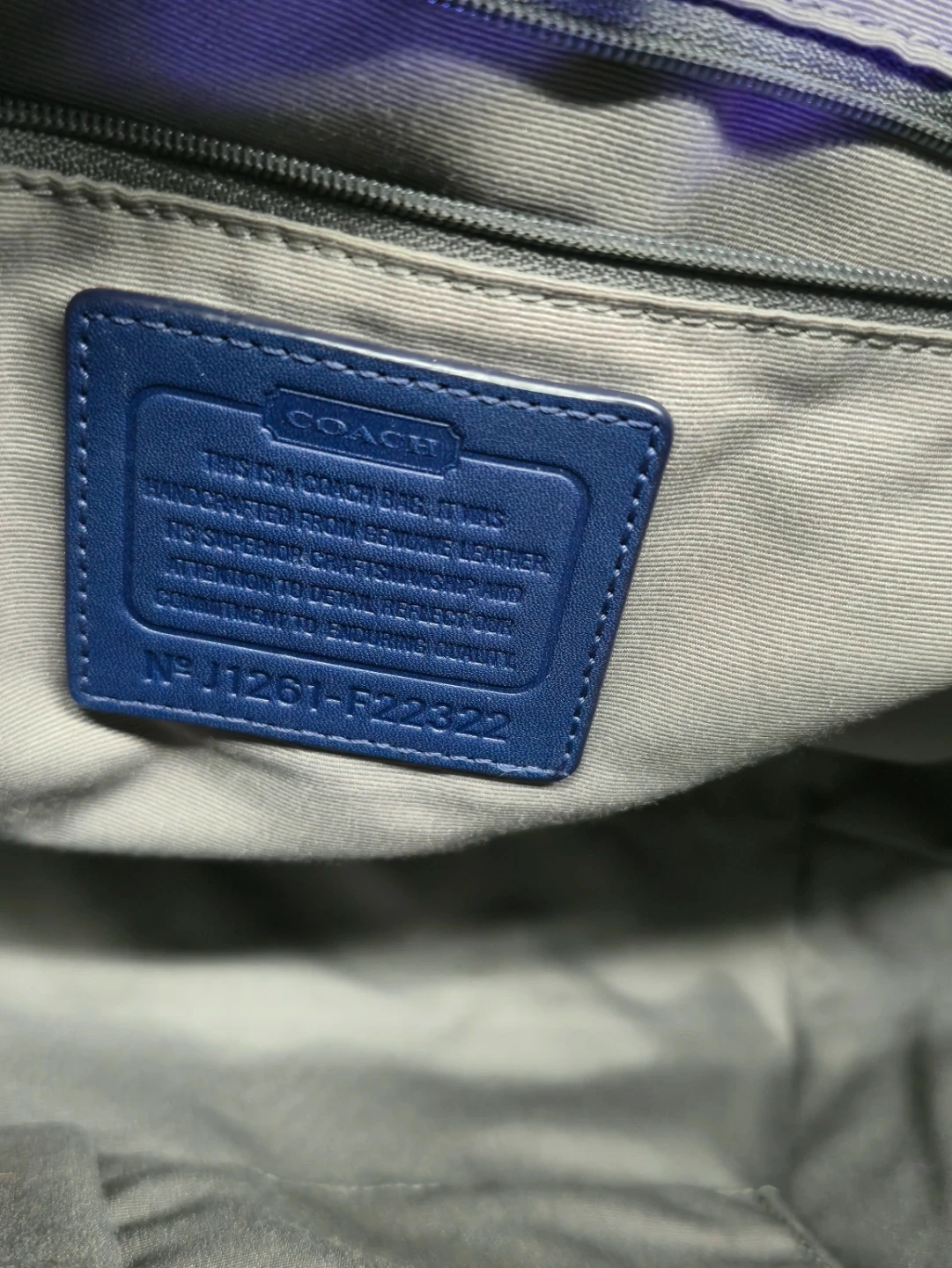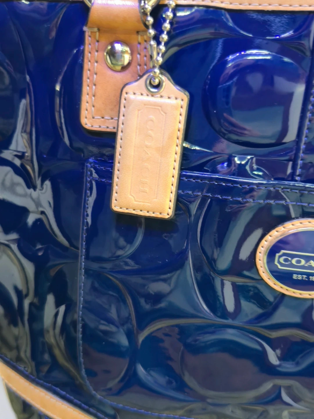 Selling a stylish Coach tote bag in navy blue patent leather! The bag features the classic Coach logo pattern and tan leather trim. The model number is F22322.
