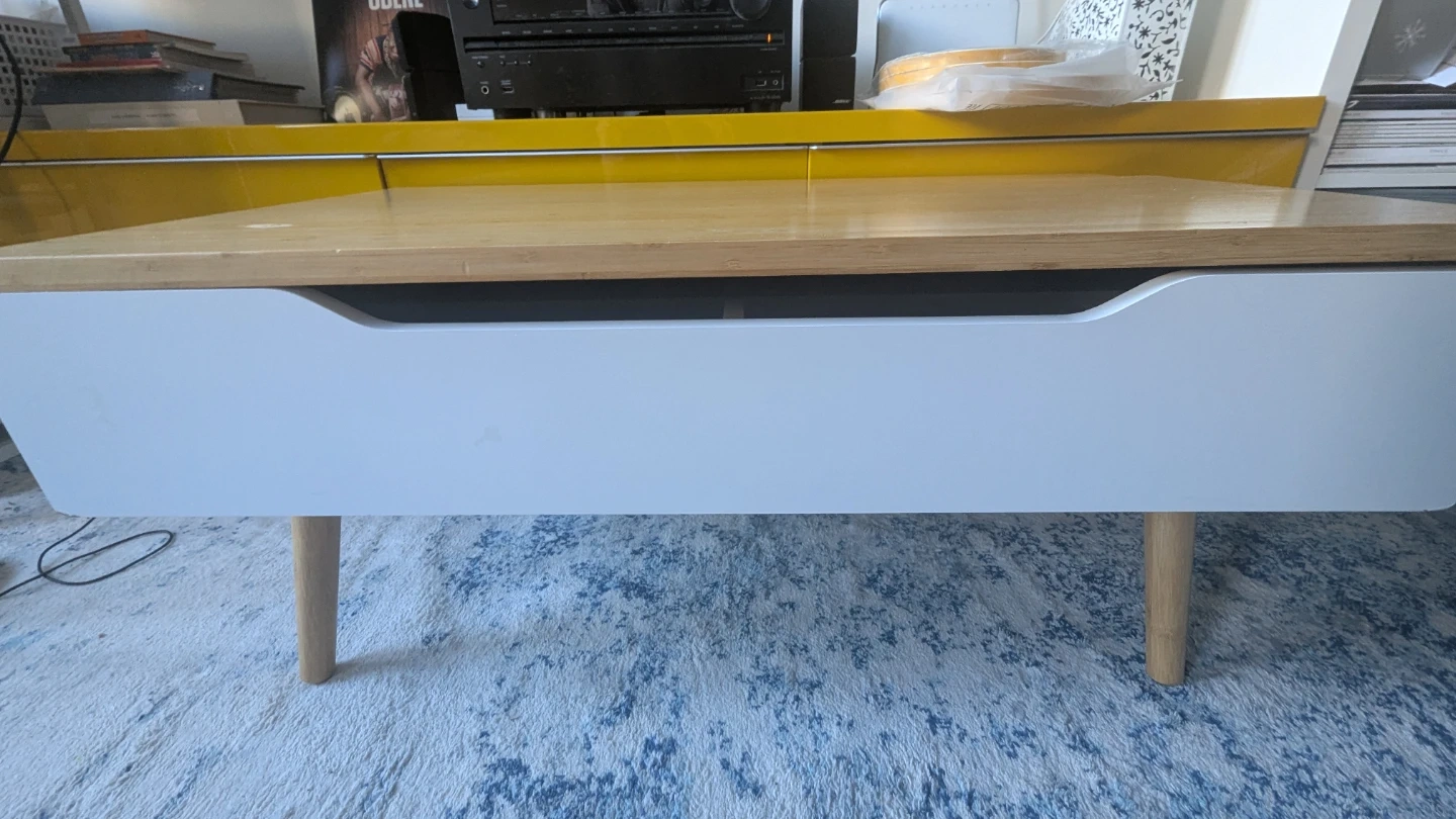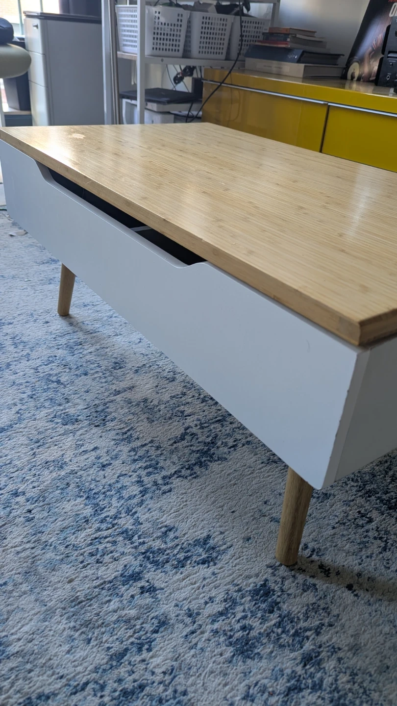 I'm selling a lift top coffee table! It features a bamboo top and white base. The lift top reveals hidden storage, making it super functional and stylish for any living room.