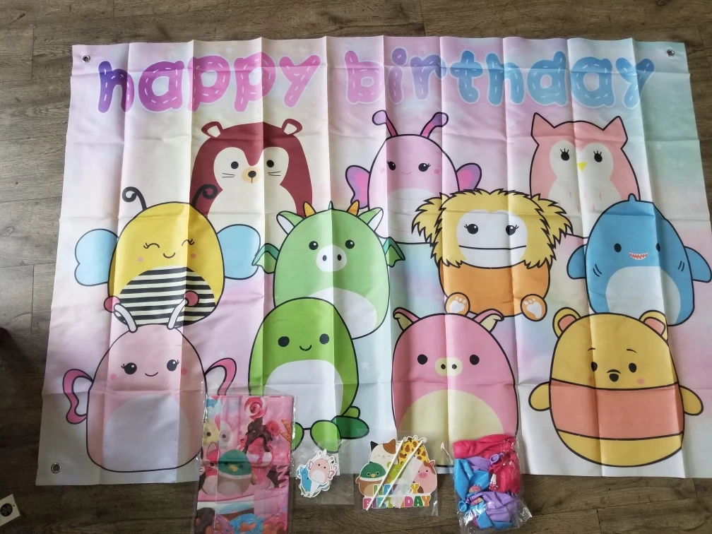 Selling a cute 'Happy Birthday' backdrop featuring Squishmallow characters! Perfect for a birthday party decoration. Includes some additional birthday decorations as well