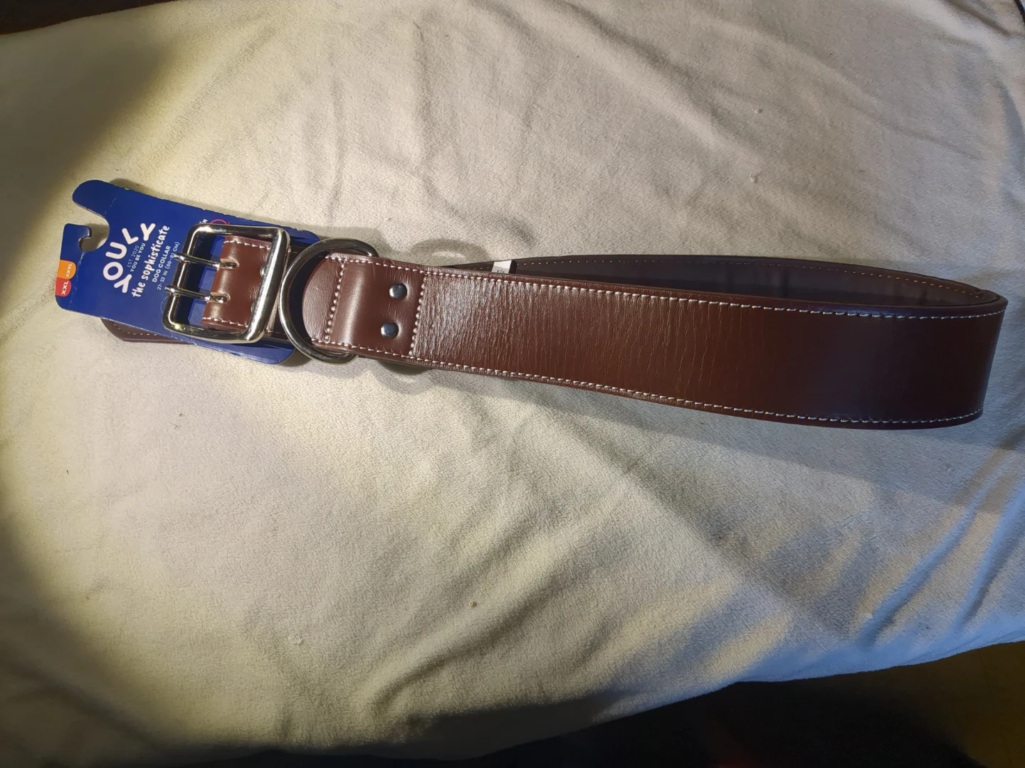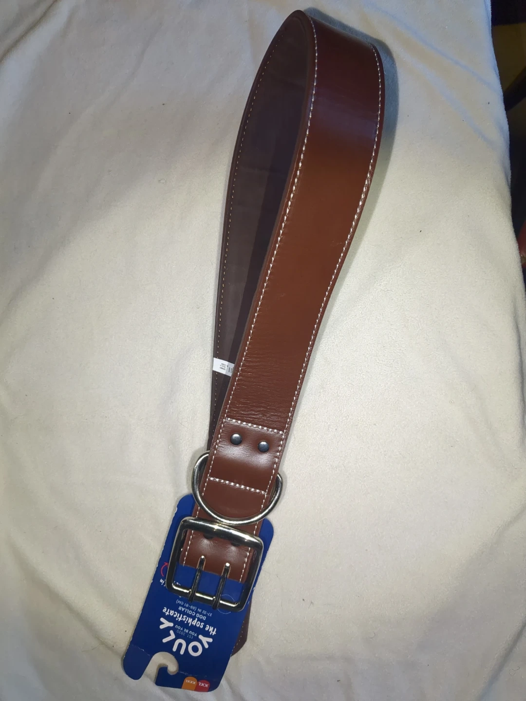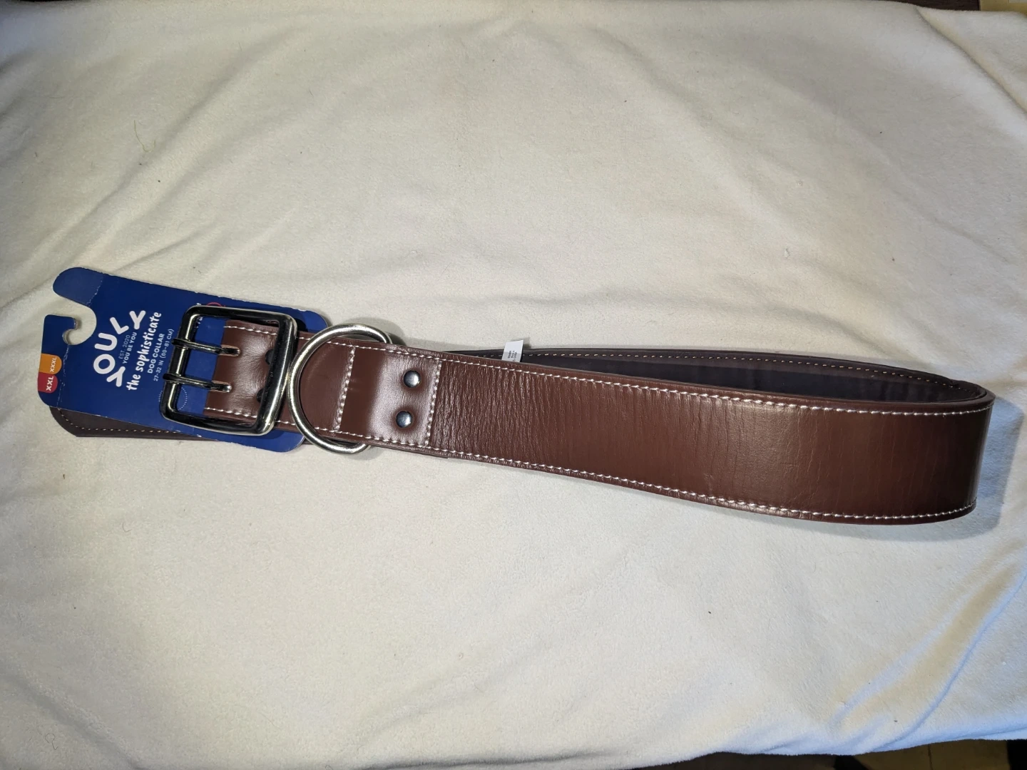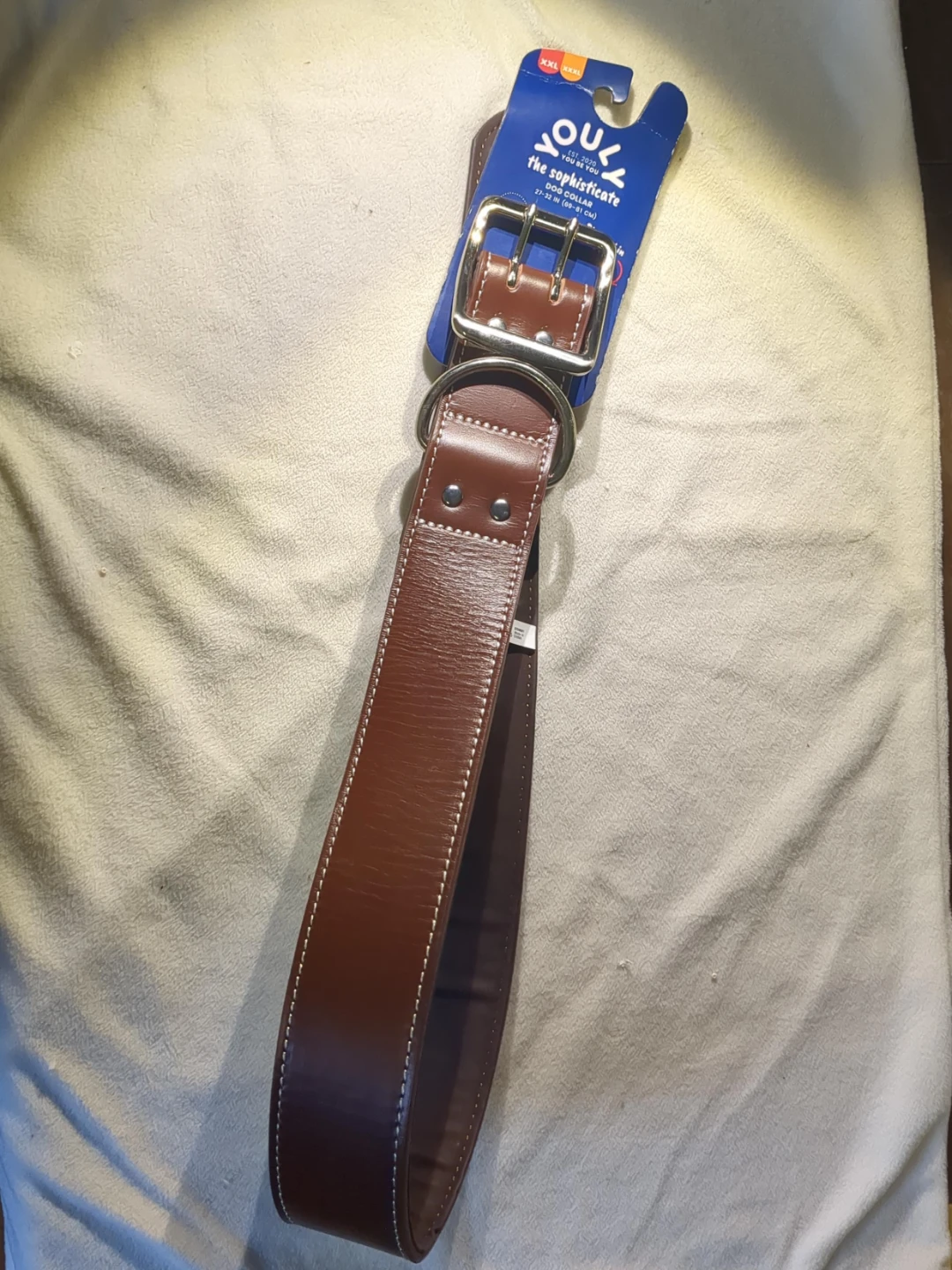 I'm selling a brand new Ouly the Sophisticate dog collar in size XXL! This collar is a beautiful brown color and features a classic design. It's perfect for a larger dog and will add a touch of sophistication to their look