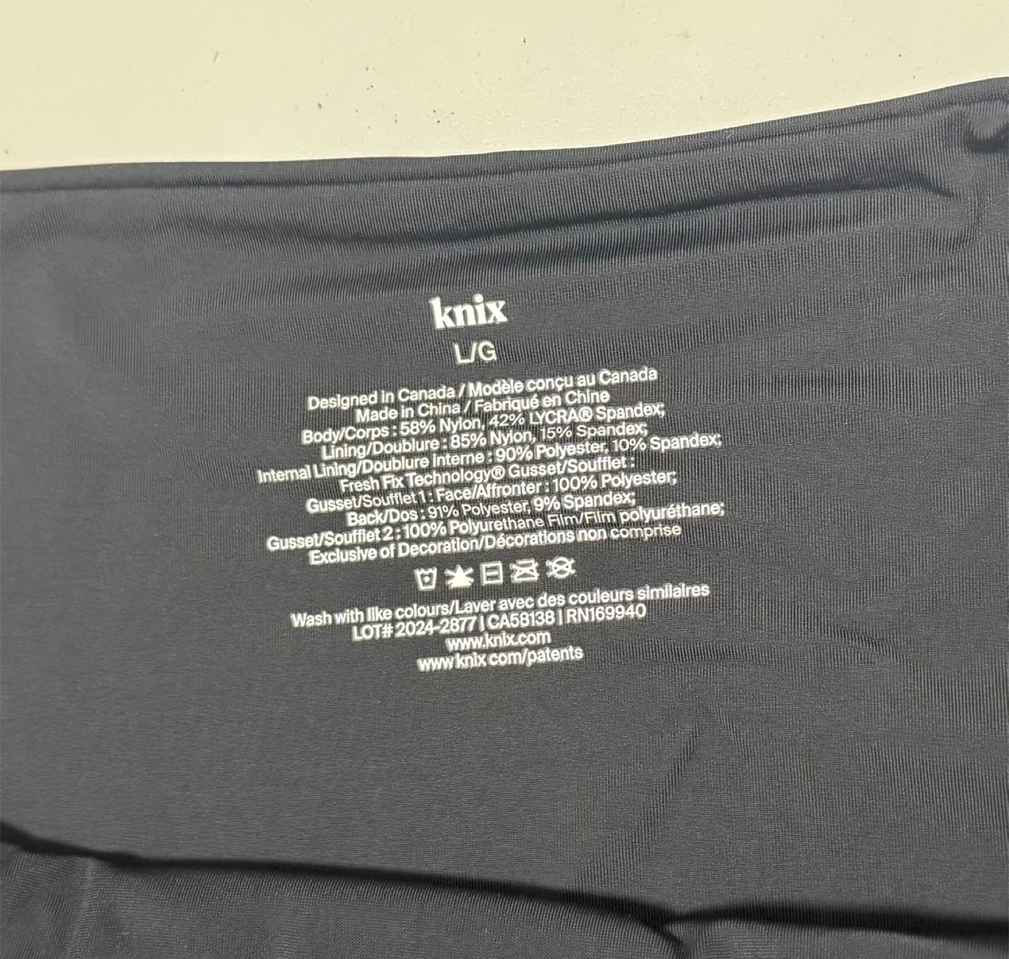 Knix high-rise bikini bottom in black, L/G. It's made of 58% nylon and 42% LYCRA spandex for the body, with a lining of 85% nylon and 15% spandex. The internal lining is 90% polyester and 10% spandex.