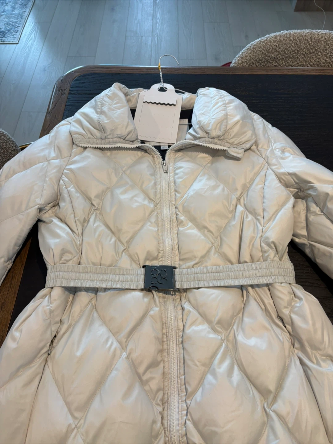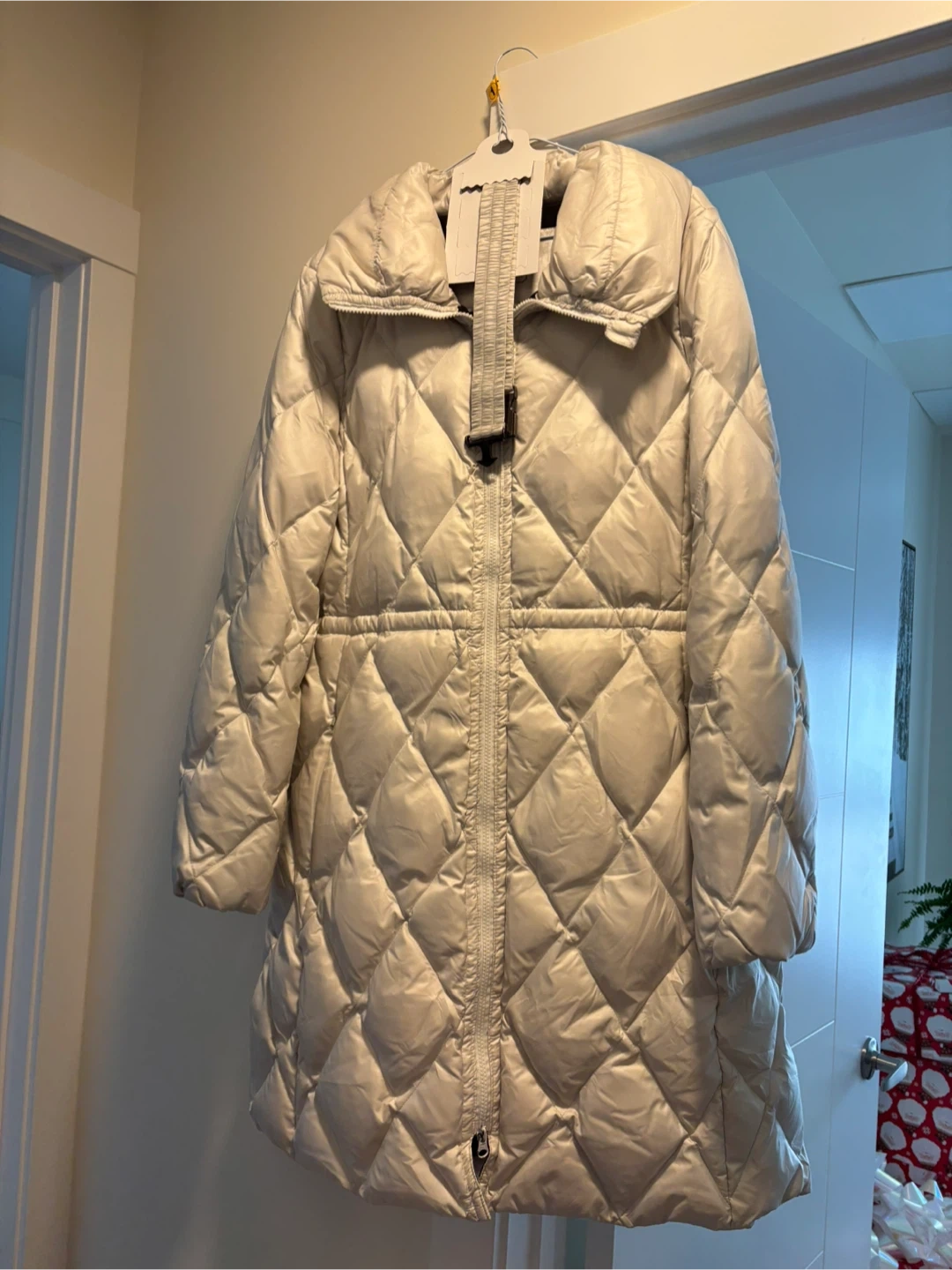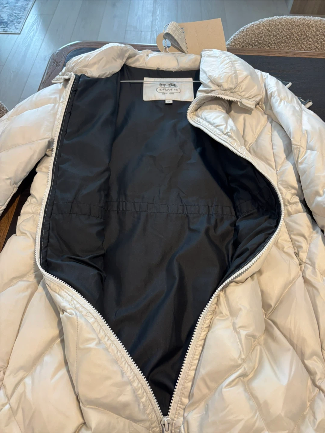 Selling a Coach quilted down puffer coat. It's a stylish and warm coat, perfect for cold weather! It features a quilted design and a belted waist for a flattering fit. Pickup OKOTOKS