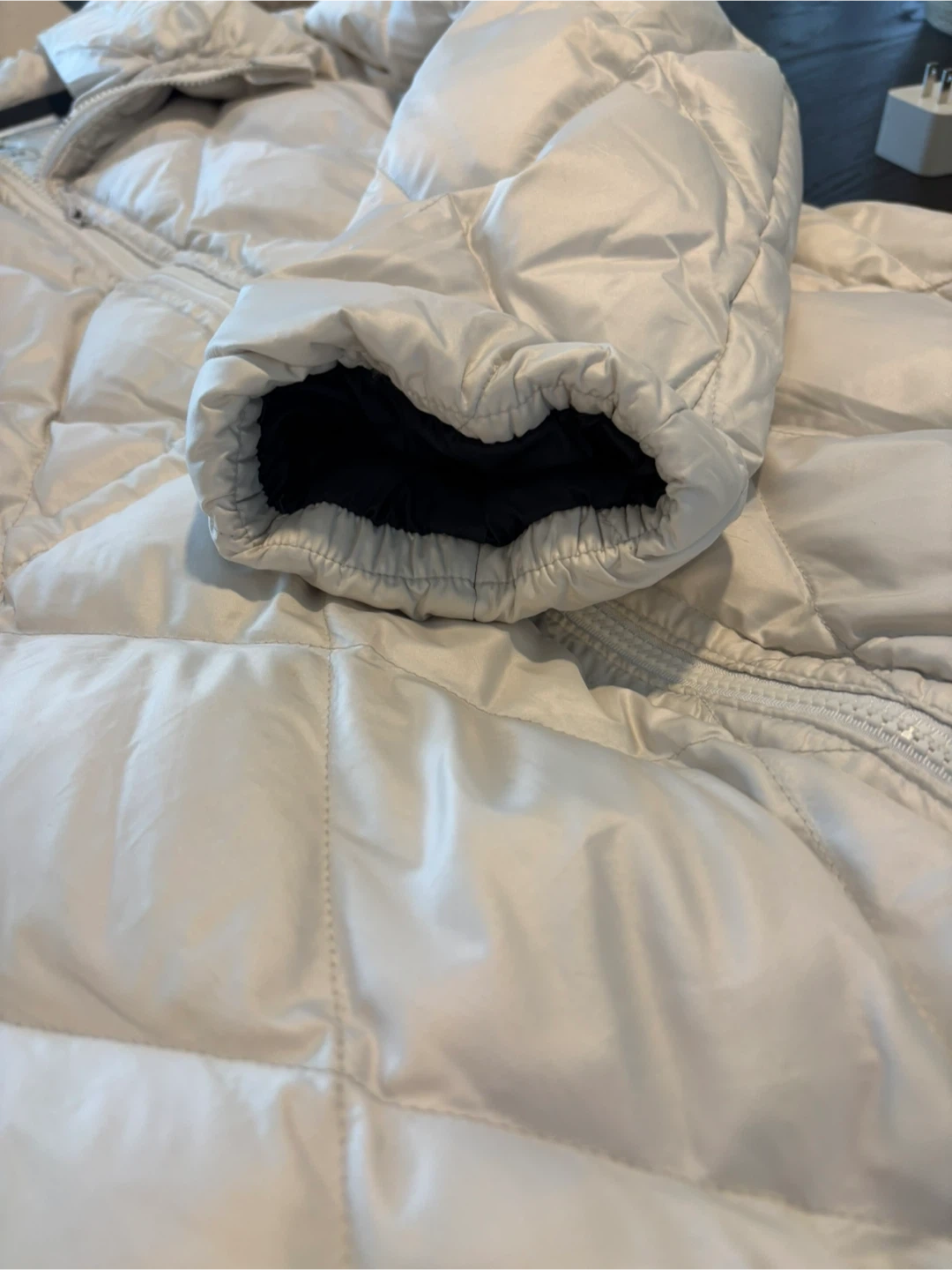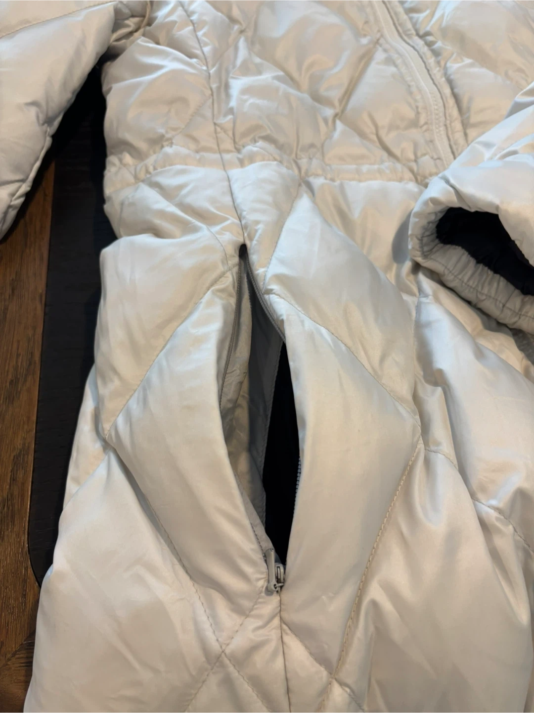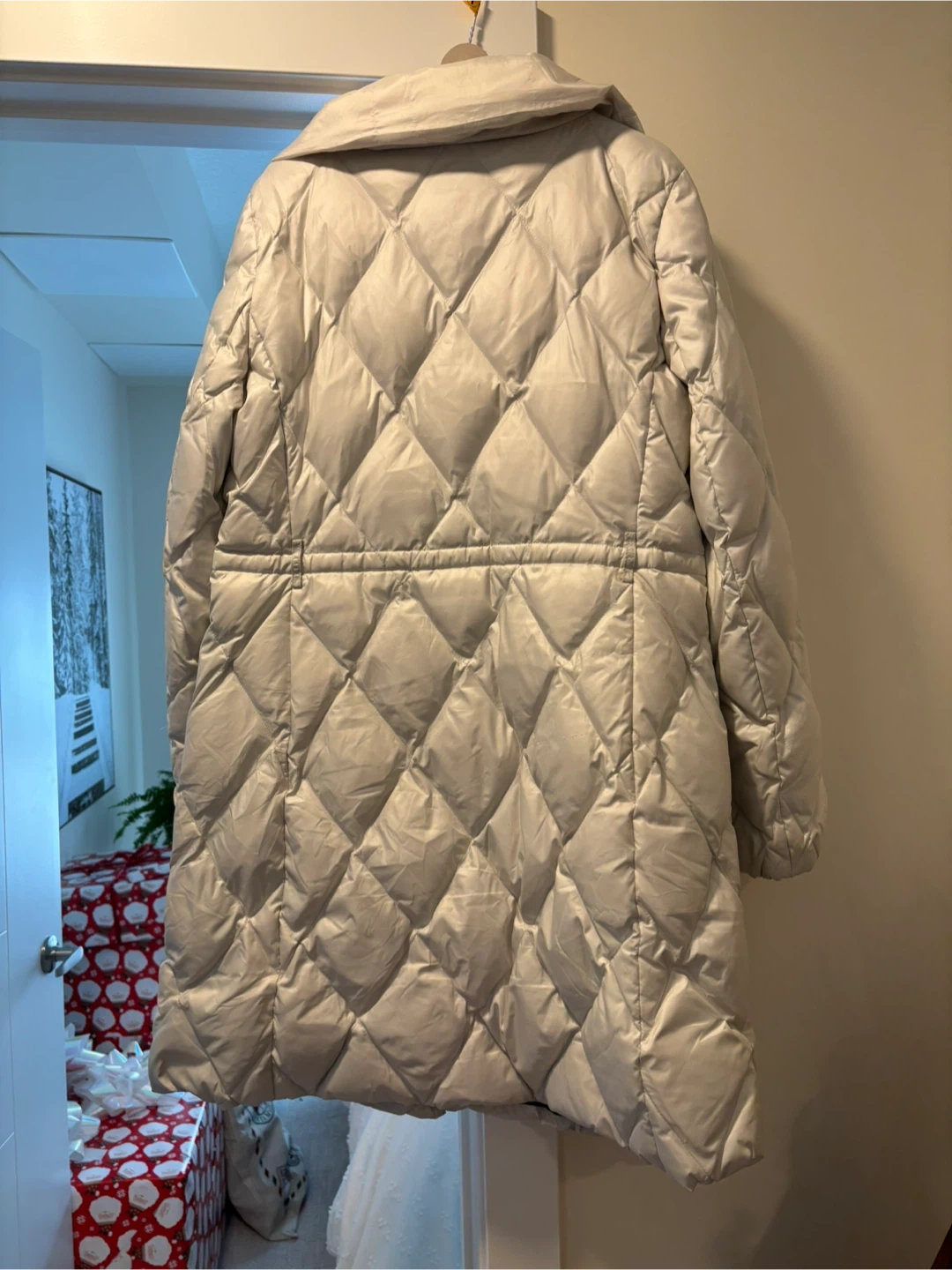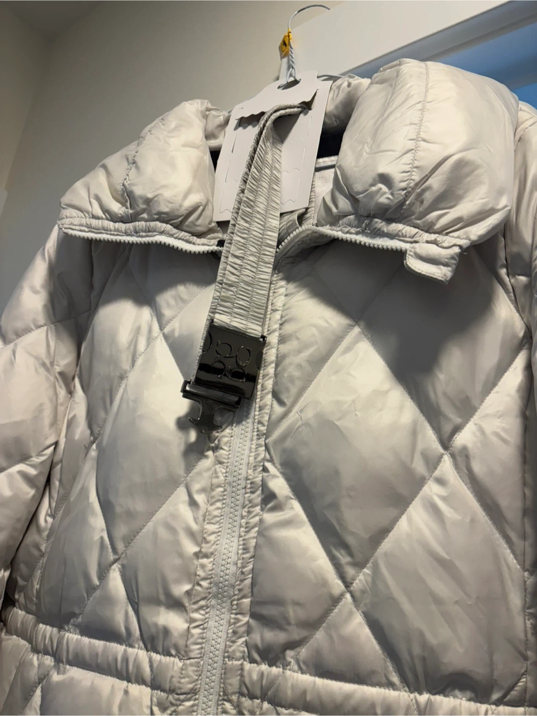 Selling a Coach quilted down puffer coat. It's a stylish and warm coat, perfect for cold weather! It features a quilted design and a belted waist for a flattering fit. Pickup OKOTOKS