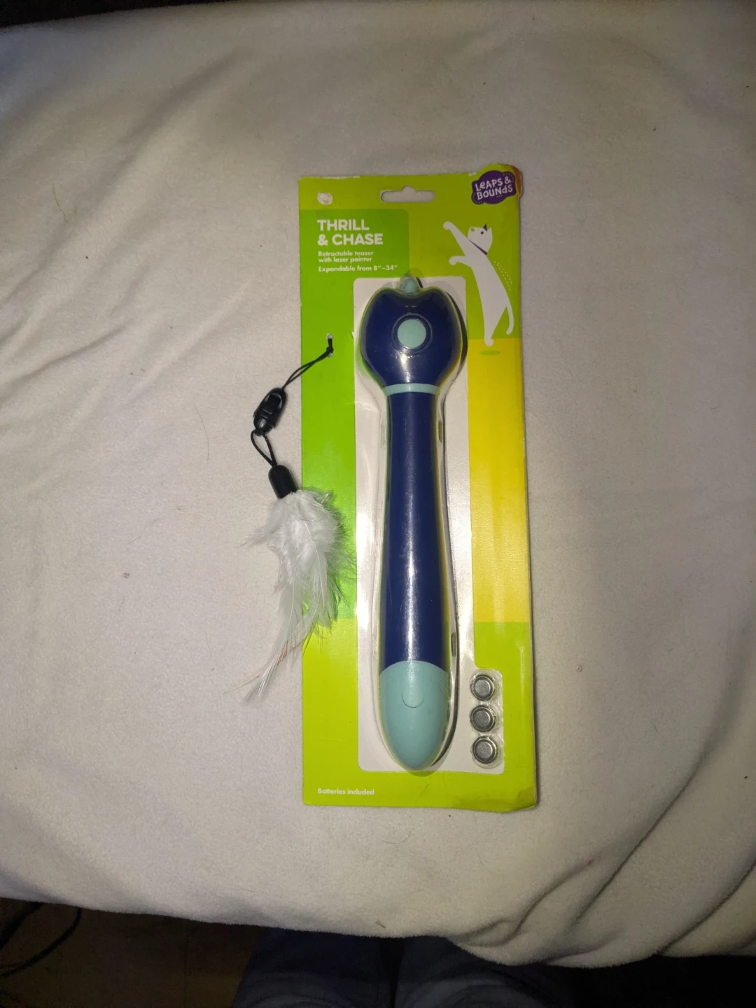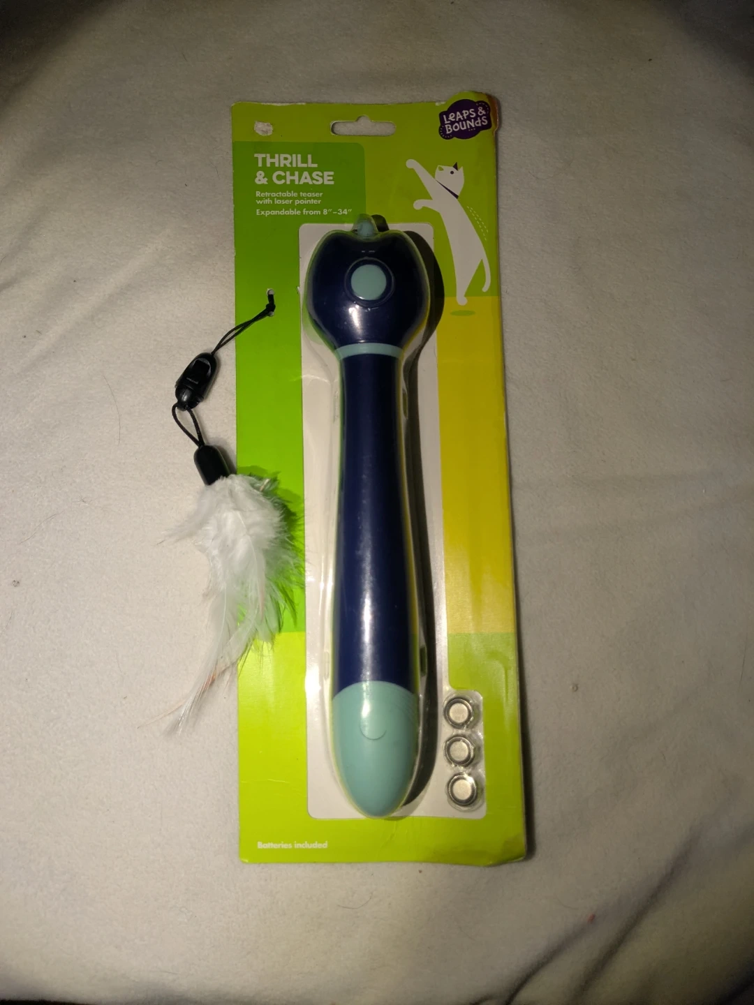 I'm selling a brand new Leaps & Bounds Thrill & Chase cat toy! It's a retractable teaser that expands from 8"-34". Batteries are included so your furry friend can start playing right away!