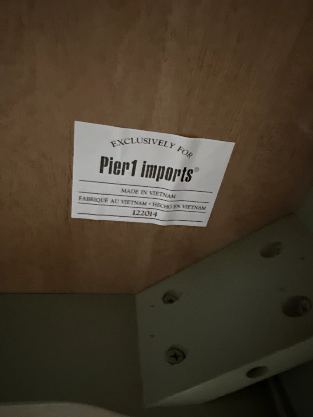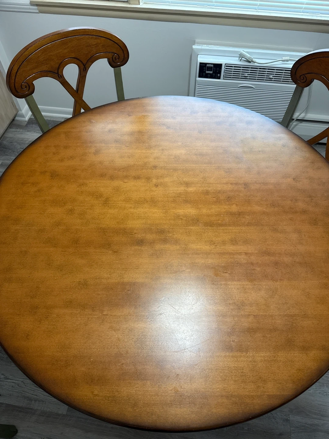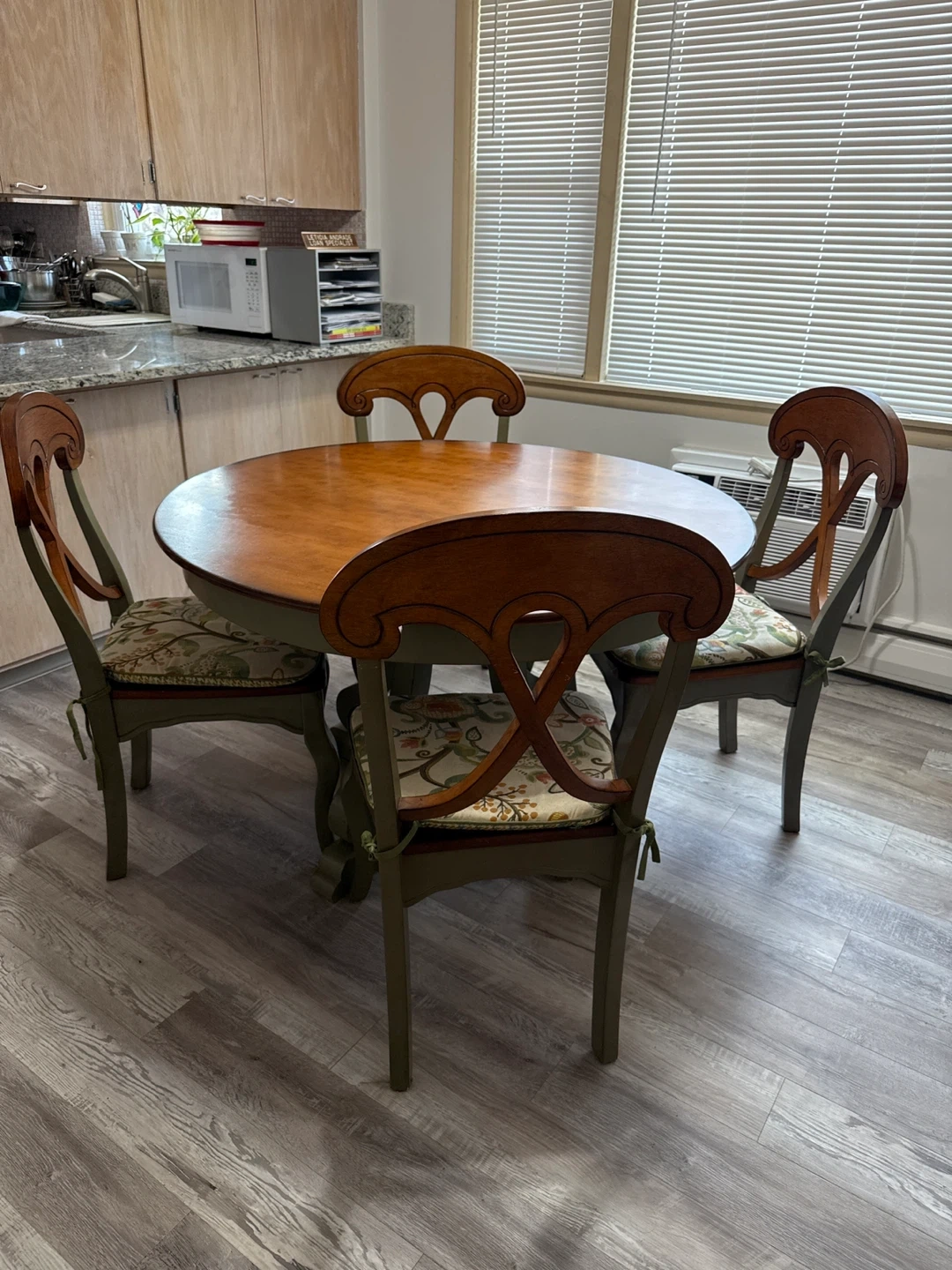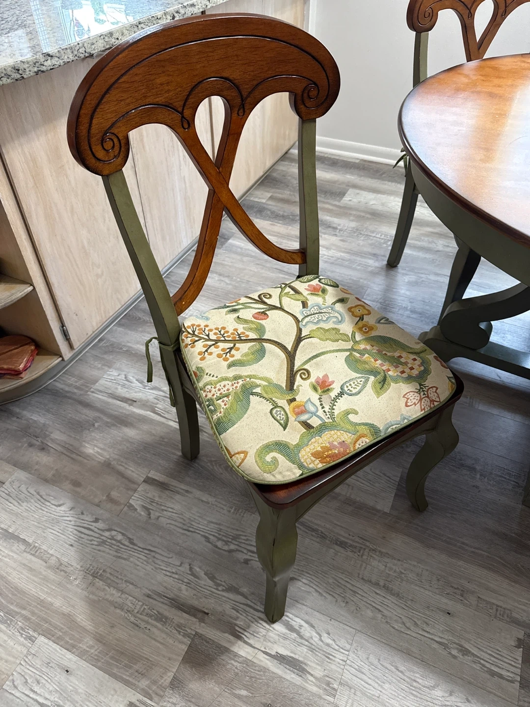 Pier 1 Imports Dining Table with 4 Chairs. Selling a Pier 1 Imports dining table with four chairs. The table is round and features a wooden top with a green base. The chairs have a decorative back and patterned cushions. It's a great set for a dining area or kitchen! 47.5 inches round X 30 inches height