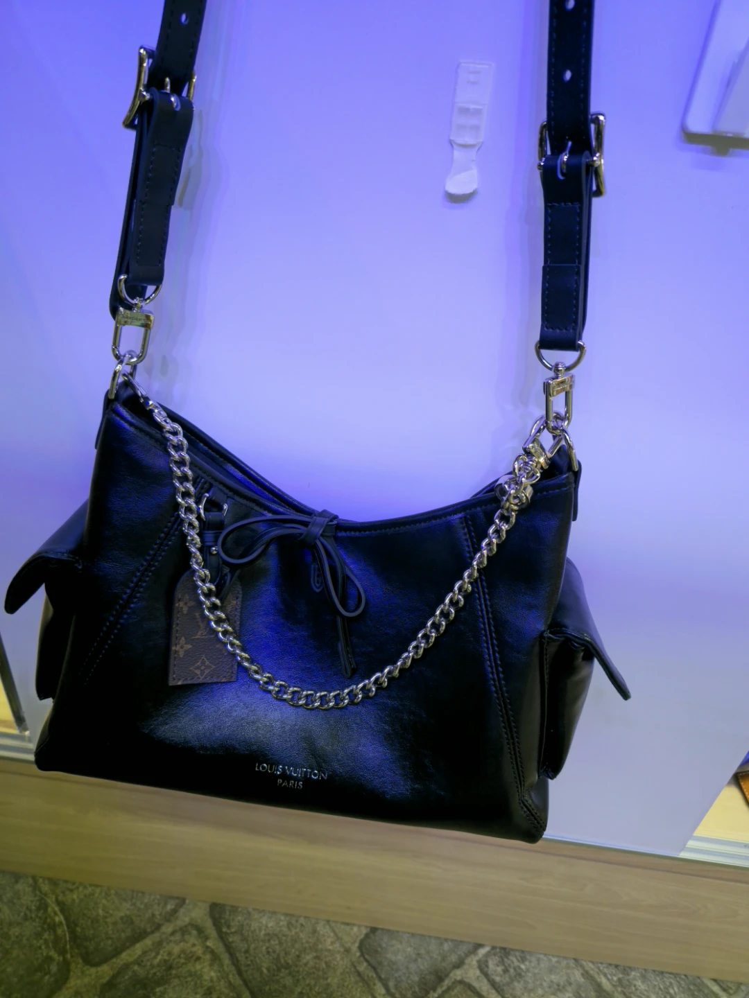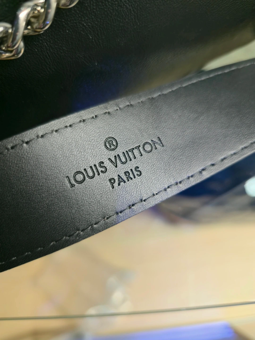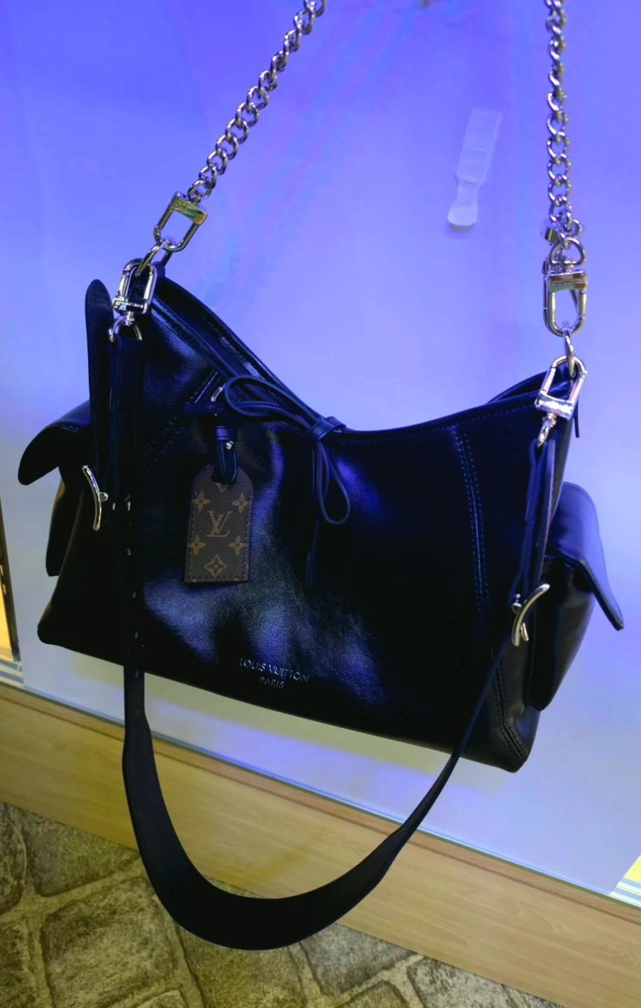 Brand New. Selling a stylish Louis Vuitton shoulder bag in black leather. It features a chain detail and the classic Louis Vuitton logo pattern with verification numbers.