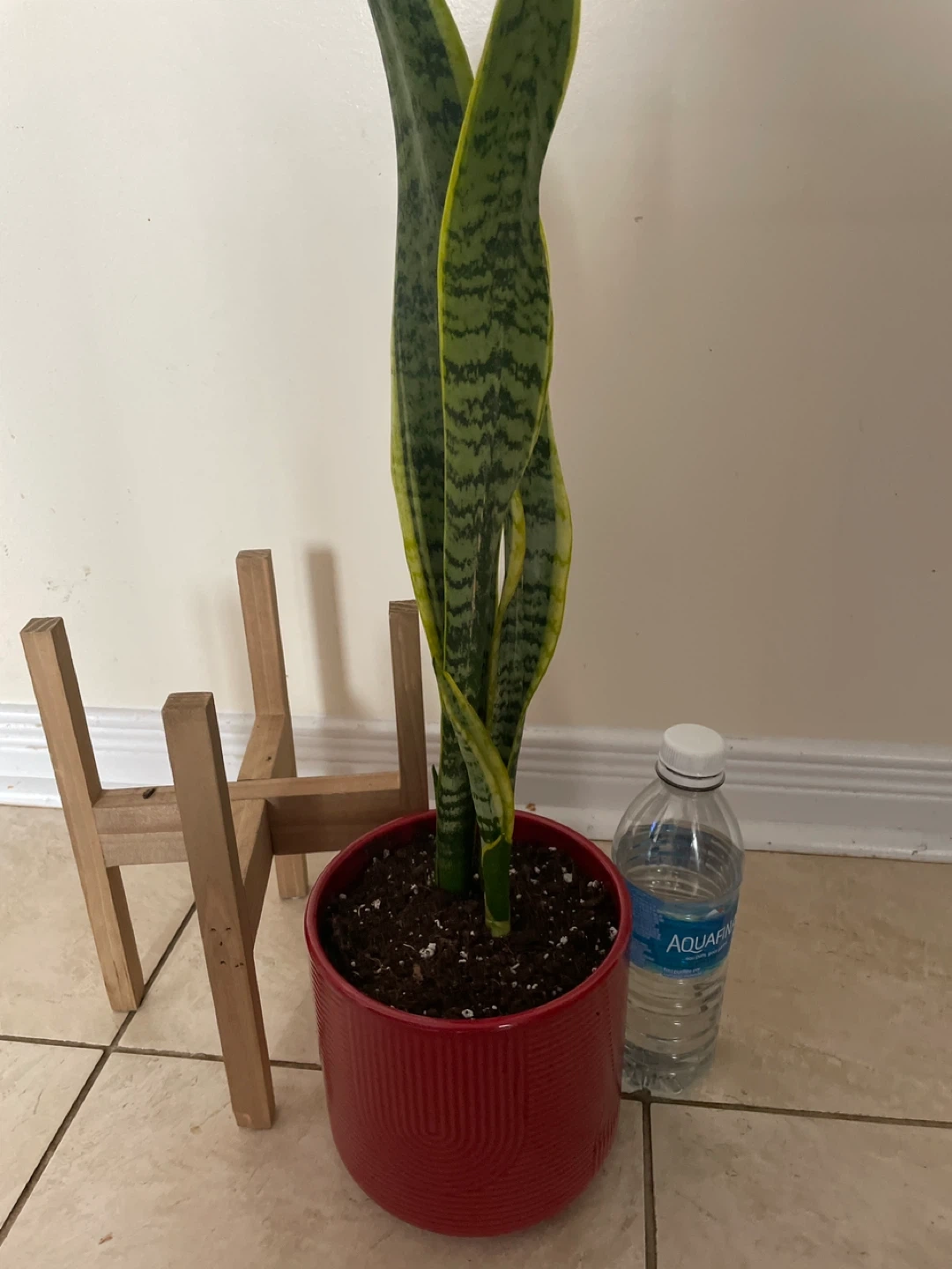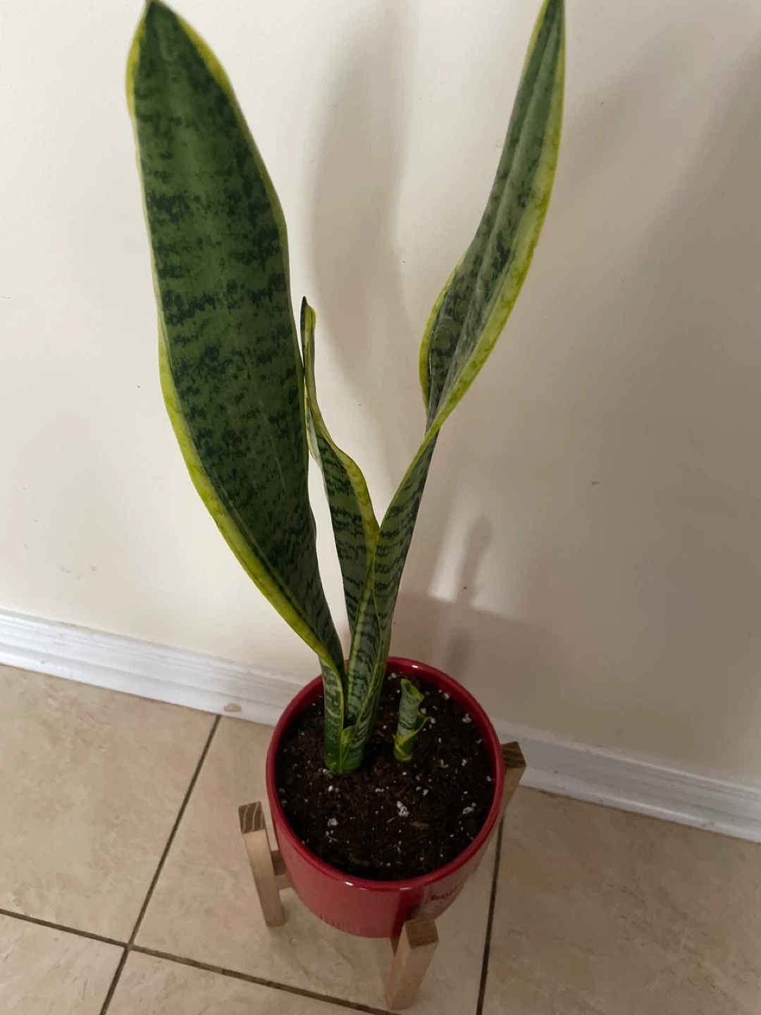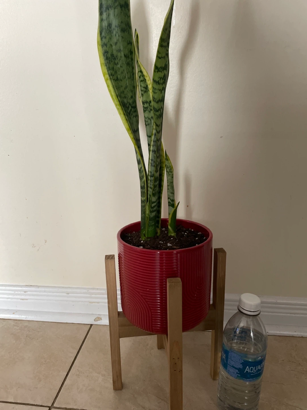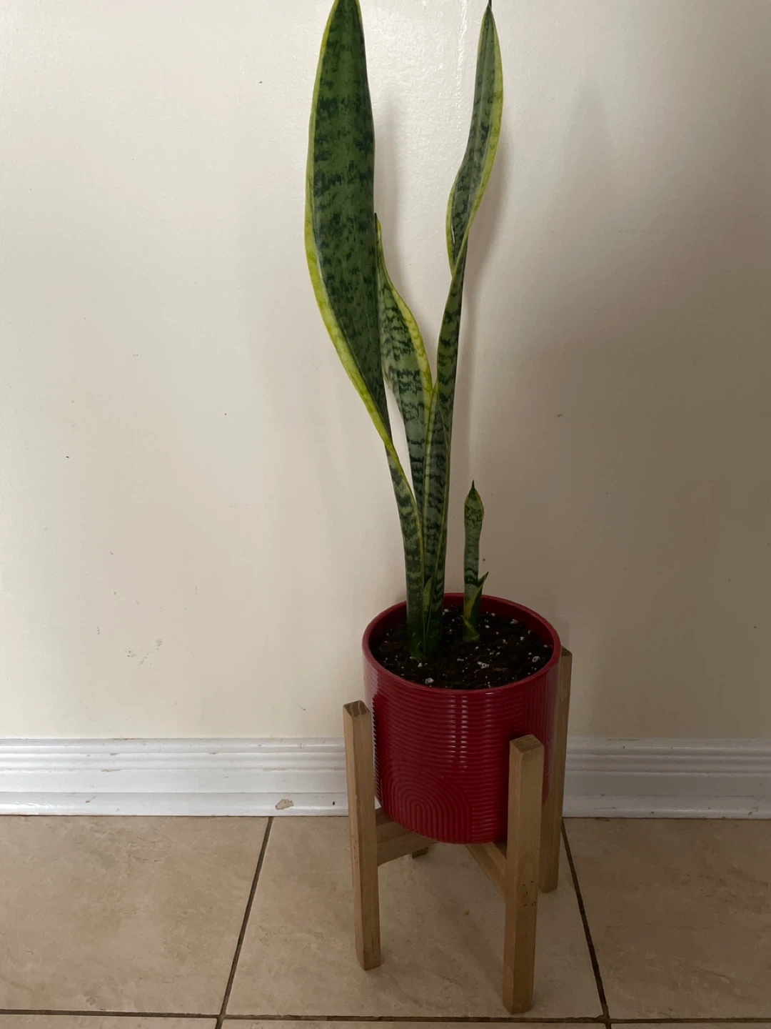 Selling a healthy snake plant potted in a vibrant red ceramic pot with a wooden stand. It's a great addition to any home or office space!