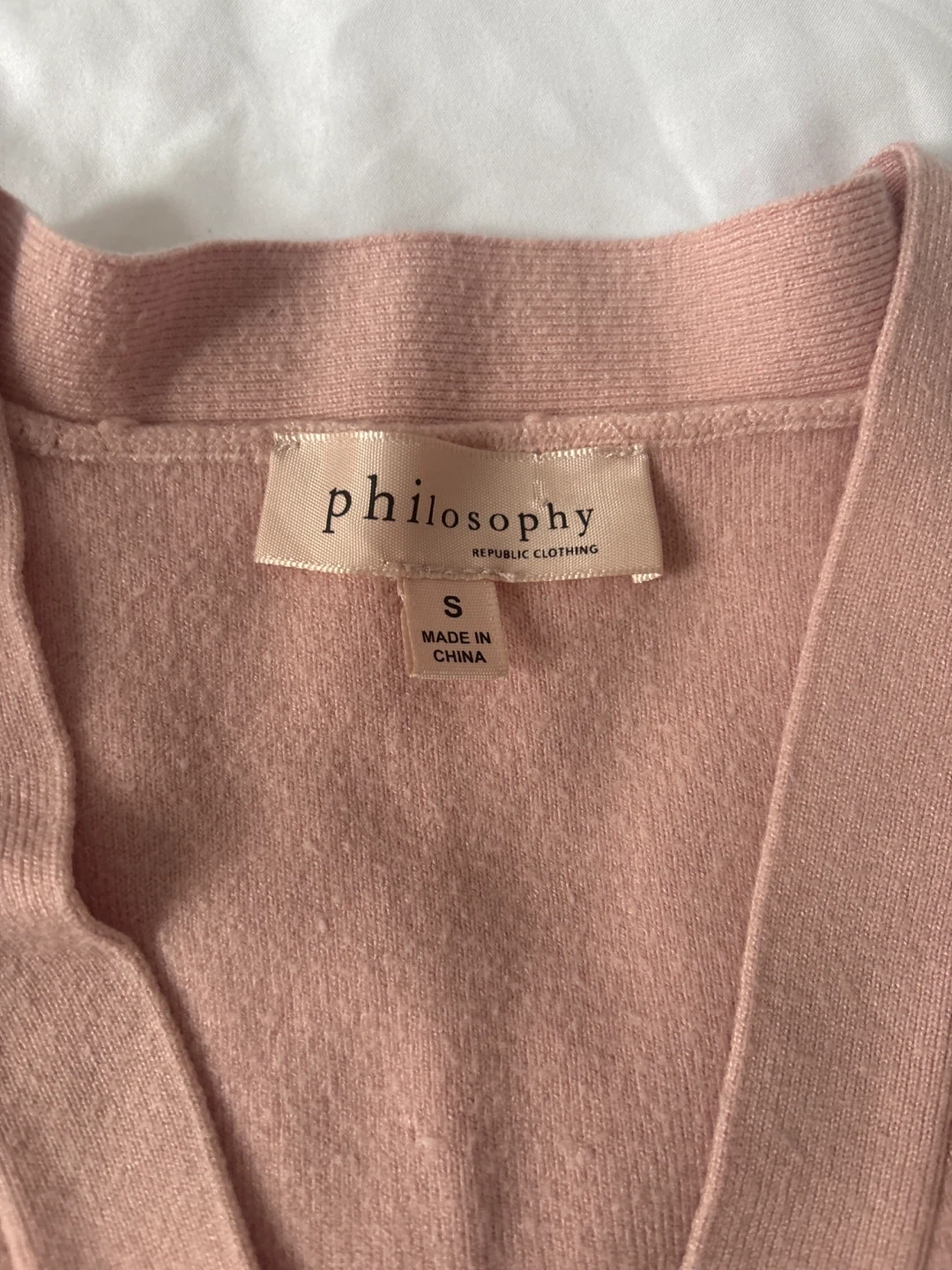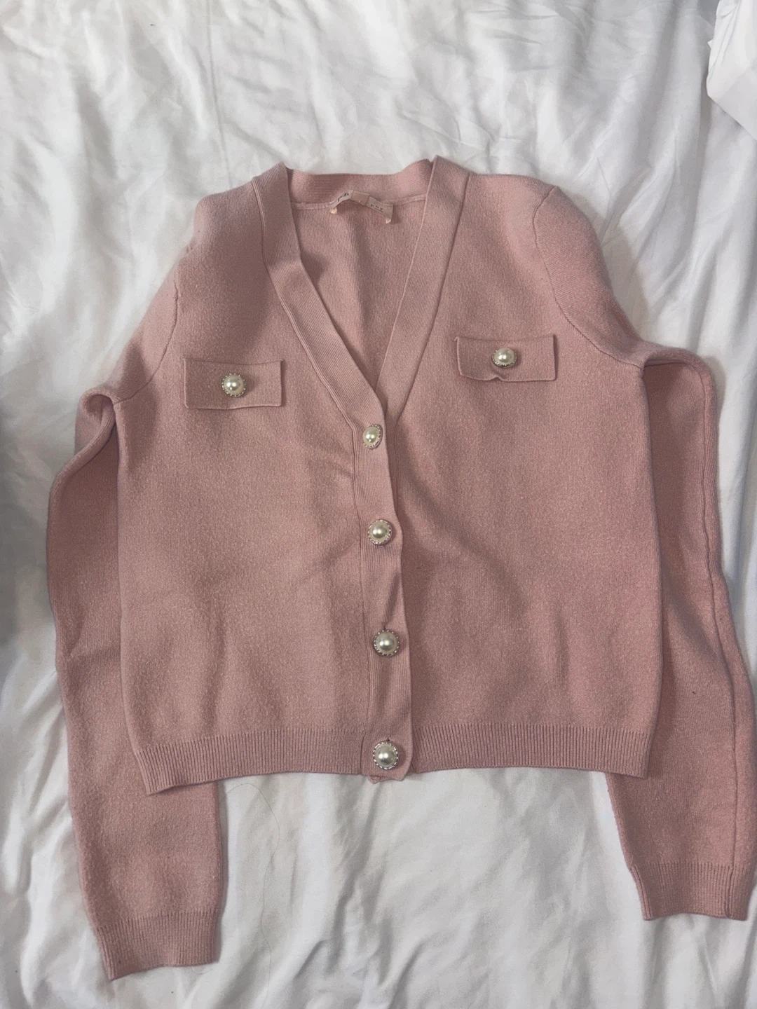 Selling a cute pink cardigan! It has pearl-like buttons and small decorative pockets. It's in great condition and would be a lovely addition to your wardrobe