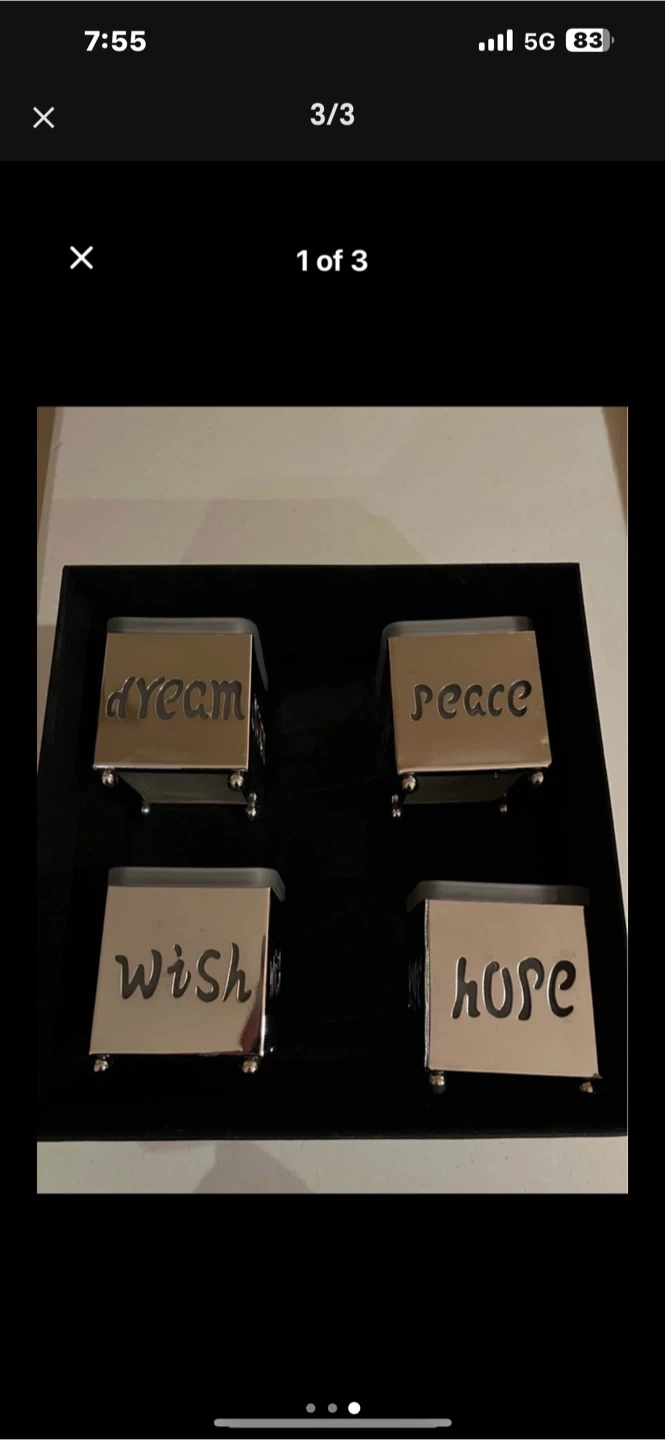 Selling a set of four silver candle holders. Each one has a different word on it: Dream, Peace, Wish, and Hope. They're in great shape and would look lovely in any room!