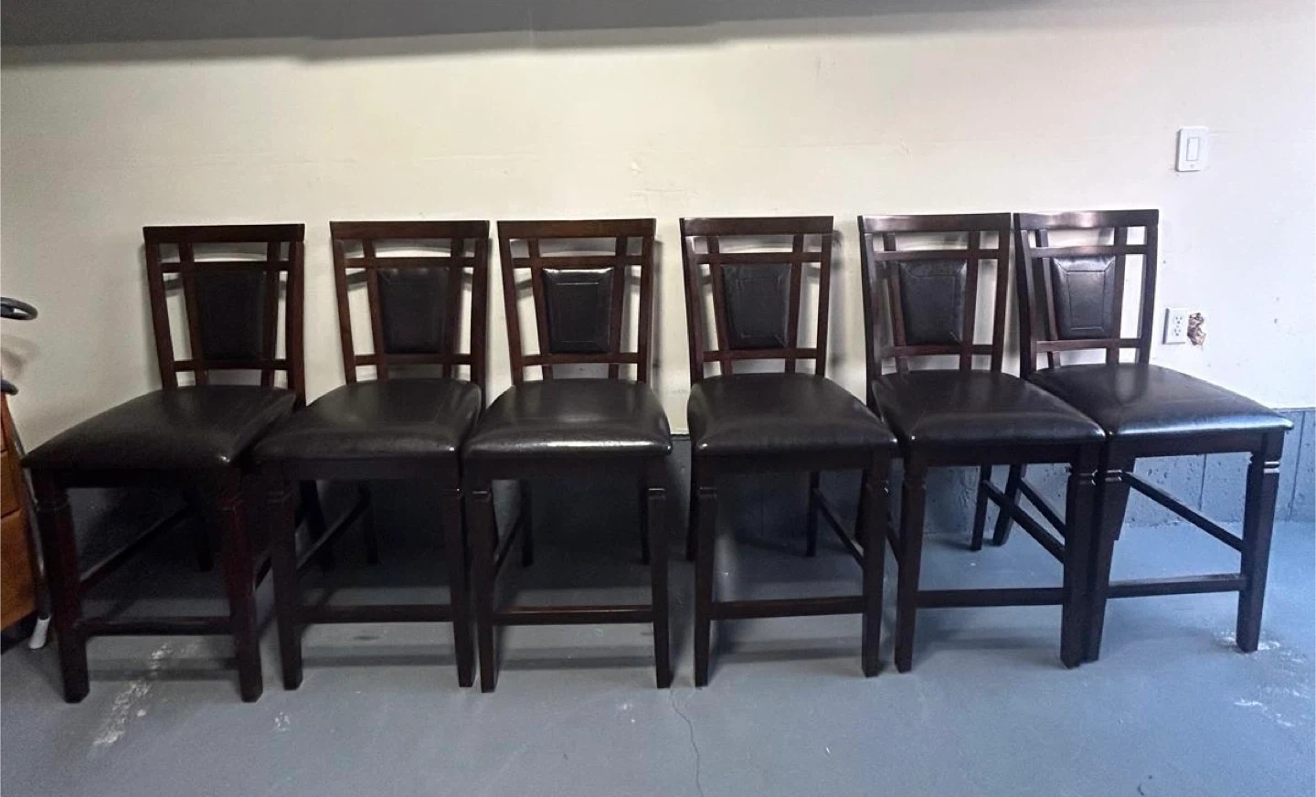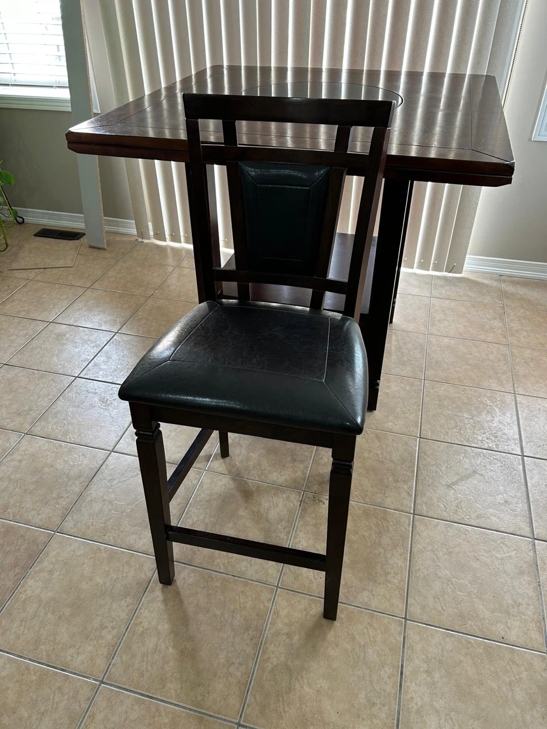 Selling a dark wood dining table that comes with six matching chairs. The table features a unique center design, and the chairs are bar-height, perfect for a kitchen island or a raised dining area. This set would be a great addition to any home!
