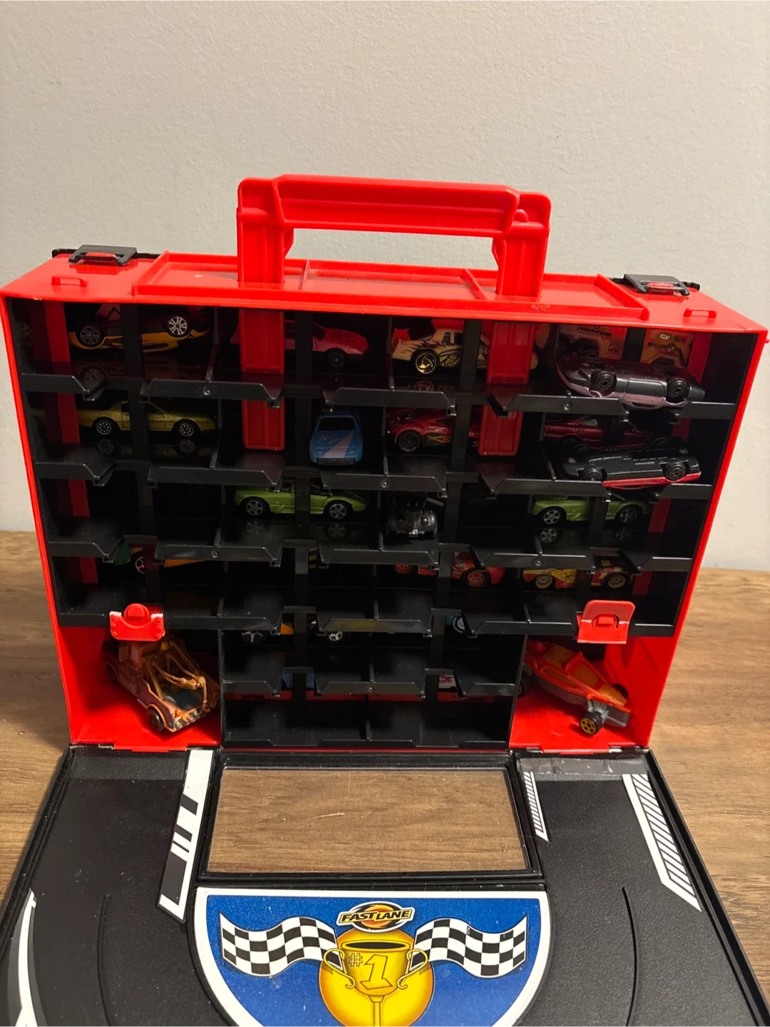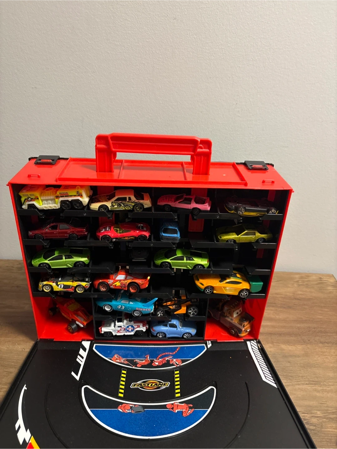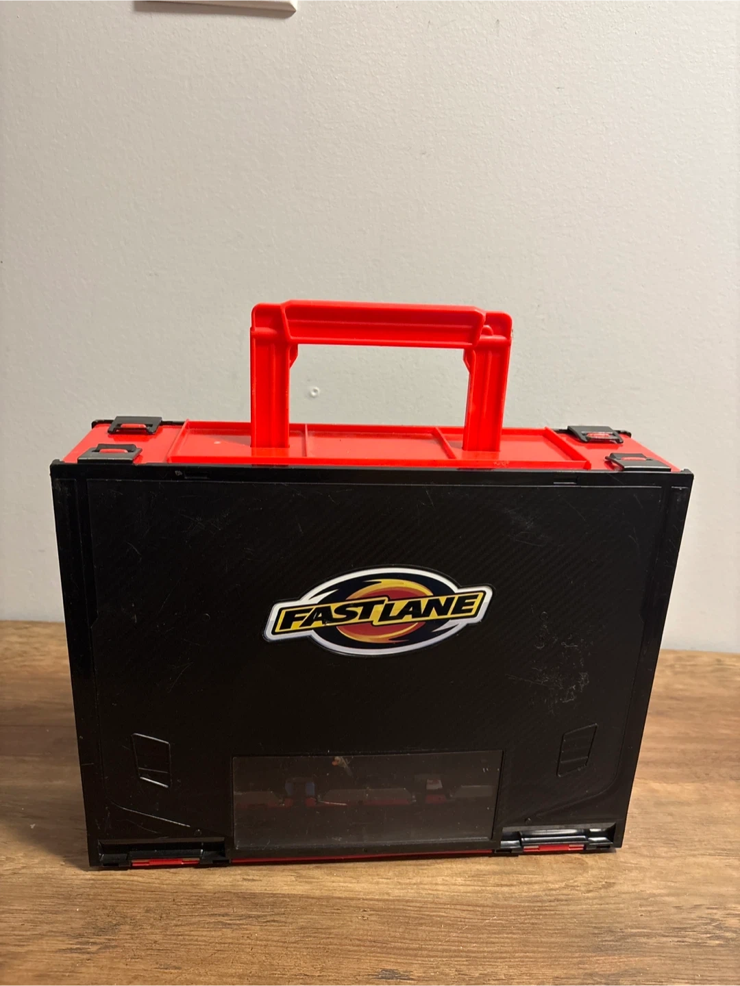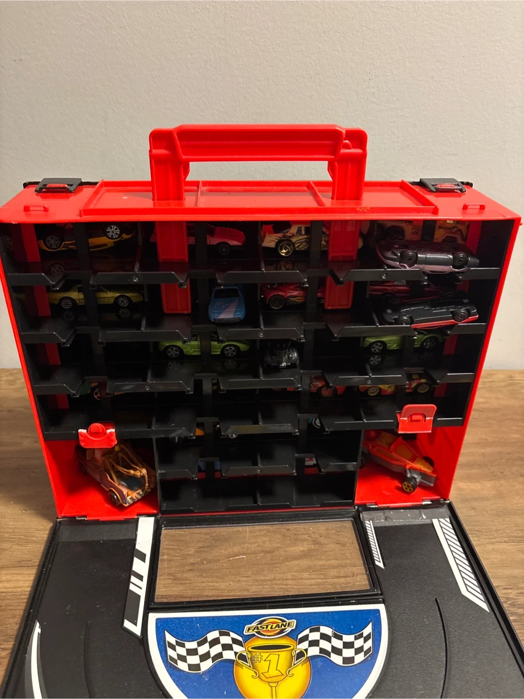 Selling a Fast Lane car carrier case that comes with a variety of cars! The case is red and black and holds a lot of toy cars. Perfect for keeping your little one's collection organized!