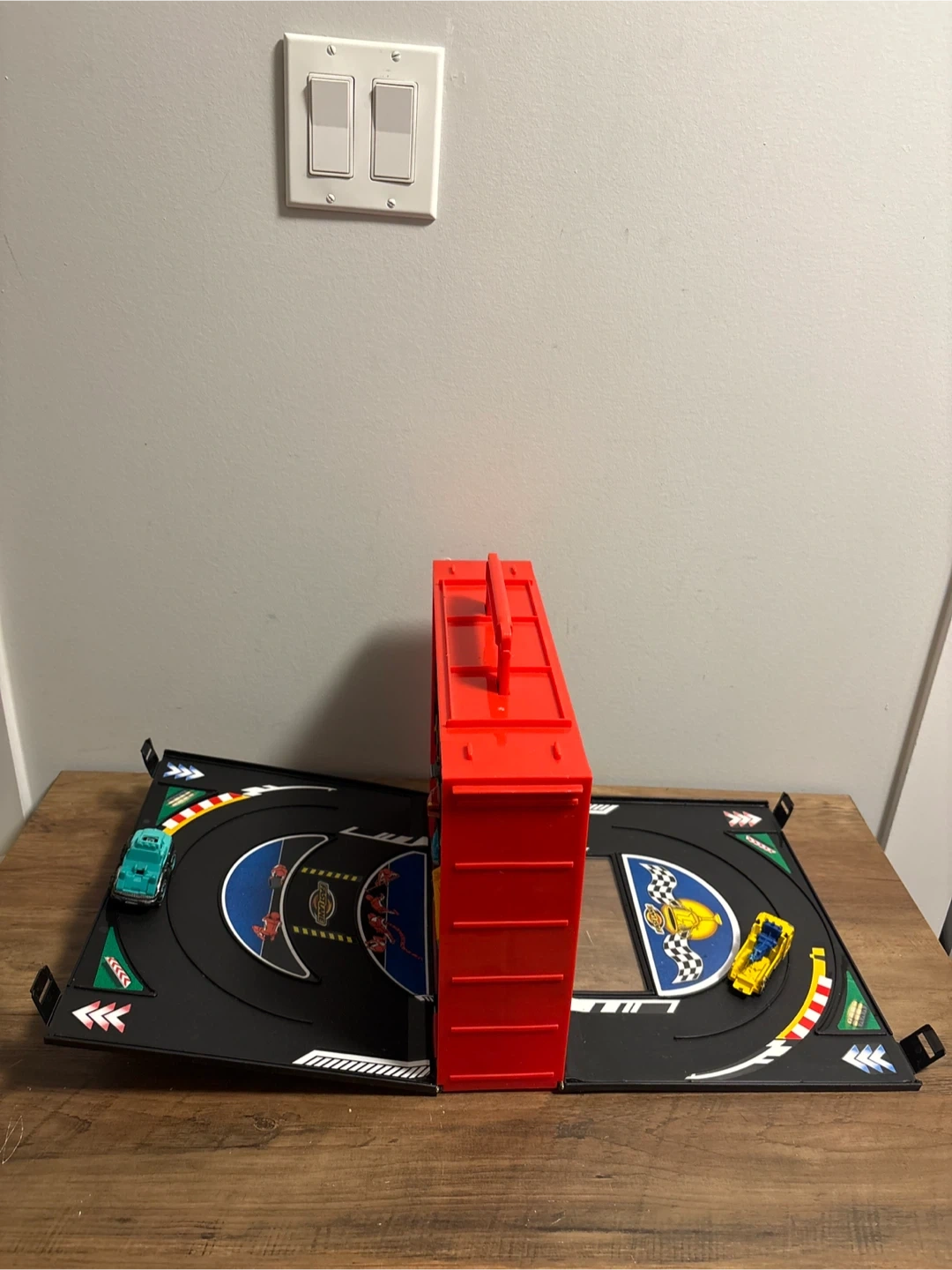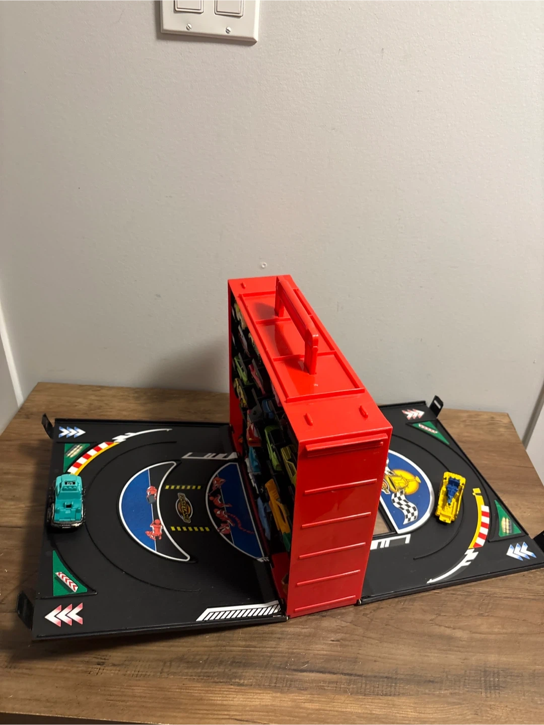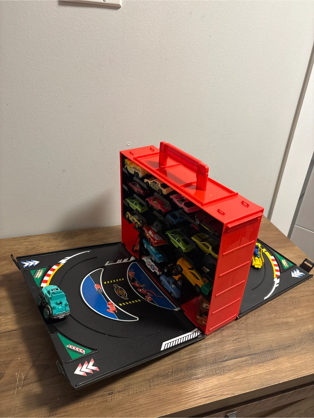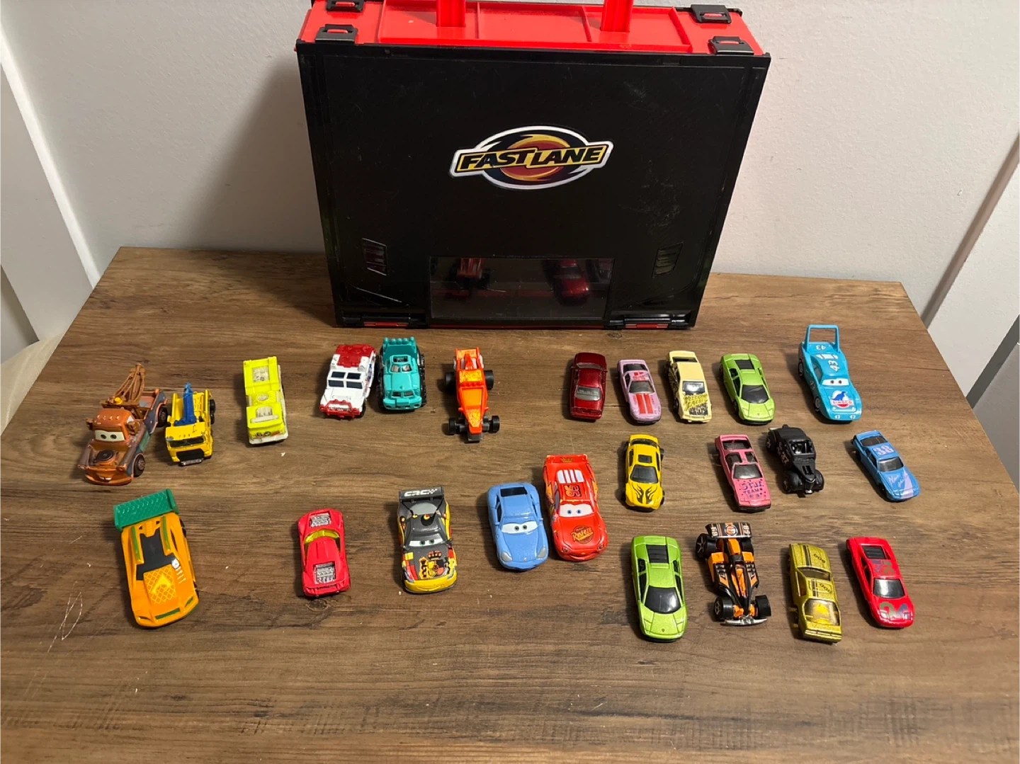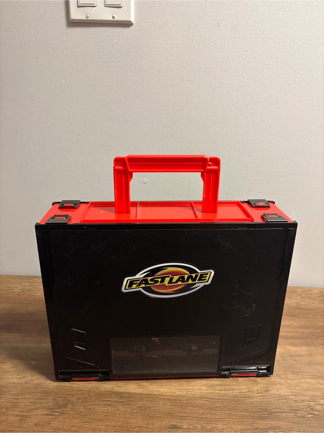 Selling a Fast Lane car carrier case that comes with a variety of cars! The case is red and black and holds a lot of toy cars. Perfect for keeping your little one's collection organized!