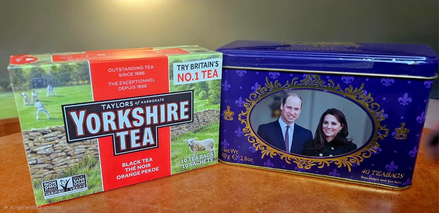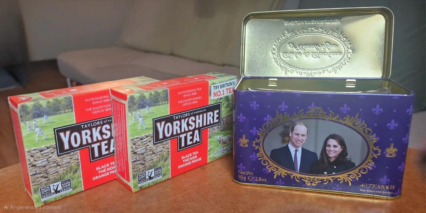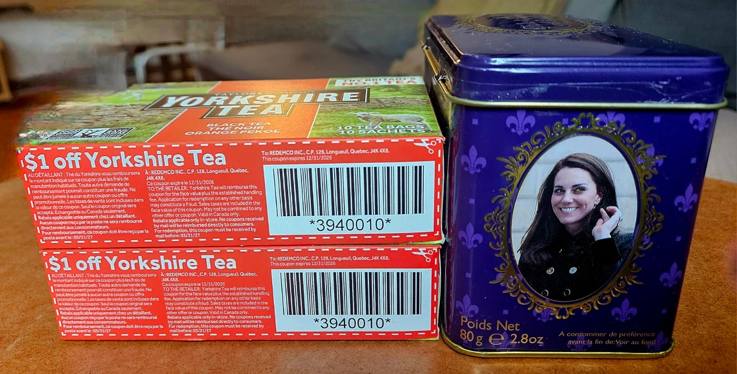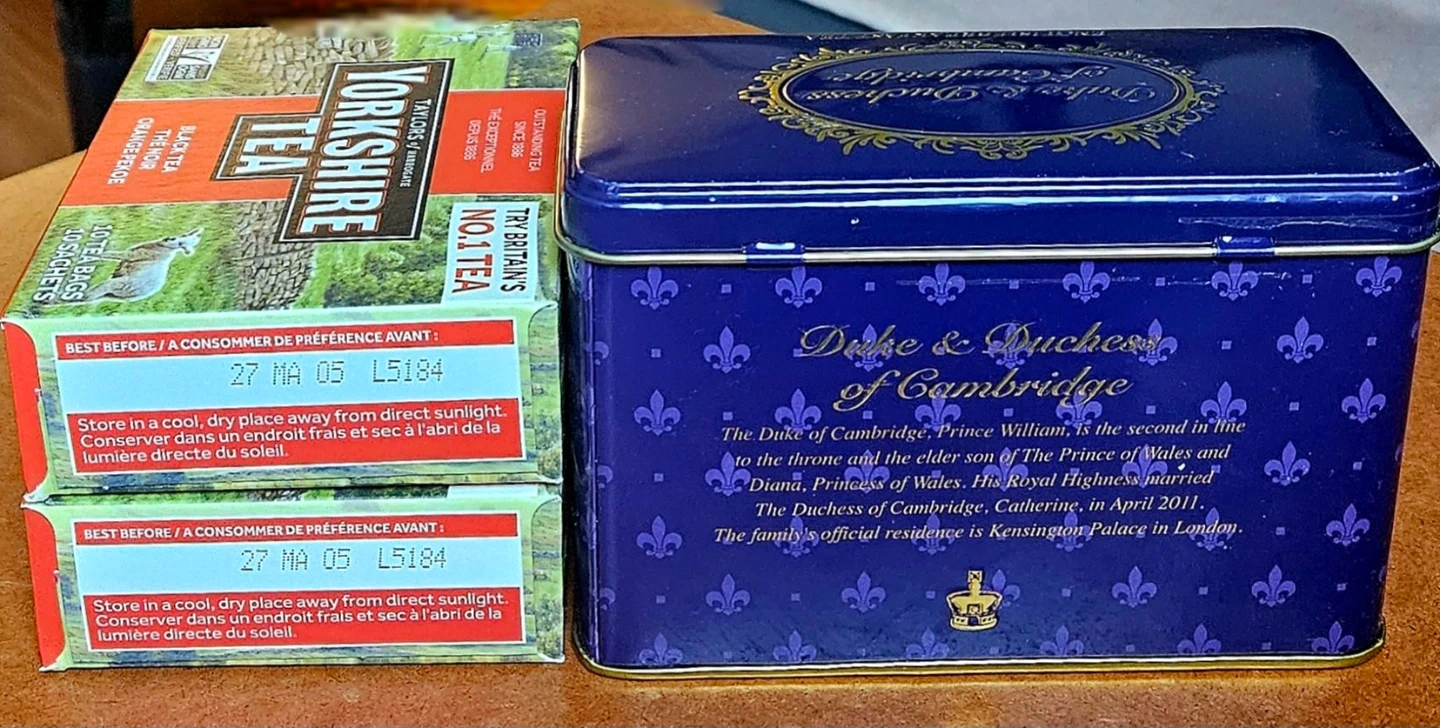 Selling two boxes of Yorkshire Tea (Black Tea Orange Pekoe, 10 tea bags each, Expiry May 5, 2027) and a dozen green tea bags with a commemorative Duke and Duchess of Cambridge tin (40 teabags). The Yorkshire Tea boxes include a $1 off coupon expiring 2025 December 31.