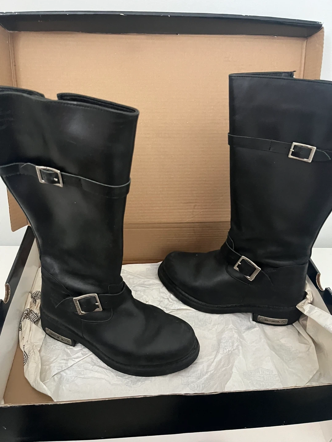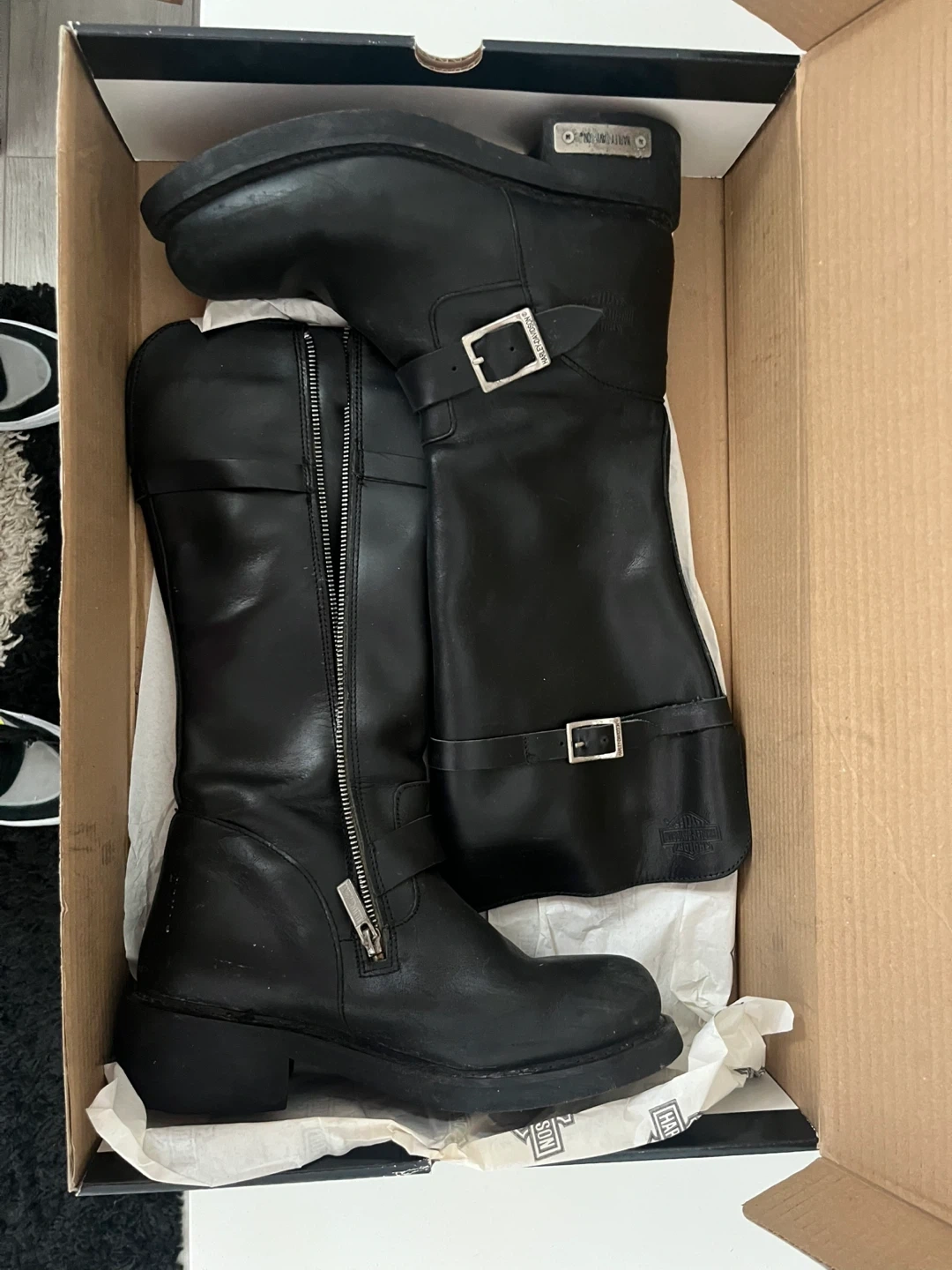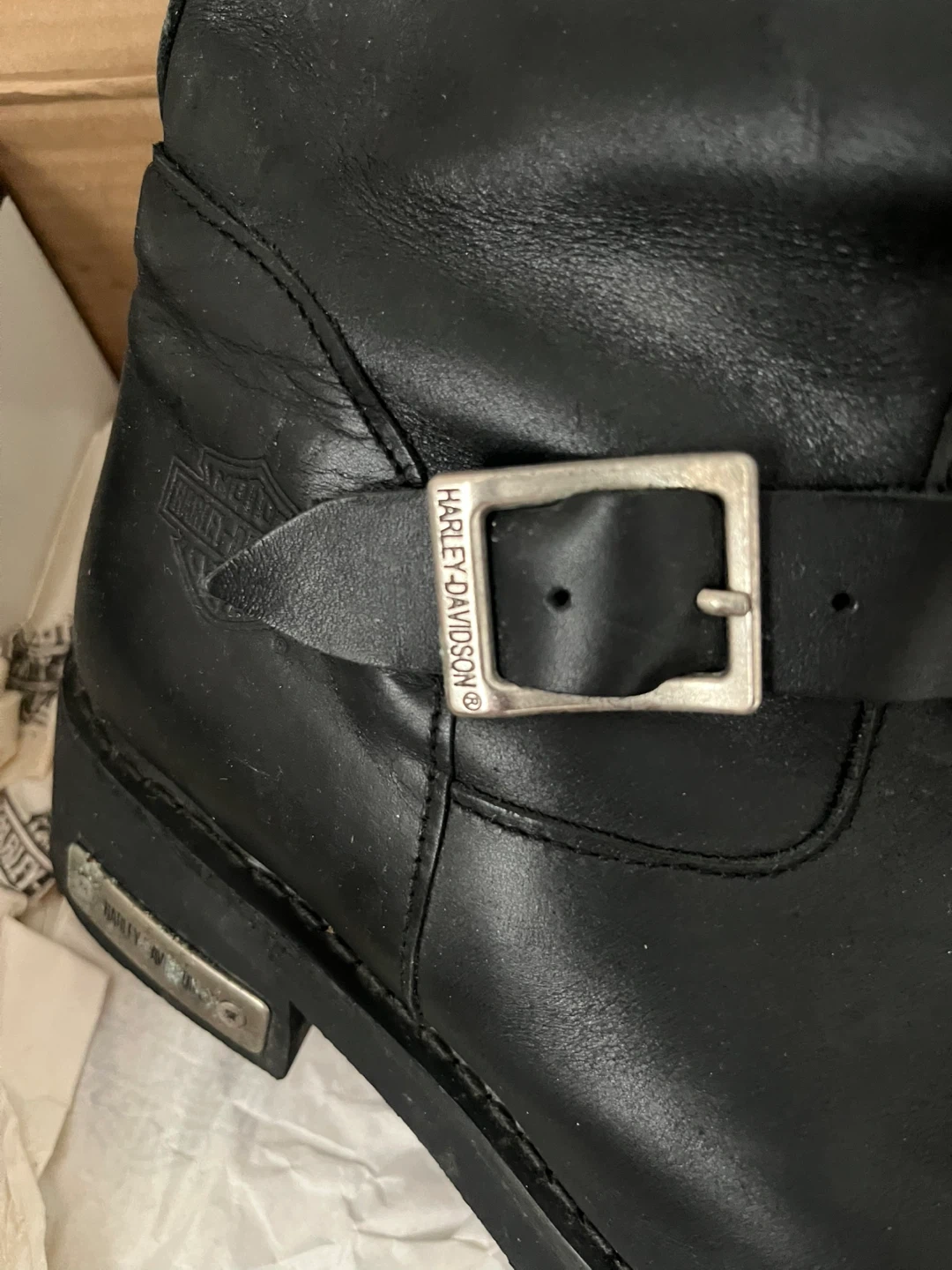 Selling a pair of Harley-Davidson motorcycle boots in black leather. They come with the original box. These boots are perfect for anyone looking for a stylish and durable pair of riding boots!