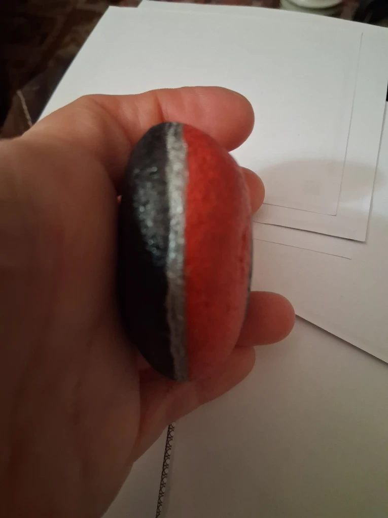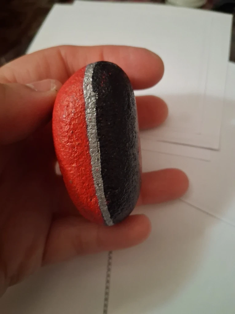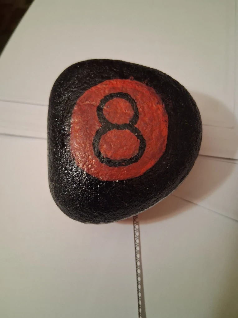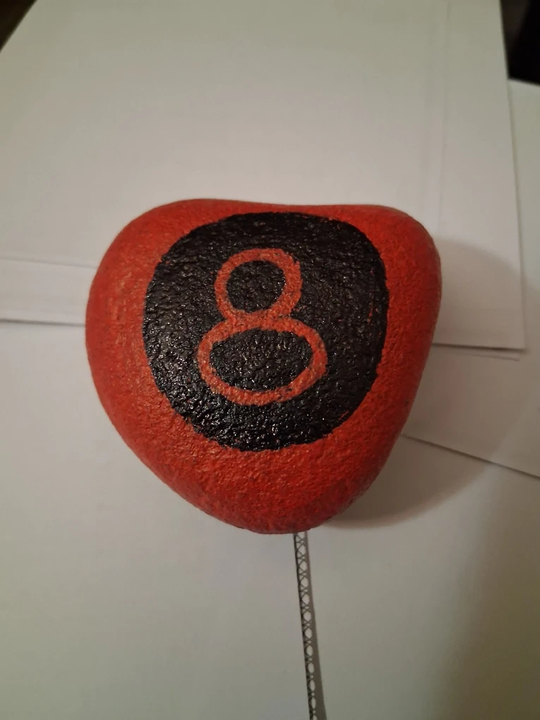 Here's a hand-painted rock with an 8 ball design. It's painted with a split color scheme of black and red. The number 8 is painted on both sides.