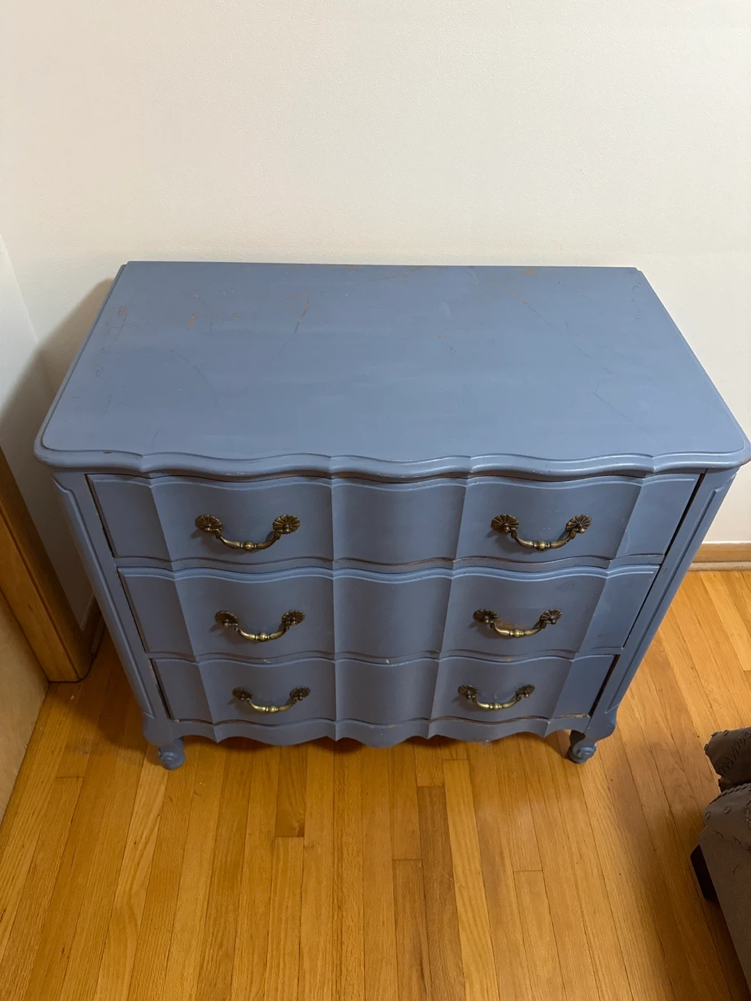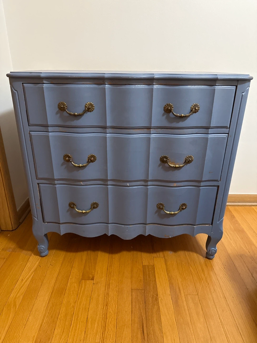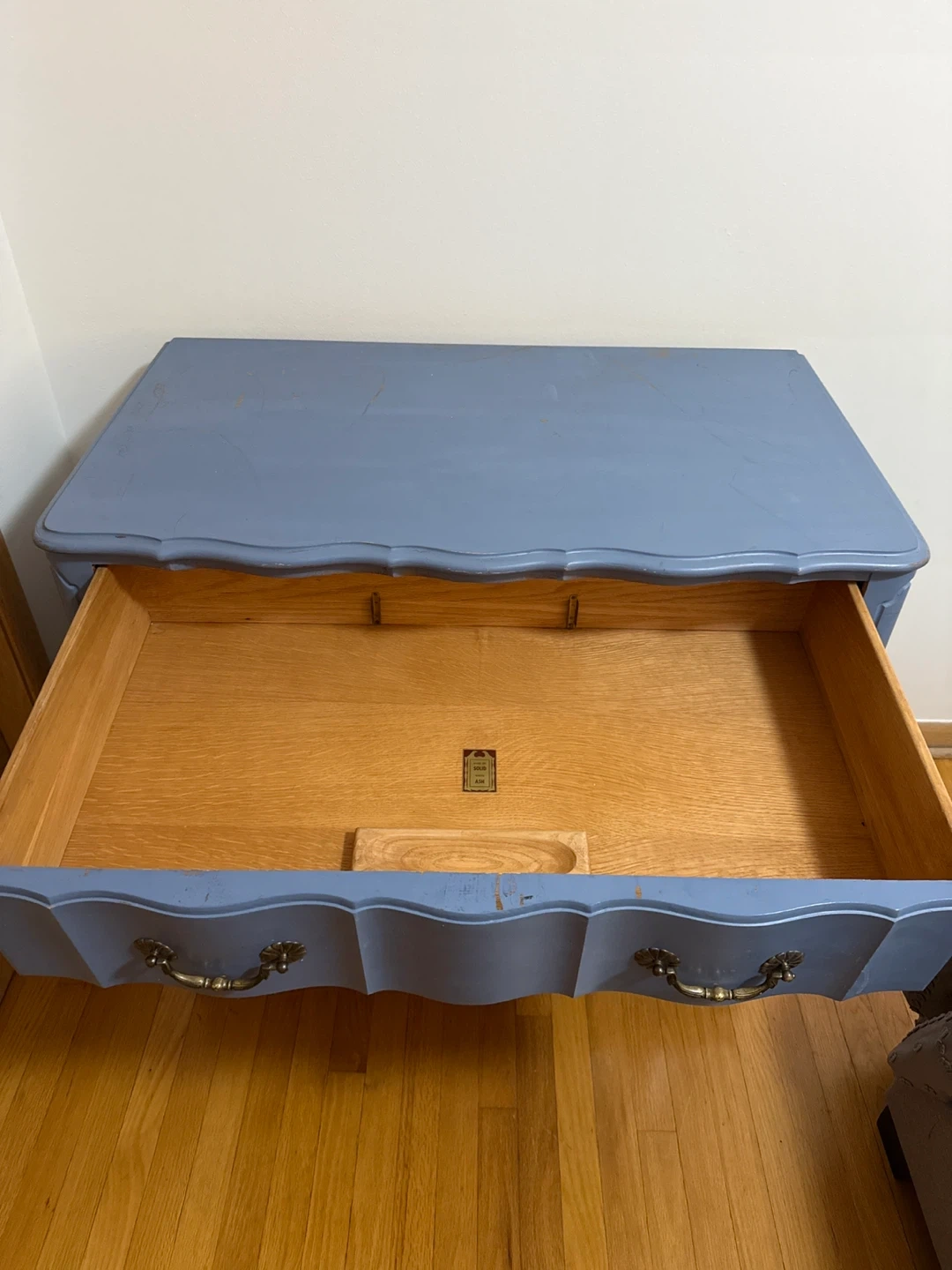 Blue Solid White Ash Dresser Selling a charming blue dresser made of solid white ash. It features a classic design with ornate handles. It has some signs of wear. This is a great opportunity to refinish this gem great wood underneath the blue paint. Dimensions 36.5 W X 21D X 34.5 H