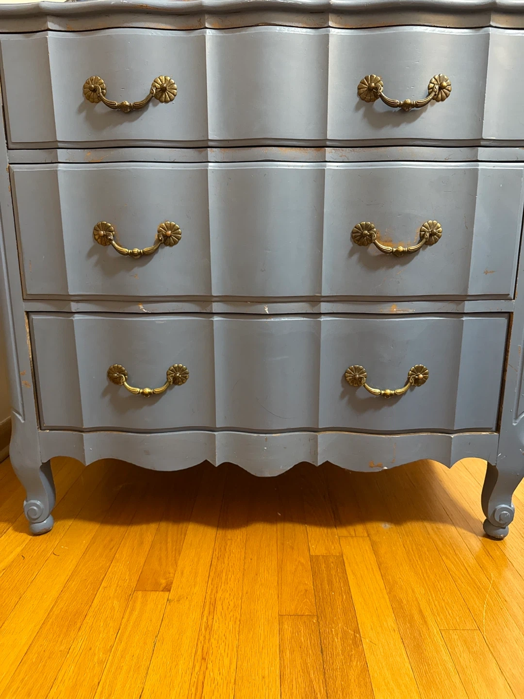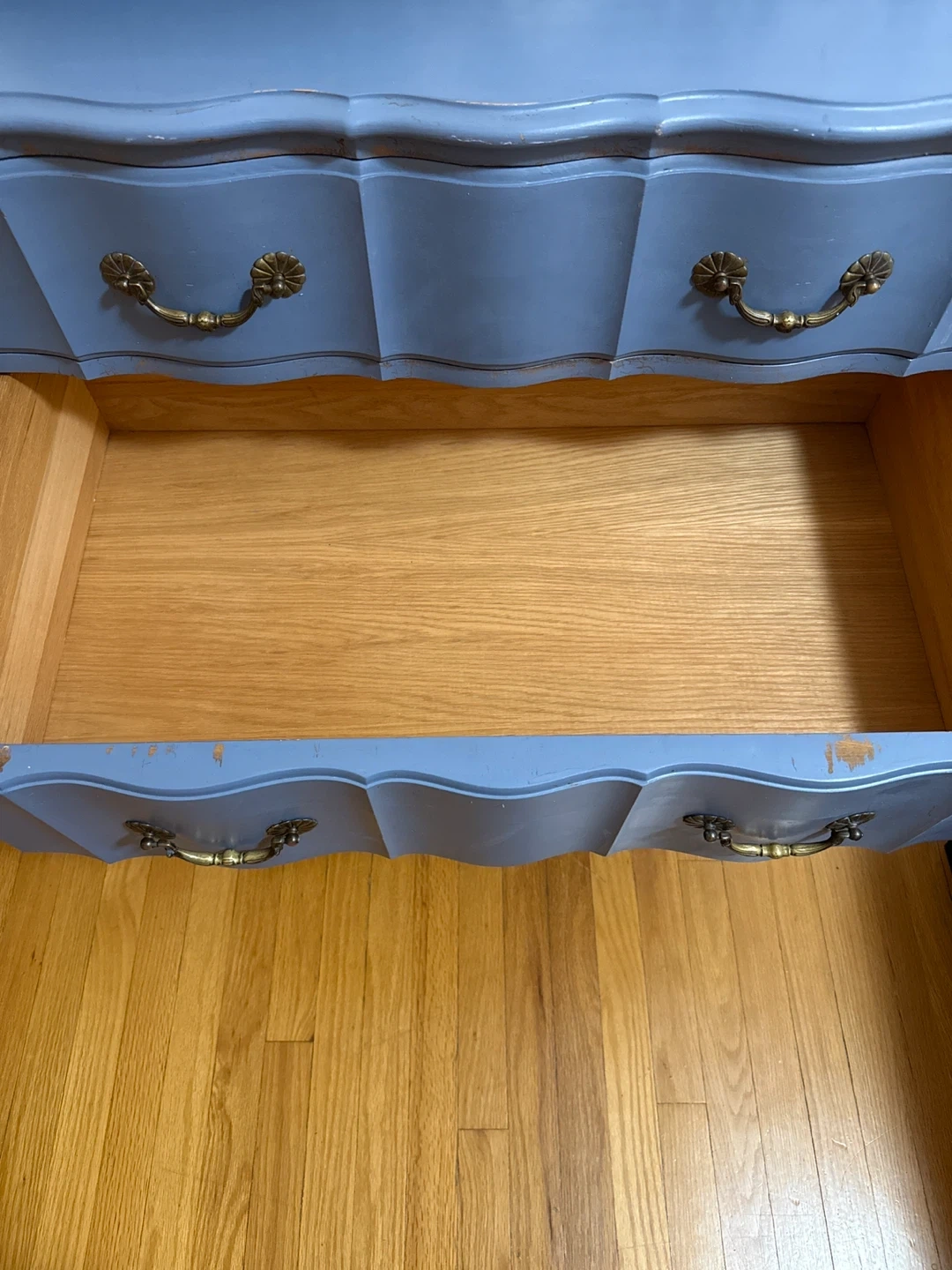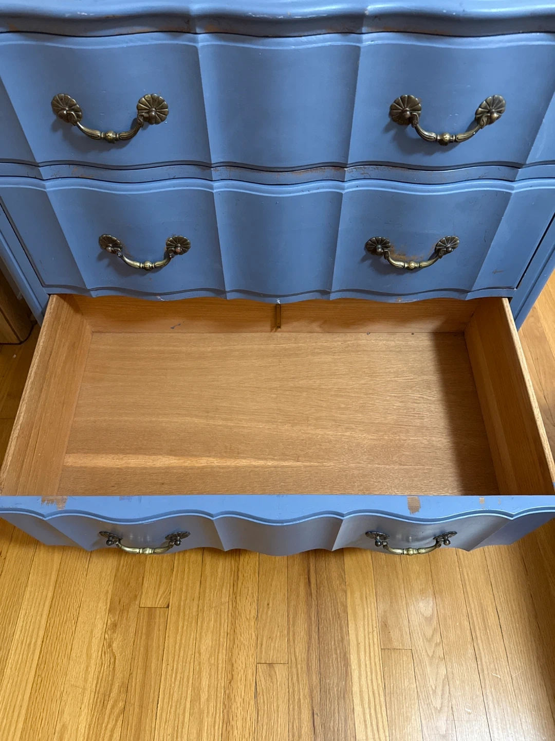 Blue Solid White Ash Dresser Selling a charming blue dresser made of solid white ash. It features a classic design with ornate handles. It has some signs of wear. This is a great opportunity to refinish this gem great wood underneath the blue paint. Dimensions 36.5 W X 21D X 34.5 H