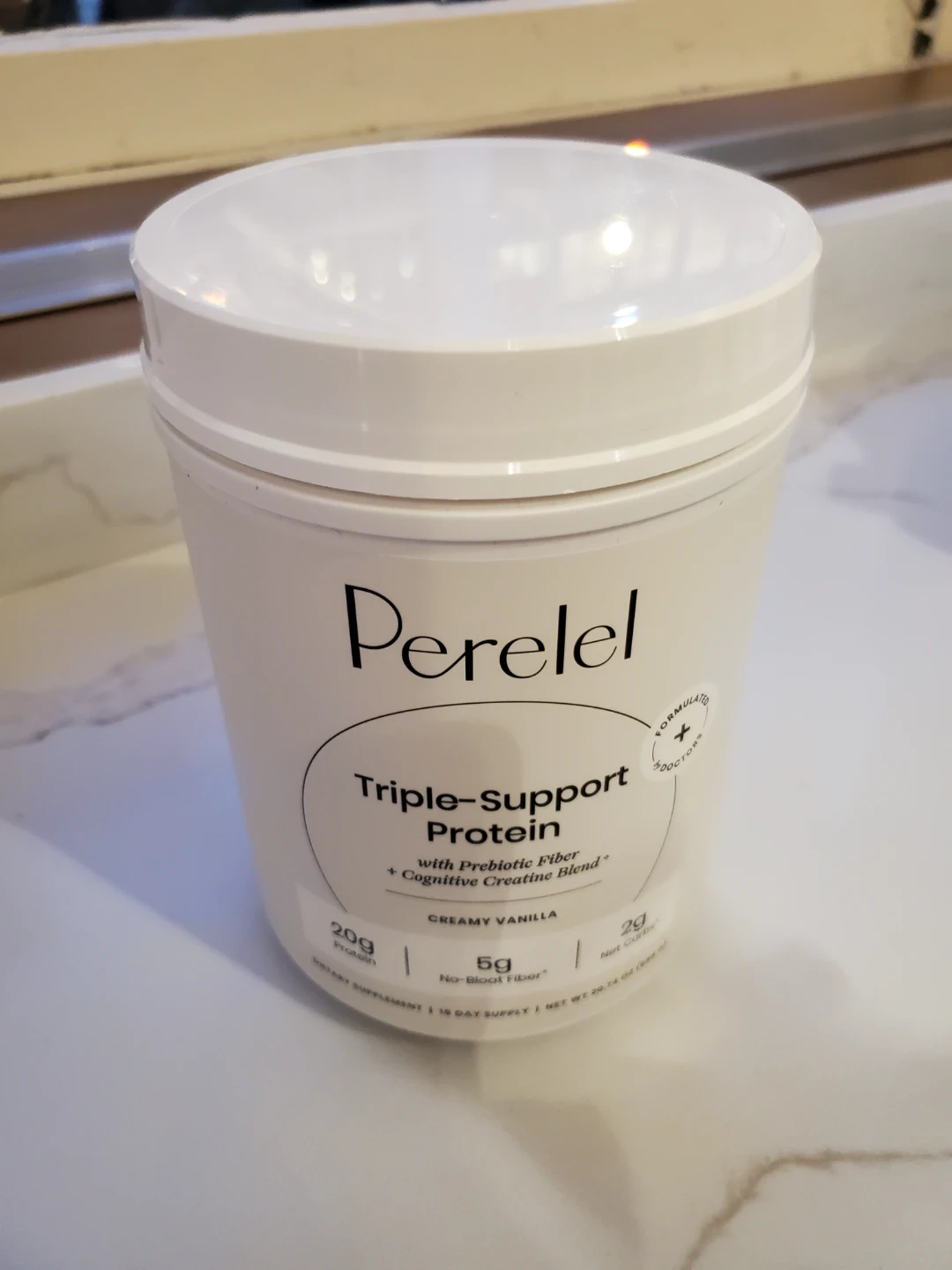 Selling a container of Perelel Triple-Support Protein in Creamy Vanilla flavor. This protein powder includes prebiotic fiber and a cognitive creatine blend. Each serving contains 20g of protein and 5g of No-Bloat Fiber