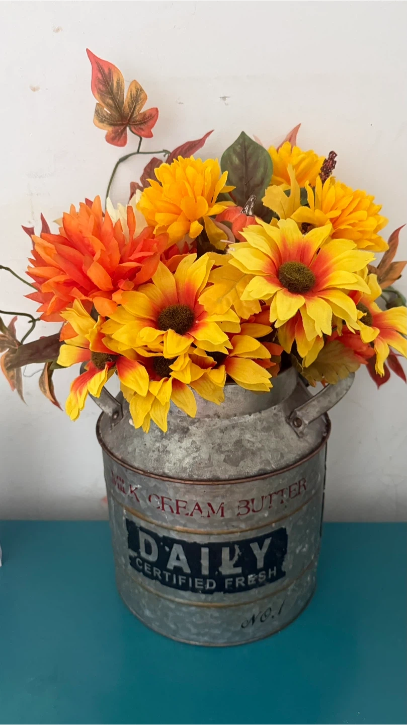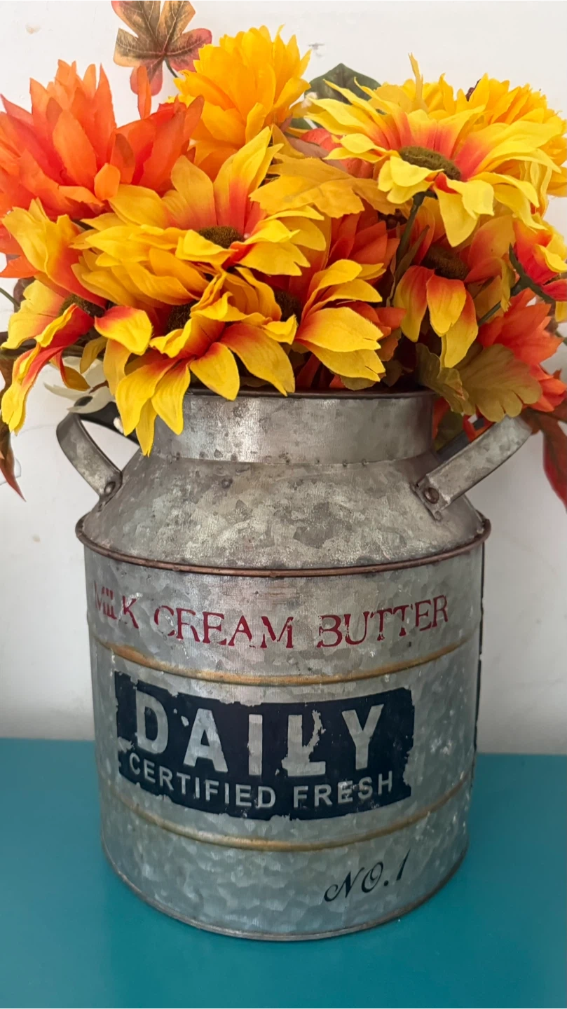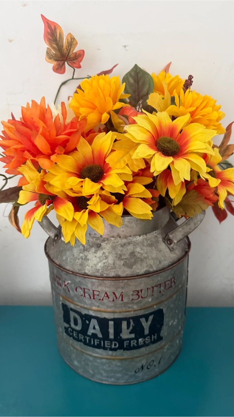 This is a beautiful floral arrangement featuring orange and yellow flowers, arranged inside a vintage-style metal milk can. The can has the word "DAILY" printed on it. It would be a great addition to any home decor!