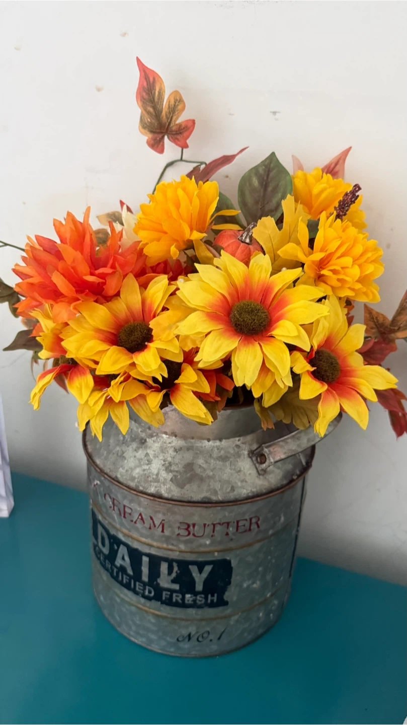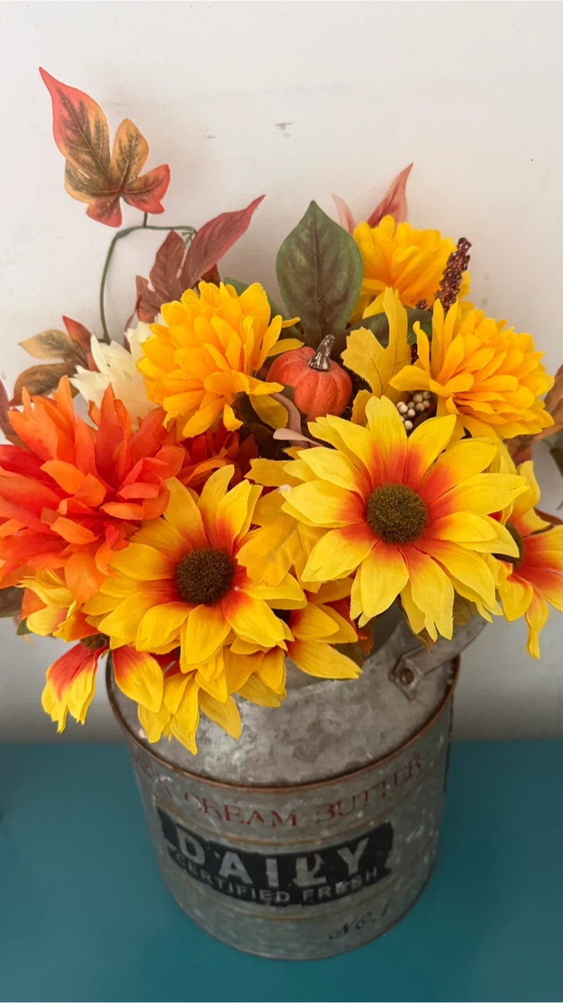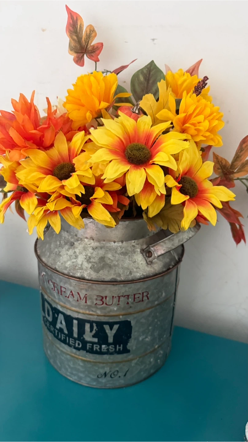 This is a beautiful floral arrangement featuring orange and yellow flowers, arranged inside a vintage-style metal milk can. The can has the word "DAILY" printed on it. It would be a great addition to any home decor!