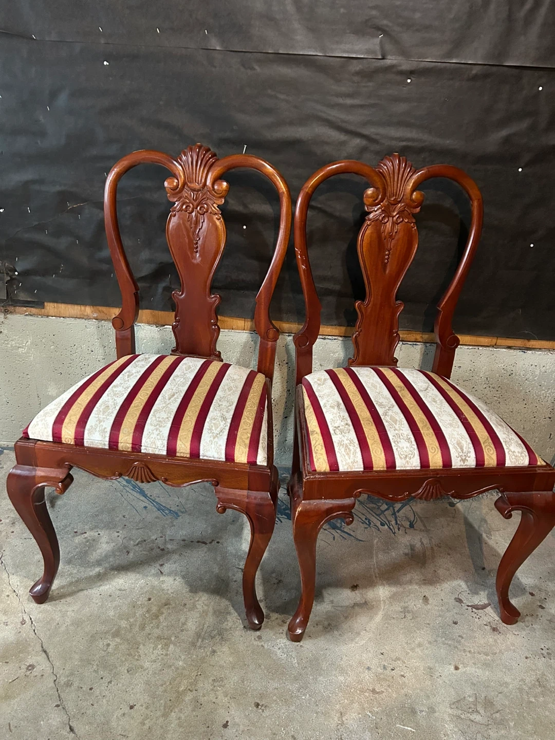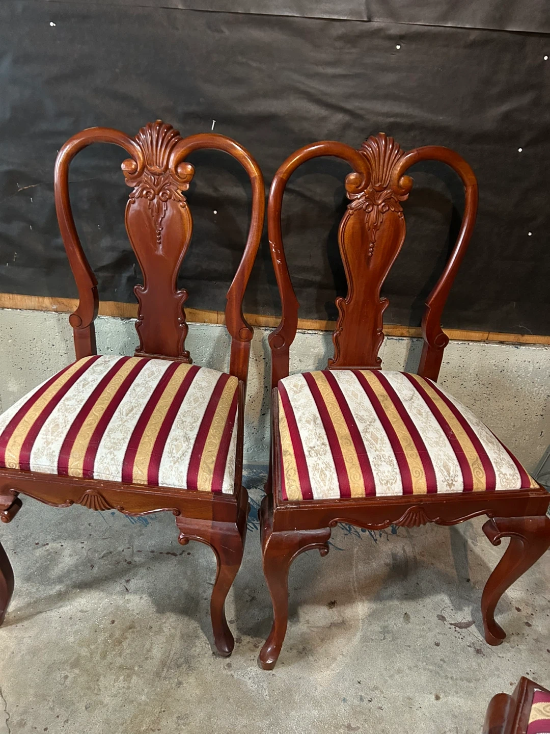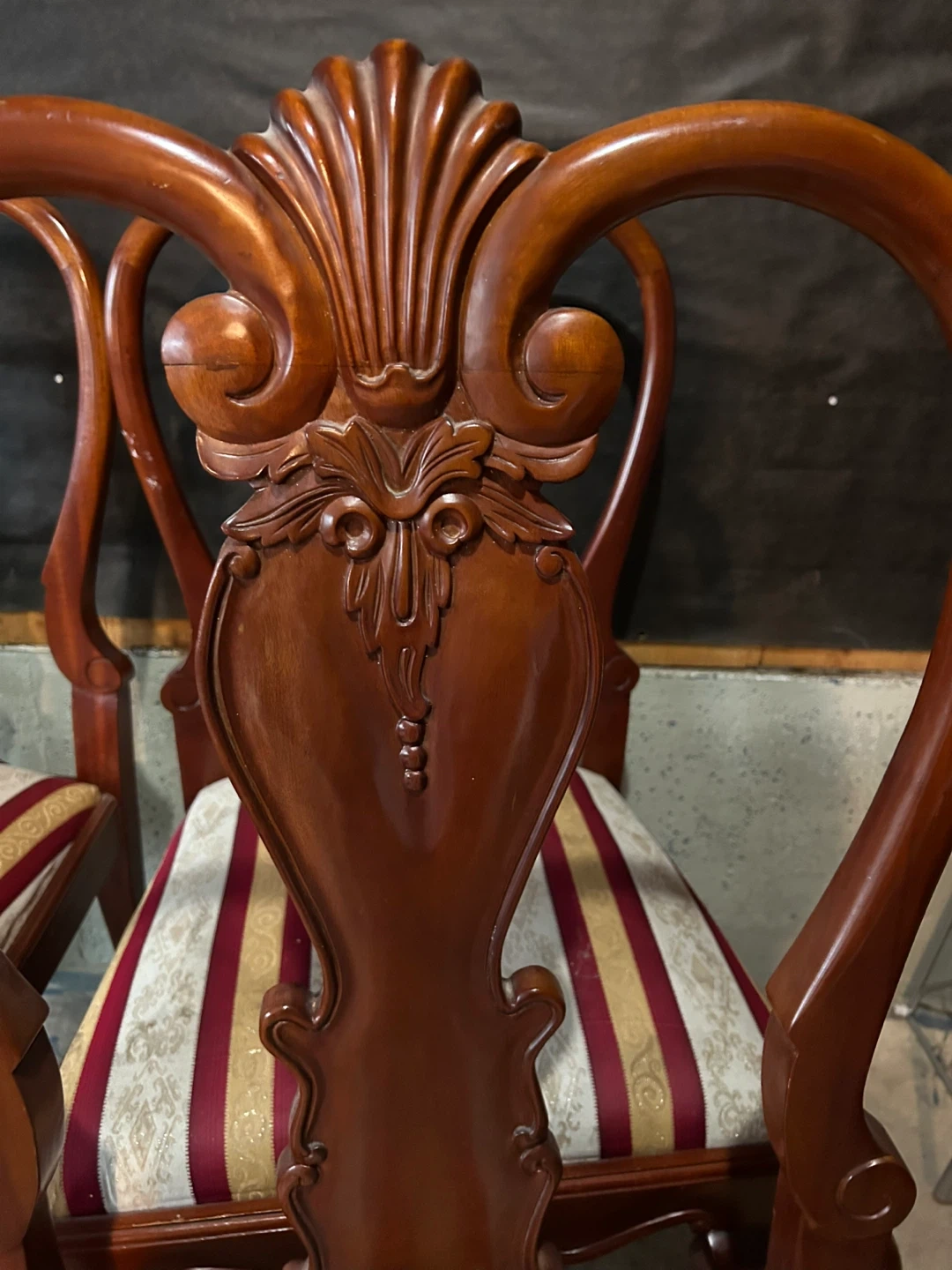Selling a set of four wooden dining chairs with a unique shell-shaped back design. They have striped seats in cream, red, and gold. Perfect for adding a touch of elegance to your dining space! They do have some minor scratches use them as they are or this could be your next project.