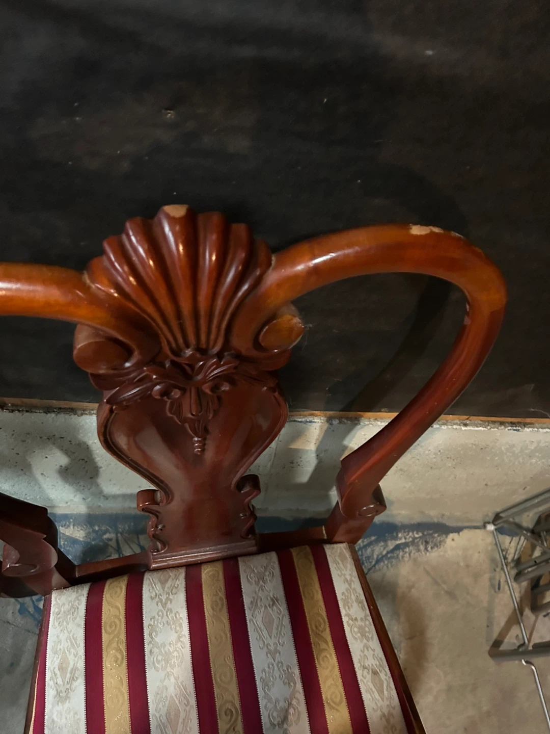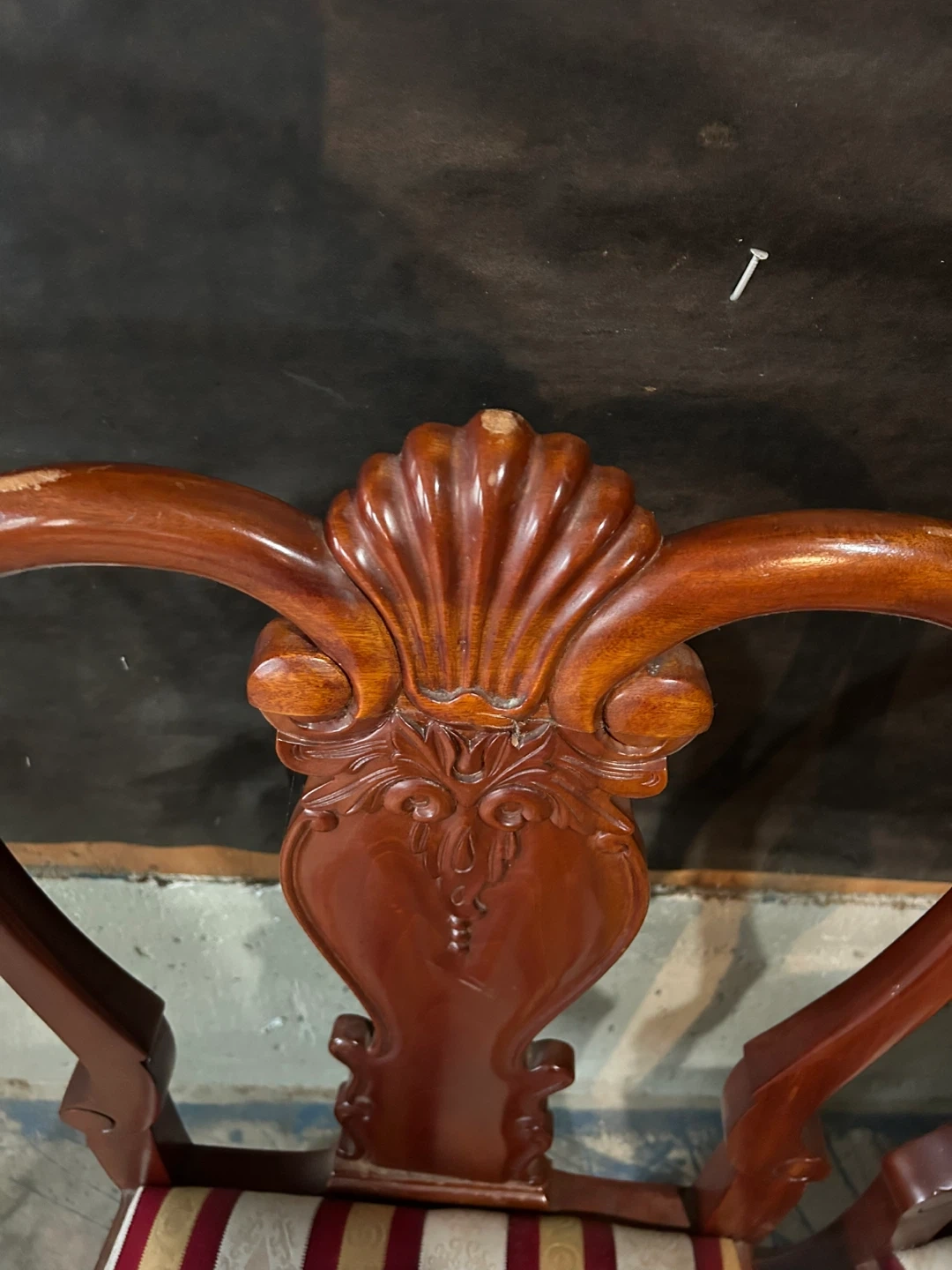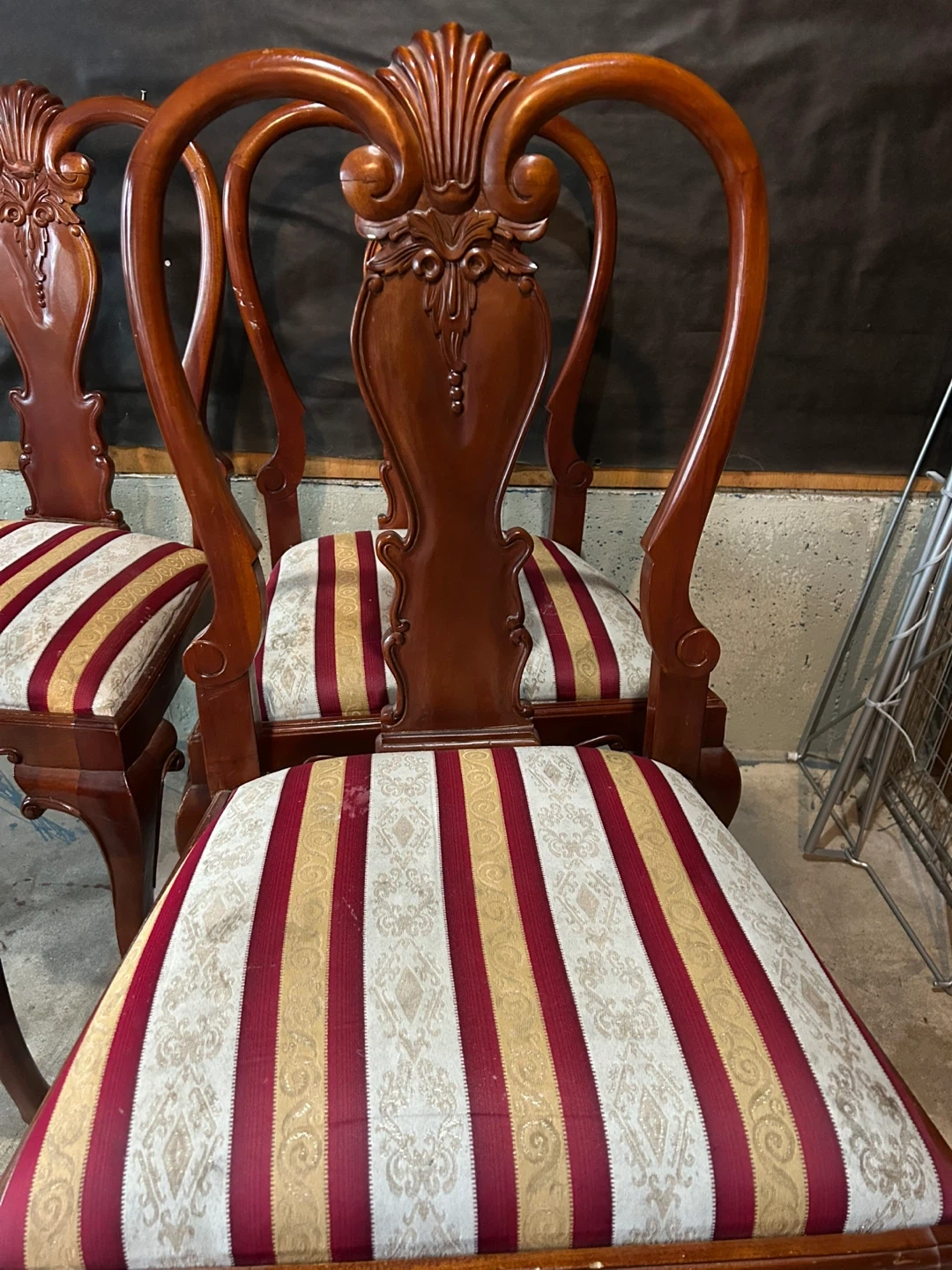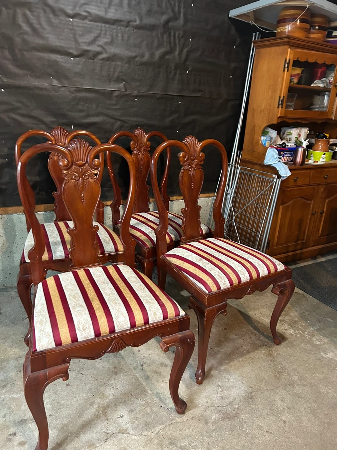 Selling a set of four wooden dining chairs with a unique shell-shaped back design. They have striped seats in cream, red, and gold. Perfect for adding a touch of elegance to your dining space! They do have some minor scratches use them as they are or this could be your next project.