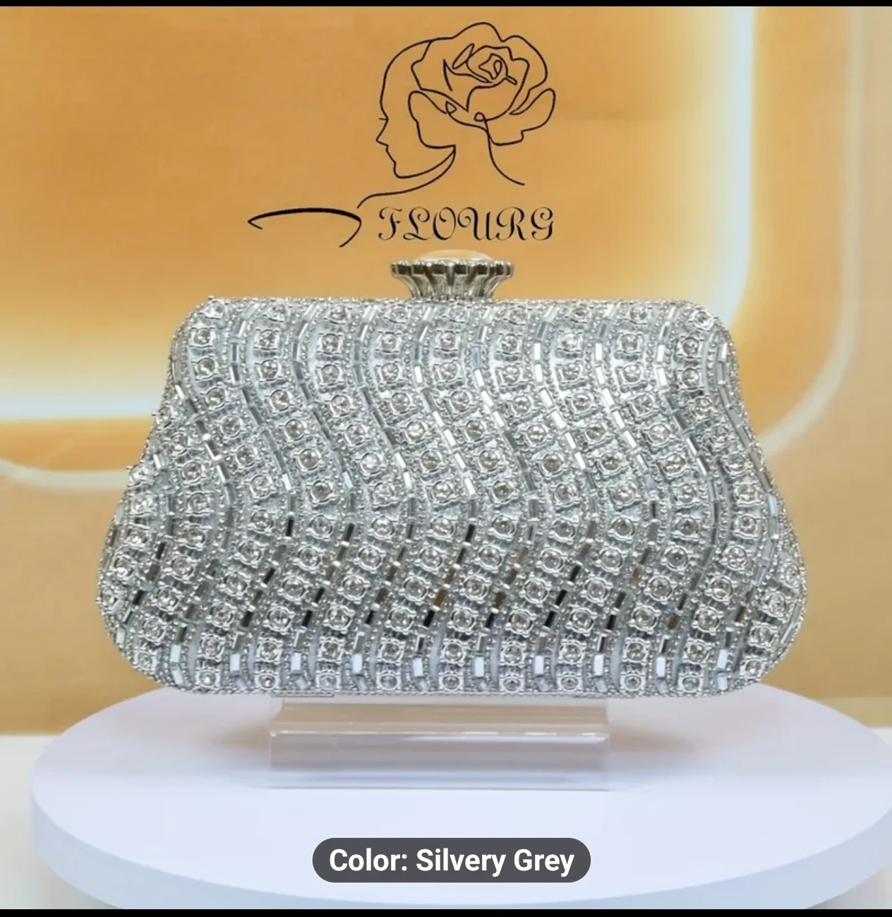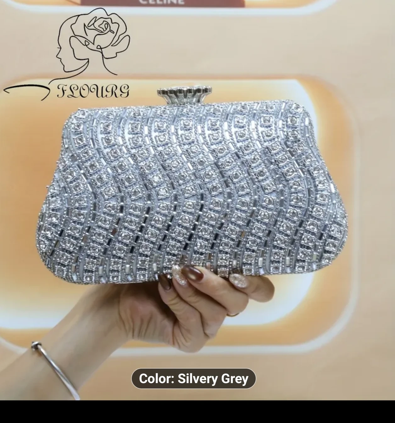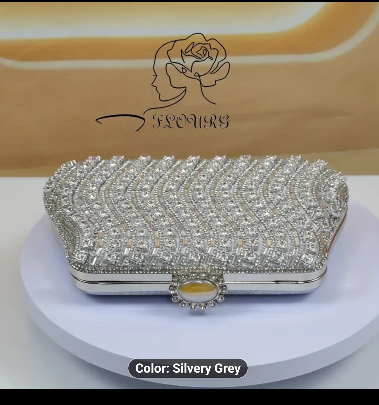 This Flours clutch is a beautiful silvery grey colour and covered in rhinestones! It's perfect for a night out or special occasion. The dimensions are approximately 8.26 inches in length, 4.92 inches in height, and 1.96 inches in width. Location Cambridge Last Minute Gift Ideas