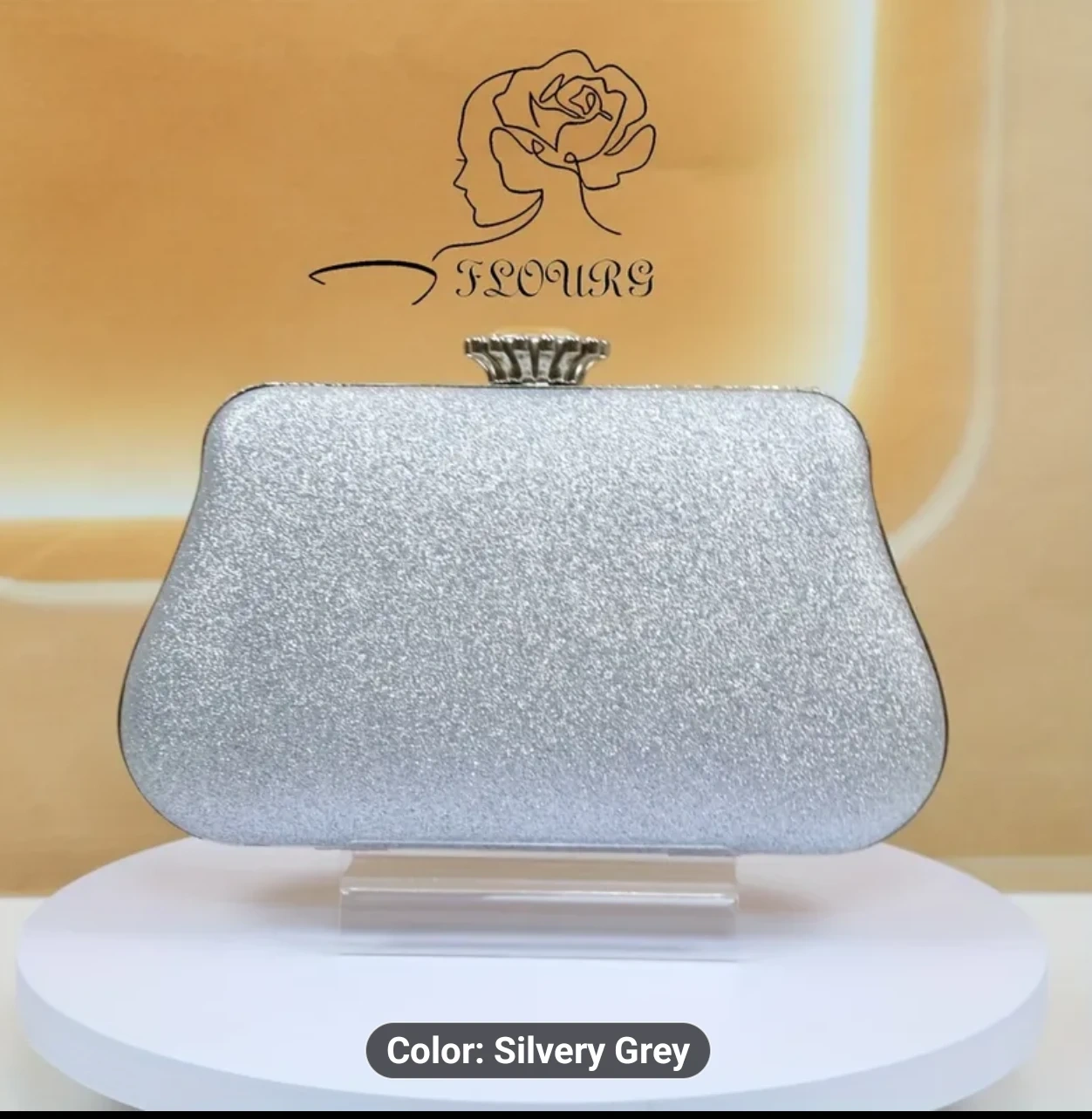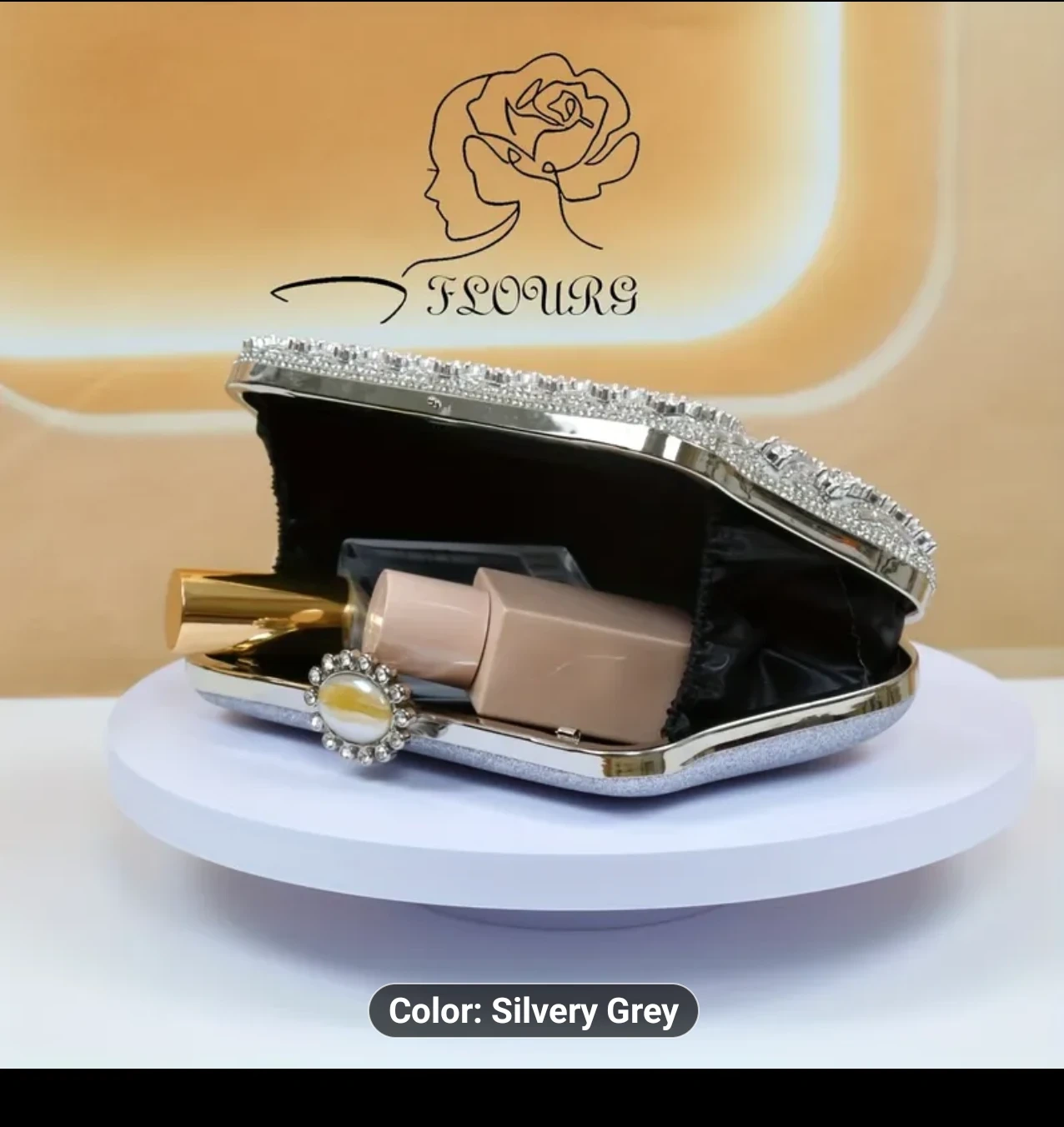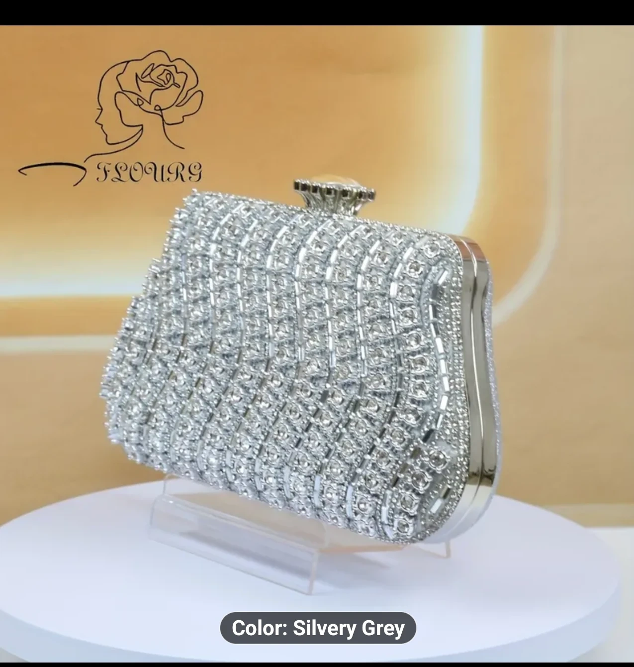 This Flours clutch is a beautiful silvery grey colour and covered in rhinestones! It's perfect for a night out or special occasion. The dimensions are approximately 8.26 inches in length, 4.92 inches in height, and 1.96 inches in width. Location Cambridge Last Minute Gift Ideas