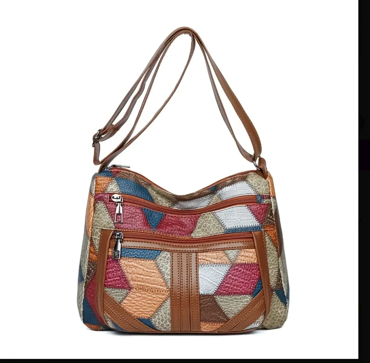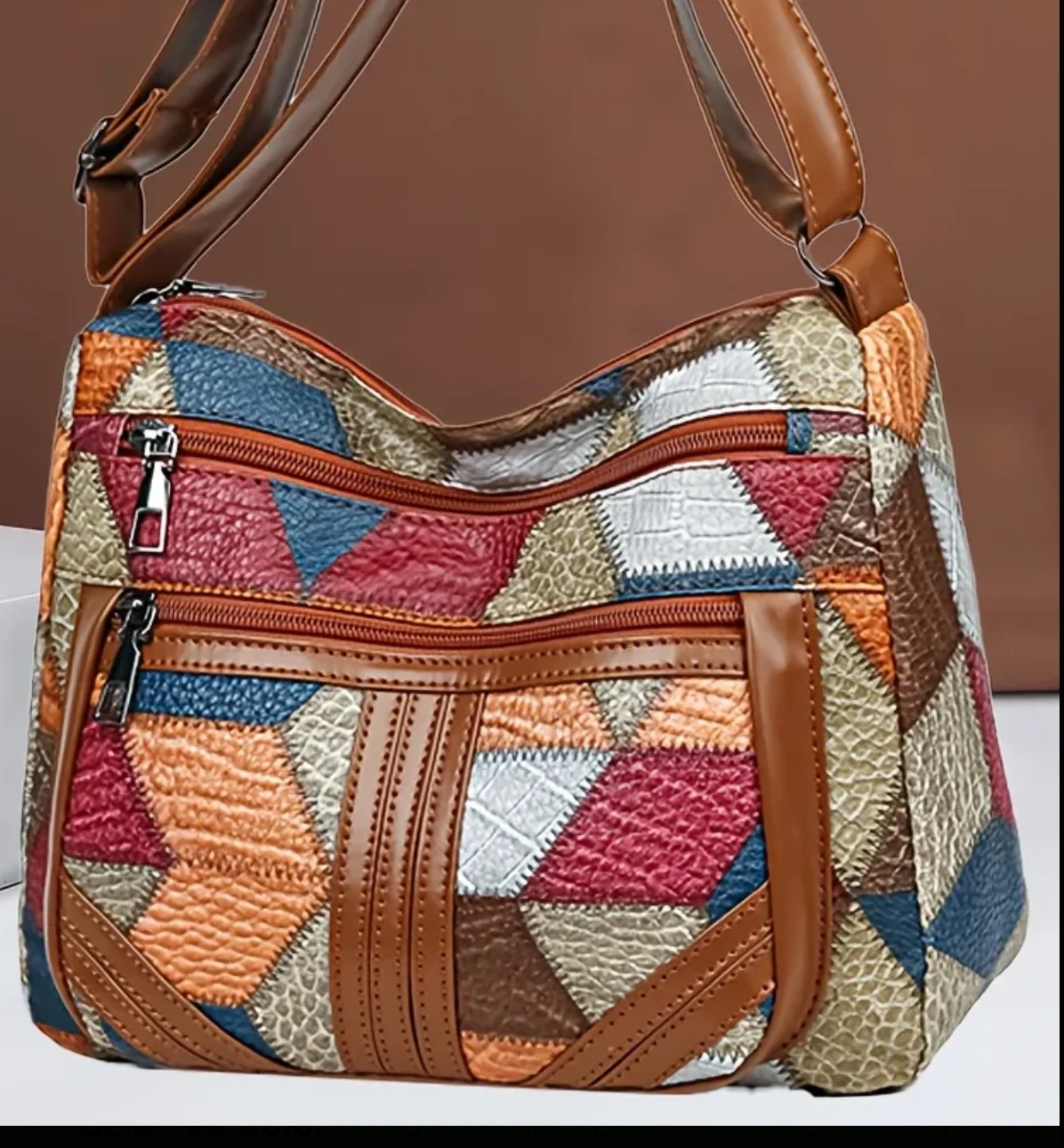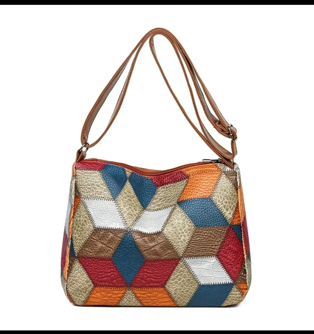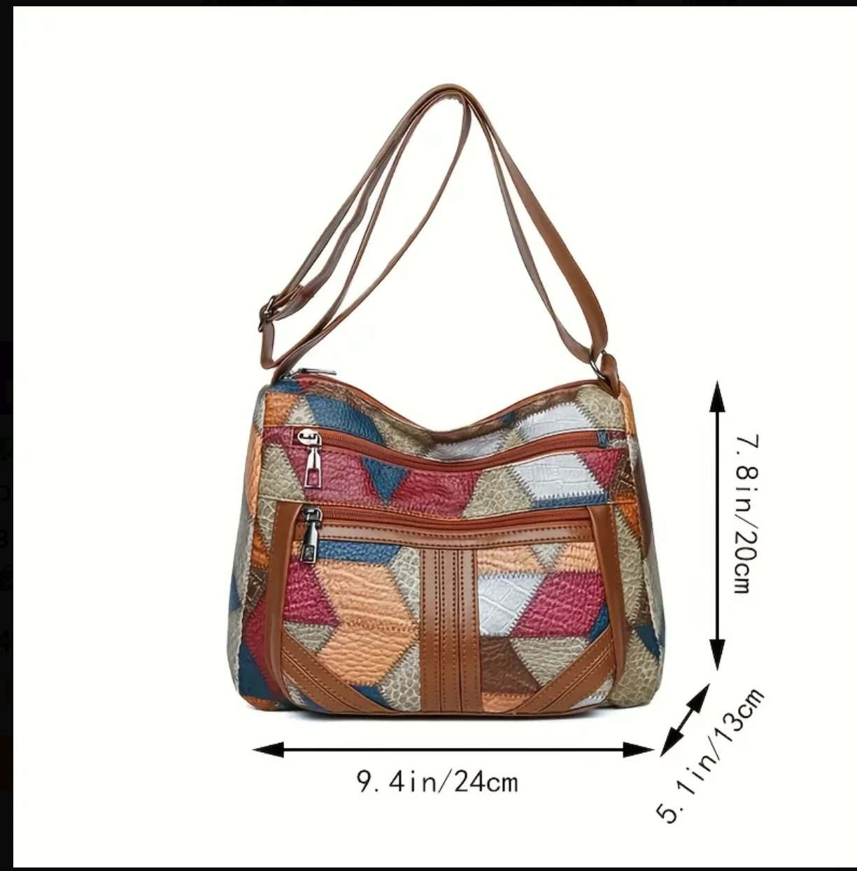 This is a very cute patchwork leather shoulder bag in excellent condition! It has a brown strap and zipper and has a colourful geometric design. The bag measures 9.4 inches in length, 7.8 inches in height, and 5.1 inches in width.